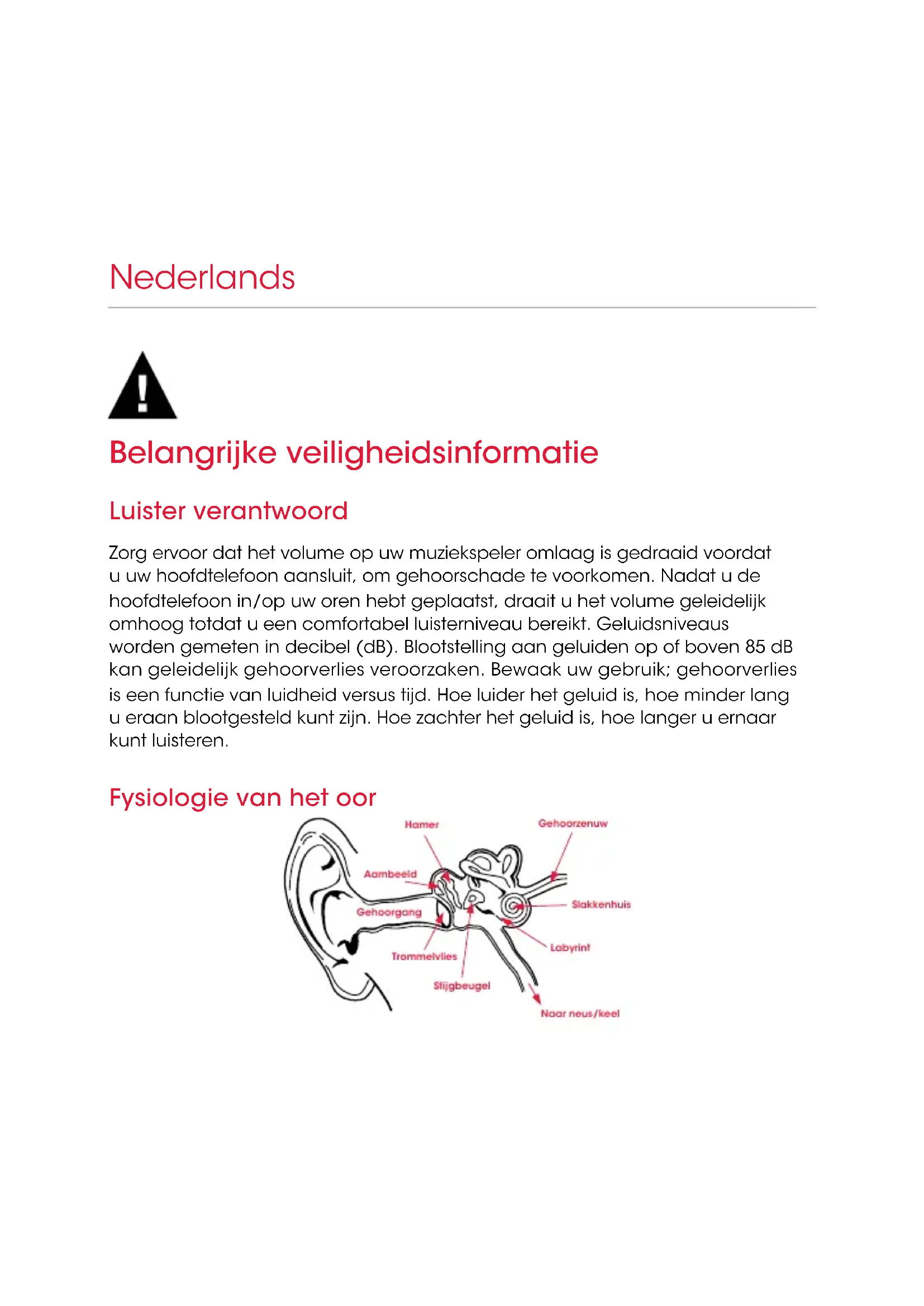 Nein DeutschBelangrijke veiligheidsinformatie Luister verantwoord Zorg ervoor dat het volume op uw muziekspeler omlaag is gedraaid voordat u uw hoofdtelefoon aansluit, om gehoorschade te voorkomen. Nadat u de hoofdtelefoon in/op uw oren hebt geplaatst, draait u het volume geleidelijk omhoog totdat u een comfortabel luisterniveau bereikt. Geluidsniveaus worden gemeten in decibel (dB). Blootstelling aan geluiden op of boven 85 dB kan geleidelijk gehoorverlies veroorzaken. Bewaak uw gebruik; gehoorverlies is een functie van luidheid versus tijd. Hoe luider het geluid is, hoe minder lang u eraan blootgesteld kunt zijn. Hoe zachter het geluid is, hoe langer u ernaar kunt luisteren. Fysiologie van het oor Nederlands Hamer Gehoorzenuw Stijgbeugel Trommelvlies Gehoorgang Slakkenhuis Aambeeld Labyrint Naar neus/keel54 GELUID GELUIDS- NIVEAU (dB) EFFECT Fluisteren 30 Zeer stil Stil kantoor 50-60 Comfortabele luisterniveaus zijn lager dan60 dB Stofzuiger, haardroger 70 Indringend; hindert telefoongesprekken Keukenmachine 85-90 85dB is het niveau waarop gehoorschade (8 uur) begint Vuilniswagen, cementmolen 100 Niet meer dan 15 minuten onbeschermde blootstelling aangeraden voor geluiden tussen 90-100dB Cirkelzaag, drilboor/ pneumatische boor 110 Regelmatige blootstelling aan geluid boven 100dB langer dan 1minuut geeft risico op permanent gehoorverlies Rockconcert (wisselend) 110 -14 0 De pijngrens begint rond 125dB
