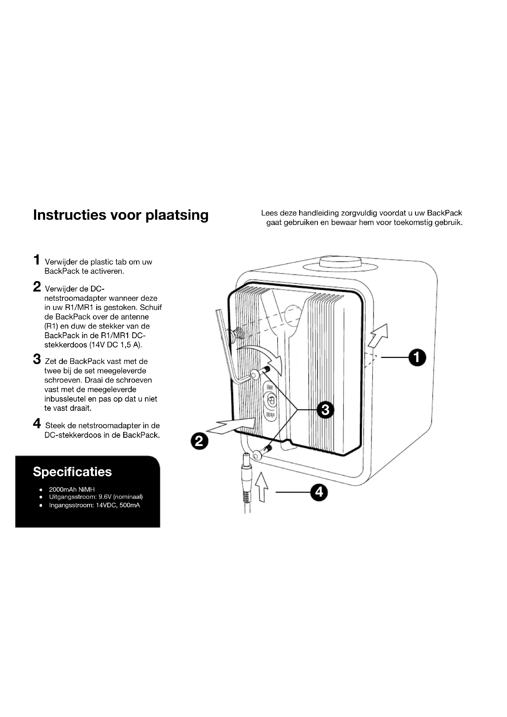2 Verwijder de DC-netstroomadapter wanner deze in uw R1/MR1 is gestoken. Schuif de Backpack over de antennae (R1) en duw de stekker van de Backpack in de R1/MR1 DC-stekkerdoos (14V DC 1,5 A).