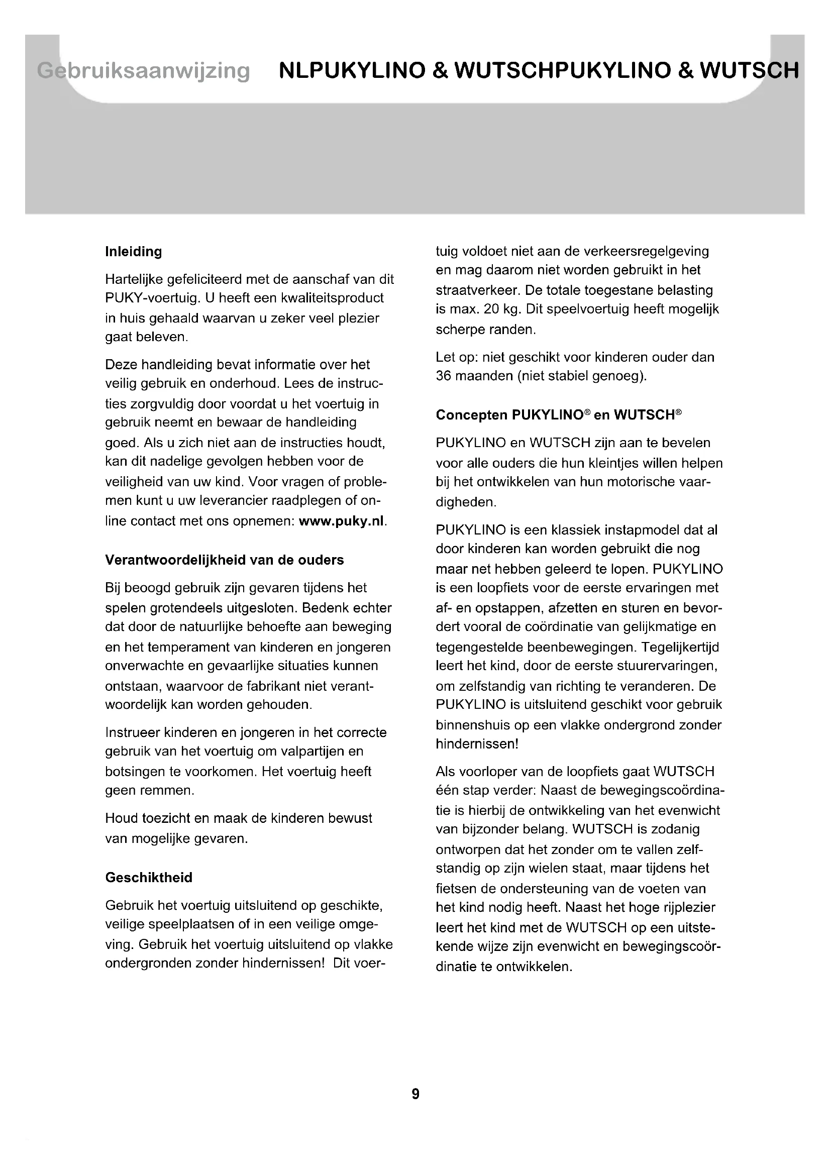 Small parts which are required during assem- bly (e.g. screws and washers) must be kept out of the reach of small children. There is a danger of suffocation as a result of swallowing the parts. Also keep all packaging material out of reach of children. The bike must be assembled with great cau- tion and by an adult to avoid any potential sub- sequent accidents or injuries. Please take a sufficient amount of time to assemble the bike. Several assembly steps require manual skill and practice in handling tools (e.g. spanner). Please contact your dealer or a workshop if you have any questions. In some cases, it is necessary to tighten screws with a prescribed torque. This torque value is stated in Newtons (e.g. 2 Nm). If the torque with which a screw is tightened is too low, the connection may still be too loose and therefore unsafe. If the torque is too high, screws and other parts may be damaged or destroyed. Figure 1: Remove the washer (!) from the transportation lock by loosening the screw connection. Figure 2: Slide the steering tube onto the fork shaft, until it reaches the stop. Make sure that the steering head is aligned correctly (!) Add the washer. Figure 3: Slide the handlebar all the way onto the fork shaft, and tighten the screw. Align the slot in the handlebar with the rear (!) Firmly press down on the spherical cap until it snaps into position. Figure 4: Attach the seat to the frame and screw on.9 Gebruiksaanwijzing NLPUKYLINO & WUTSCHPUKYLINO & WUTSCH Inleiding Hartelijke gefeliciteerd met de aanschaf van dit PUKY-voertuig. U heeft een kwaliteitsproduct in huis gehaald waarvan u zeker veel plezier gaat beleven. Deze handleiding bevat informatie over het veilig gebruik en onderhoud. Lees de instruc- ties zorgvuldig door voordat u het voertuig in gebruik neemt en bewaar de handleiding goed. Als u zich niet aan de instructies houdt, kan dit nadelige gevolgen hebben voor de veiligheid van uw kind. Voor vragen of proble- men kunt u uw leverancier raadplegen of on- line contact met ons opnemen: www.puky.nl. Verantwoordelijkheid van de ouders Bij beoogd gebruik zijn gevaren tijdens het spelen grotendeels uitgesloten. Bedenk echter dat door de natuurlijke behoefte aan beweging en het temperament van kinderen en jongeren onverwachte en gevaarlijke situaties kunnen ontstaan, waarvoor de fabrikant niet verant- woordelijk kan worden gehouden. Instrueer kinderen en jongeren in het correcte gebruik van het voertuig om valpartijen en botsingen te voorkomen. Het voertuig heeft geen remmen. Houd toezicht en maak de kinderen bewust van mogelijke gevaren. Geschiktheid Gebruik het voertuig uitsluitend op geschikte, veilige speelplaatsen of in een veilige omge- ving. Gebruik het voertuig uitsluitend op vlakke ondergronden zonder hindernissen! Dit voer- tuig voldoet niet aan de verkeersregelgeving en mag daarom niet worden gebruikt in het straatverkeer. De totale toegestane belasting is max. 20 kg. Dit speelvoertuig heeft mogelijk scherpe randen. Let op: niet geschikt voor kinderen ouder dan 36 maanden (niet stabiel genoeg). Concepten PUKYLINO