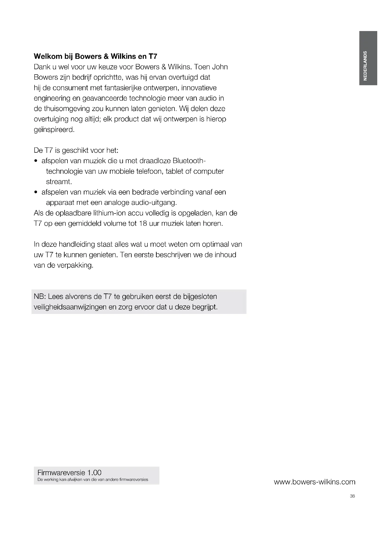 NEDERLANDS www.bowers-wilkins.com Welkom bij Bowers & Wilkins en T7 Dank u wel voor uw keuze voor Bowers & Wilkins. Toen John Bowers zijn bedrijf oprichtte, was hij ervan overtuigd dat hij de consument met fantasierijke ontwerpen, innovatieve engineering en geavanceerde technologie meer van audio in de thuisomgeving zou kunnen laten genieten. Wij delen deze overtuiging nog altijd; elk product dat wij ontwerpen is hierop geïnspireerd. De T7 is geschikt voor het: