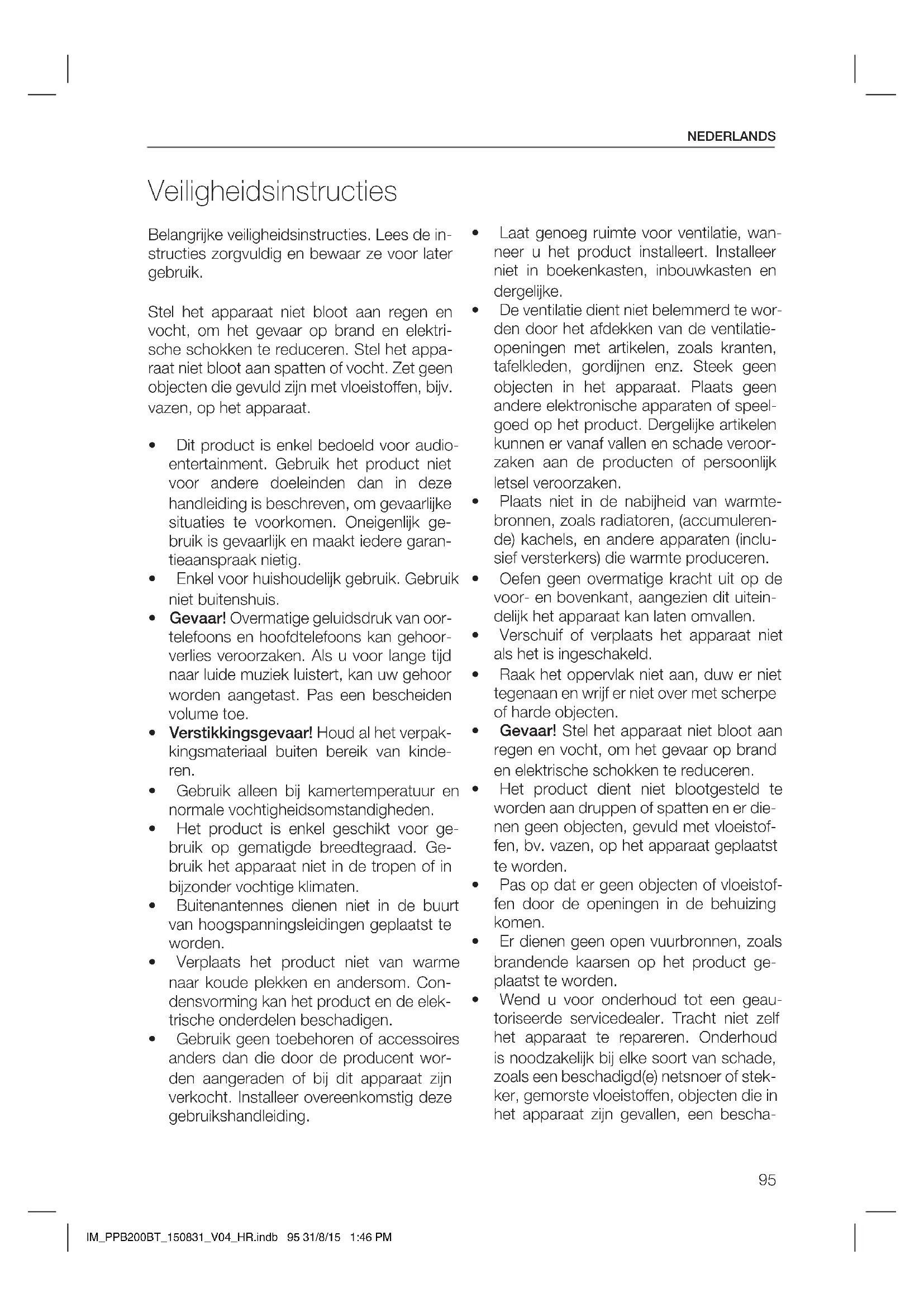 : V3.0+EDR Dimensioni (L x H x P) : 424 x 127 x 100 mm Peso : 1750 g Caratteristiche IM_PPB200BT_150831_V04_HR.indb 94 31/8/15 1:46 PM95 NEDERLANDS Veiligheidsinstructies Belangrijke veiligheidsinstructies. Lees de in- structies zorgvuldig en bewaar ze voor later gebruik. Stel het apparaat niet bloot aan regen en vocht, om het gevaar op brand en elektri- sche schokken te reduceren. Stel het appa- raat niet bloot aan spatten of vocht. Zet geen objecten die gevuld zijn met vloeistoen, bijv. vazen, op het apparaat.