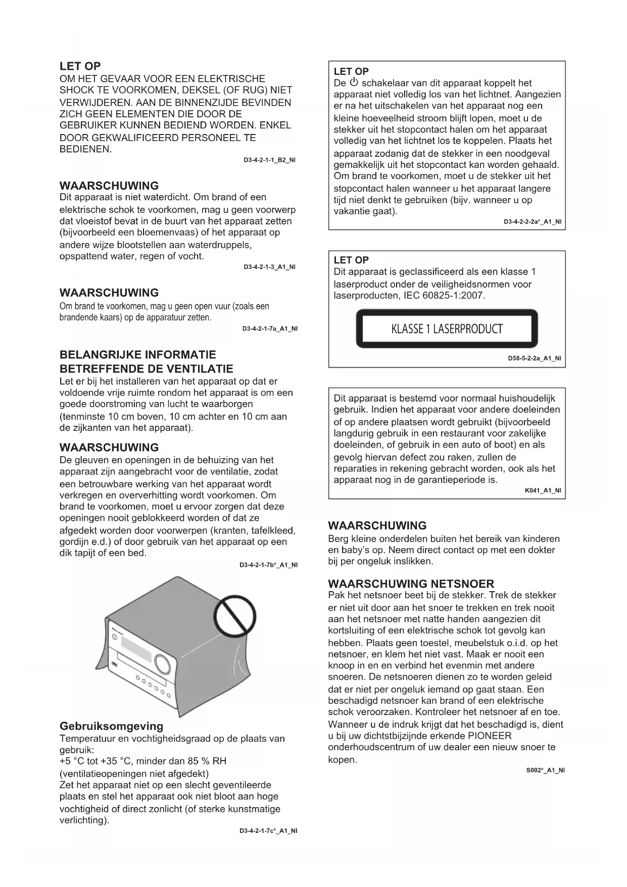 Let er bij het installeren van het apparaat op dat er voldoende vrije ruimte rondom het apparaat is om een goede doorstroming van lucht te waarborgen (tenminste 10 cm boven, 10 cm achter en 10 cm aan de zijkanten van het apparaat). WAARSCHUWING De gleuven en openingen in de behuizing van het apparaat zijn aangebracht voor de ventilatie, zodat een betrouwbare werking van het apparaat wordt verkregen en oververhitting wordt voorkomen. Om brand te voorkomen, moet u ervoor zorgen dat deze openingen nooit geblokkeerd worden of dat ze afgedekt worden door voorwerpen (kranten, tafelkleed, gordijn e.d.) of door gebruik van het apparaat op een dik tapijt of een bed. D3-4-2-1-7b*_A1_Nl Gebruiksomgeving Temperatuur en vochtigheidsgraad op de plaats van gebruik: +5 °C tot +35 °C, minder dan 85 % RH (ventilatieopeningen niet afgedekt) Zet het apparaat niet op een slecht geventileerde plaats en stel het apparaat ook niet bloot aan hoge vochtigheid of direct zonlicht (of sterke kunstmatige verlichting). D3-4-2-1-7c*_A1_Nl LET OP Dit apparaat is geclassificeerd als een klasse 1 laserproduct onder de veiligheidsnormen voor laserproducten, IEC 60825-1:2007. KLASSE 1 LASERPRODUCT D58-5-2-2a_A1_Nl Dit apparaat is bestemd voor normaal huishoudelijk gebruik. Indien het apparaat voor andere doeleinden of op andere plaatsen wordt gebruikt (bijvoorbeeld langdurig gebruik in een restaurant voor zakelijke doeleinden, of gebruik in een auto of boot) en als gevolg hiervan defect zou raken, zullen de reparaties in rekening gebracht worden, ook als het apparaat nog in de garantieperiode is. K041_A1_Nl WAARSCHUWING NETSNOER Pak het netsnoer beet bij de stekker. Trek de stekker er niet uit door aan het snoer te trekken en trek nooit aan het netsnoer met natte handen aangezien dit kortsluiting of een elektrische schok tot gevolg kan hebben. Plaats geen toestel, meubelstuk o.i.d. op het netsnoer, en klem het niet vast. Maak er nooit een knoop in en en verbind het evenmin met andere snoeren. De netsnoeren dienen zo te worden geleid dat er niet per ongeluk iemand op gaat staan. Een beschadigd netsnoer kan brand of een elektrische schok veroorzaken. Kontroleer het netsnoer af en toe. Wanneer u de indruk krijgt dat het beschadigd is, dient u bij uw dichtstbijzijnde erkende PIONEER onderhoudscentrum of uw dealer een nieuw snoer te kopen. S002*_A1_NlLET OP