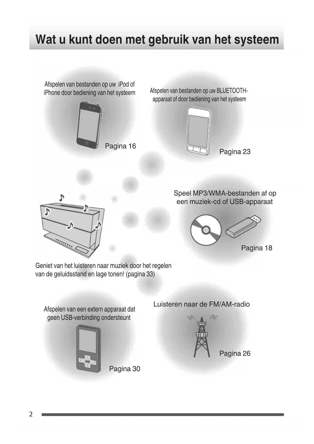 [E]. Luisteren naar de FM/AM-radio Speel MP3/WMA-bestanden af op een muziek-cd of USB-apparaat Afspelen van bestanden op uw BLUETOOTH- apparaat of door bediening van het systeem Afspelen van bestanden op uw iPod of iPhone door bediening van het systeem Afspelen van een extern apparaat dat geen USB-verbinding ondersteunt Geniet van het luisteren naar muziek door het regelen van de geluidsstand en lage tonen! (pagina 33) Pagina 30 Pagina 26 Pagina 18 Pagina 23 Pagina 16