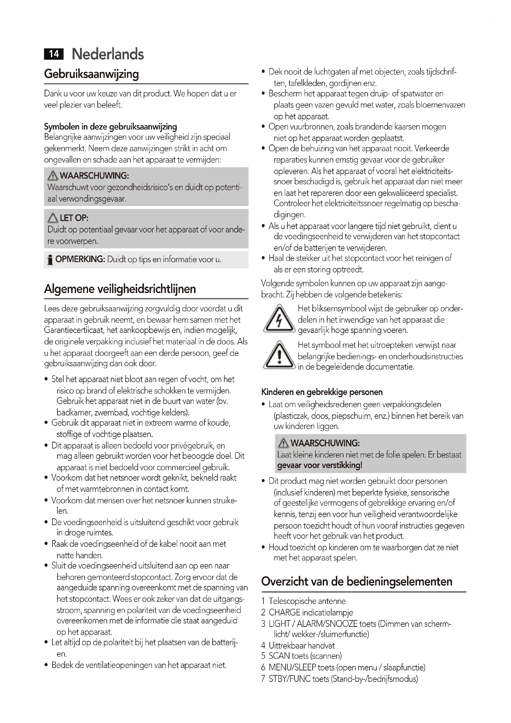 - Houd toezicht op kinderen om te waarborgen dat ze niet met het apparaat spelen. Overzicht van de bedieningselementen 1 Telescopische antenne 2 CHARGE indicatielampje 3 LIGHT / ALARM/SNOOZE toets (Dimmen van scherm- licht/ wekker-/sluimerfunctie) 4 Uittrekbaar handvat 5 SCAN toets (scannen) 6 MENU/SLEEP toets (open menu / slaapfunctie) 7 STBY/FUNC toets (Stand-by-/bedrijfsmodus)Nederlands