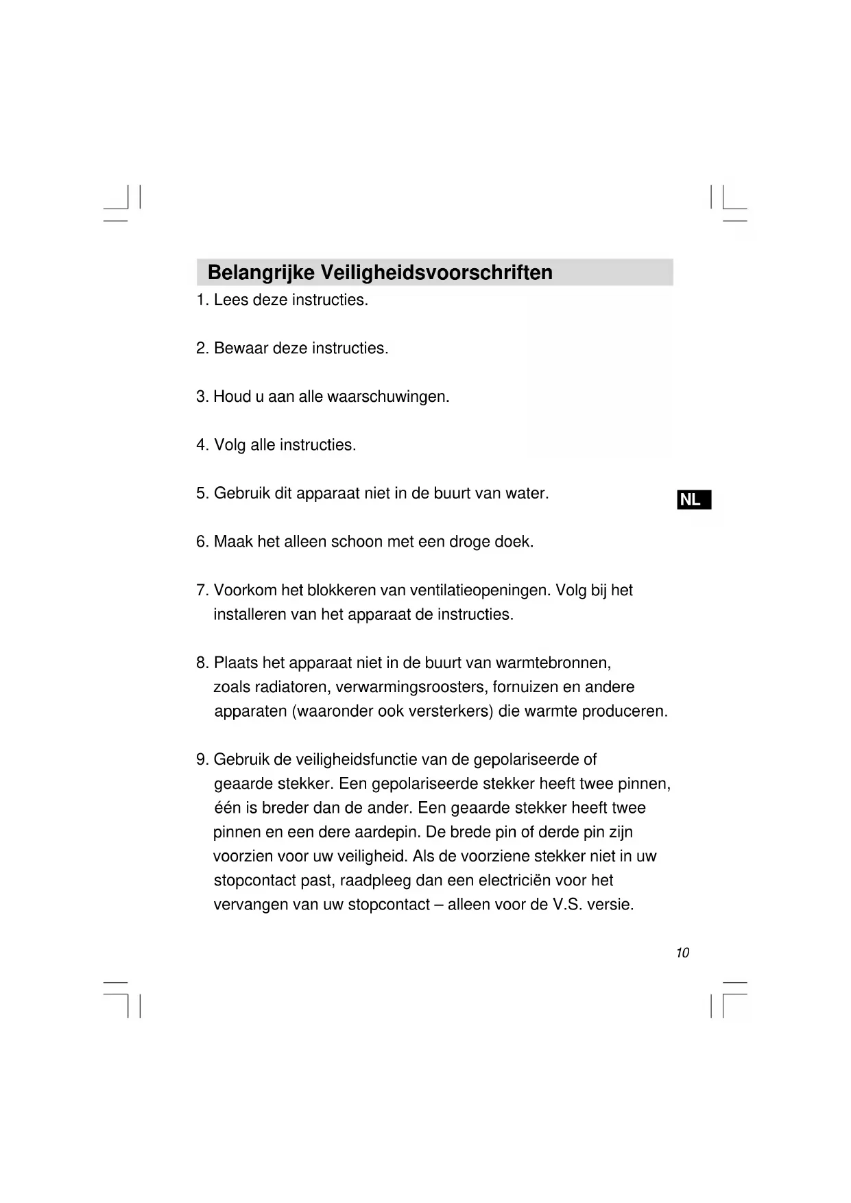 geaarde stekker. Een gepolariseerde stekker heeft twee pinnen, één is breder dan de ander. Een geaarde stekker heeft twee pinnen en een dere aardepin. De brede pin of derde pin zijn voorzien voor uw veiligheid. Als de voorziene stekker niet in uw stopcontact past, raadpleeg dan een electriciën voor het vervangen van uw stopcontact – alleen voor de V.S. versie.11