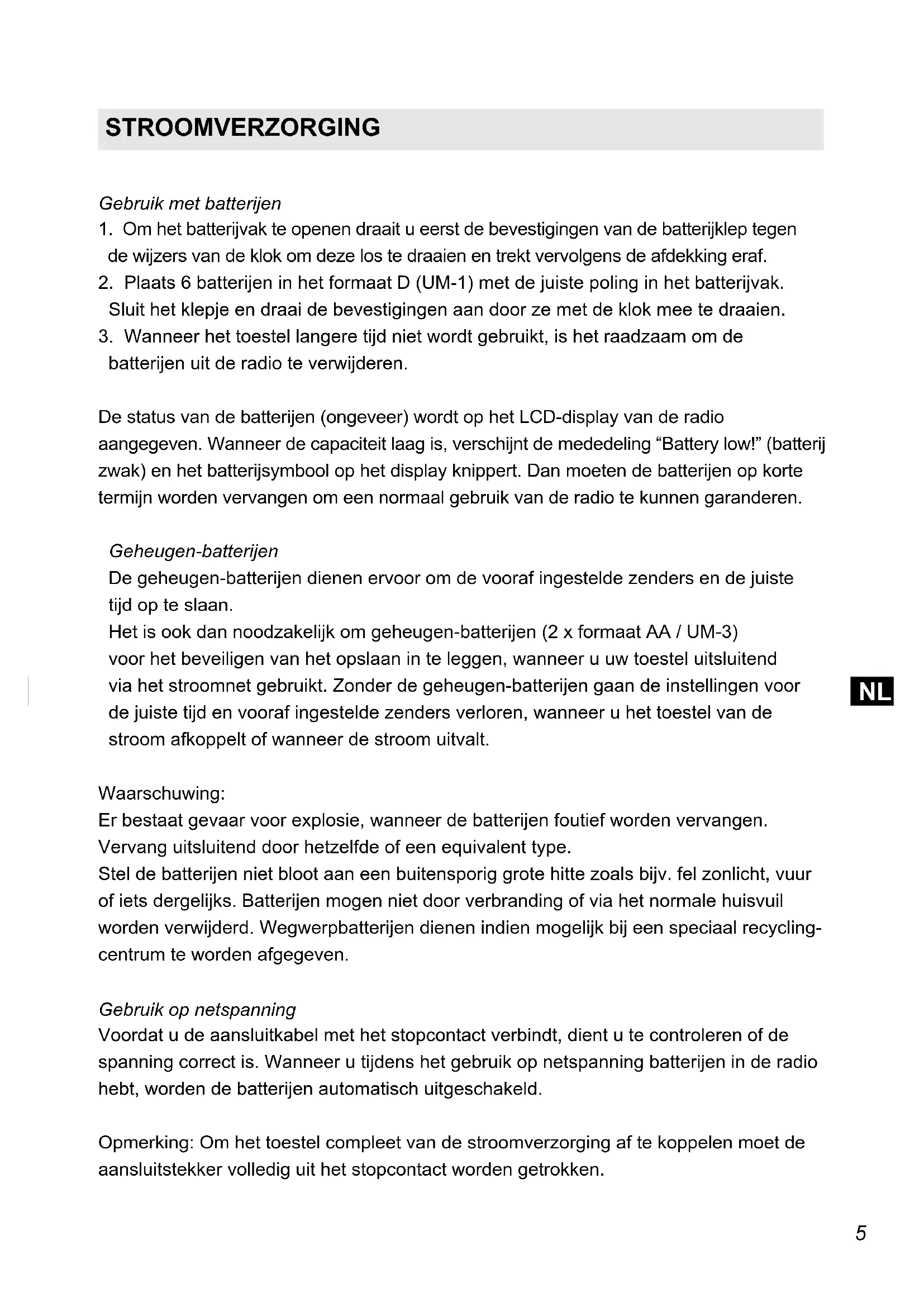 batterijen uit de radio te verwijderen. De status van de batterijen (ongeveer) wordt op het LCD-display van de radio aangegeven. Wanneer de capaciteit laag is, verschijnt de mededeling “Battery low!” (batterij zwak) en het batterijsymbool op het display knippert. Dan moeten de batterijen op korte termijn worden vervangen om een normaal gebruik van de radio te kunnen garanderen. Geheugen-batterijen De geheugen-batterijen dienen ervoor om de vooraf ingestelde zenders en de juiste tijd op te slaan. Het is ook dan noodzakelijk om geheugen-batterijen (2 x formaat AA / UM-3) voor het beveiligen van het opslaan in te leggen, wanneer u uw toestel uitsluitend via het stroomnet gebruikt. Zonder de geheugen-batterijen gaan de instellingen voor de juiste tijd en vooraf ingestelde zenders verloren, wanneer u het toestel van de stroom afkoppelt of wanneer de stroom uitvalt. Waarschuwing: Er bestaat gevaar voor explosie, wanneer de batterijen foutief worden vervangen. Vervang uitsluitend door hetzelfde of een equivalent type. Stel de batterijen niet bloot aan een buitensporig grote hitte zoals bijv. fel zonlicht, vuur of iets dergelijks. Batterijen mogen niet door verbranding of via het normale huisvuil worden verwijderd. Wegwerpbatterijen dienen indien mogelijk bij een speciaal recycling- centrum te worden afgegeven. Gebruik op netspanning Voordat u de aansluitkabel met het stopcontact verbindt, dient u te controleren of de spanning correct is. Wanneer u tijdens het gebruik op netspanning batterijen in de radio hebt, worden de batterijen automatisch uitgeschakeld. Opmerking: Om het toestel compleet van de stroomverzorging af te koppelen moet de aansluitstekker volledig uit het stopcontact worden getrokken.
