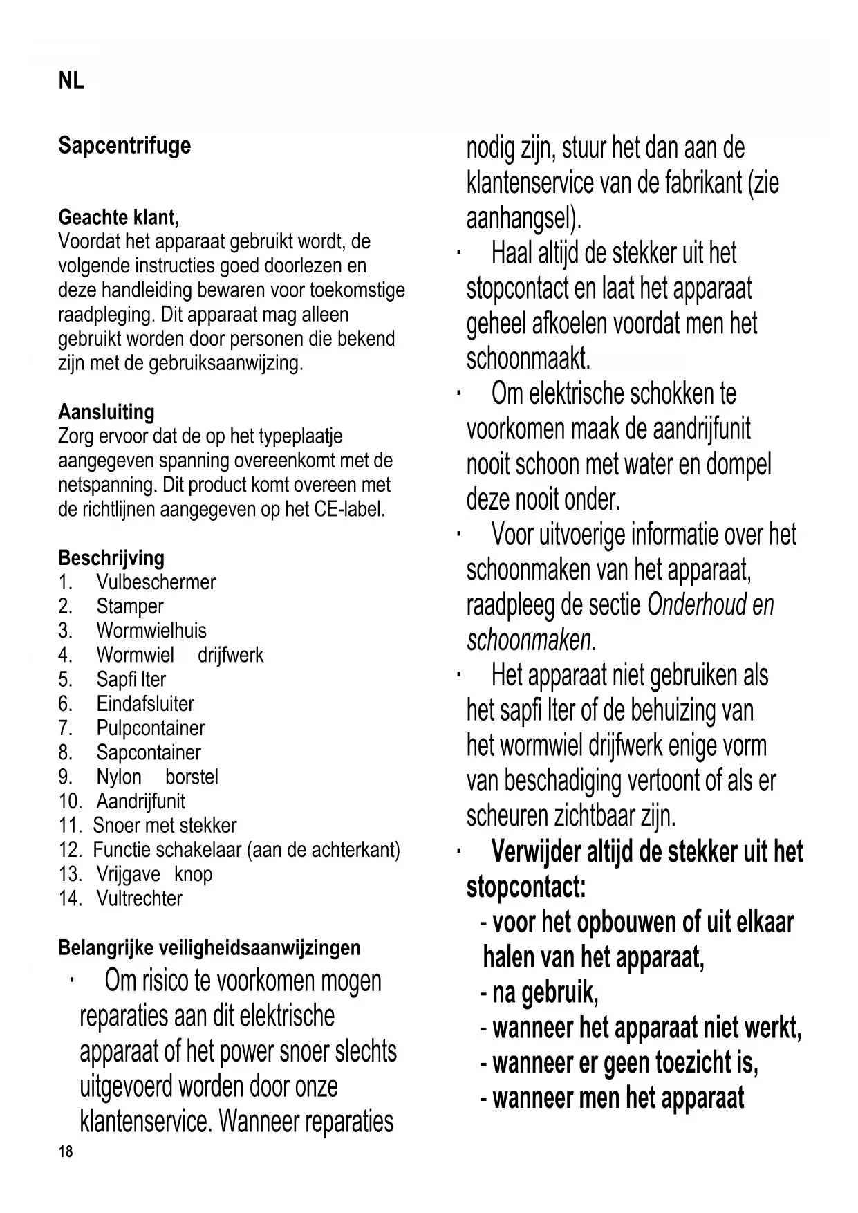 Belangrijke veiligheidsaanwijzingen ∙ Om risico te voorkomen mogen reparaties aan dit elektrische apparaat of het power snoer slechts uitgevoerd worden door onze klantenservice. Wanneer reparaties nodig zijn, stuur het dan aan de klantenservice van de fabrikant (zie aanhangsel). ∙ Haal altijd de stekker uit het stopcontact en laat het apparaat geheel afkoelen voordat men het schoonmaakt. ∙ Om elektrische schokken te voorkomen maak de aandrijfunit nooit schoon met water en dompel deze nooit onder. ∙ Voor uitvoerige informatie over het schoonmaken van het apparaat, raadpleeg de sectie Onderhoud en schoonmaken. ∙ Het apparaat niet gebruiken als het sapfi lter of de behuizing van het wormwiel drijfwerk enige vorm van beschadiging vertoont of als er scheuren zichtbaar zijn. ∙ Verwijder altijd de stekker uit het stopcontact: - voor het opbouwen of uit elkaar halen van het apparaat, - na gebruik, - wanneer het apparaat niet werkt, - wanneer er geen toezicht is, - wanneer men het apparaat NL19 schoonmaakt. ∙ Waarschuwing: Verkeert gebruik van dit apparaat kan persoonlijk letsel veroorzaken. ∙ Dit apparaat is bestemd voor huishoudelijk of gelijkwaardig gebruik, zoals - door personeel in winkels, kantoren en andere soortgelijke werkomgevingen, - in agrarische instellingen, - door klanten in hotels, motels enz. en gelijkwaardige accommodaties, - in bed and breakfast gasthuizen. ∙ Het apparaat mag alleen gebruikt worden door personen met verminderde fysische, zintuigelijke of mentale bekwaamheden, of gebrek van ervaring en kennis, wanneer deze onder begeleiding zijn of instructies ontvangen hebben over het gebruik van dit apparaat en volledig de gevaren en veiligheidsvoorschriften begrijpen. ∙ Kinderen mogen niet dit apparaat gebruiken. Het apparaat en het powersnoer moeten goed weggehouden worden van kinderen. ∙ Kinderen mogen niet met het apparaat spelen. ∙ Waarschuwing: Houdt kinderen weg van inpakmateriaal, daar deze een bron van gevaar zijn b.v. door verstikking. ∙ Voordat het apparaat wordt gebruikt moet zowel de hoofdeenheid inclusief het powersnoer als gelijk welk hulpstuk, dat wordt aangebracht, eerst zorgvuldig op eventuele defecten worden gecontroleerd. Ingeval het apparaat, bijvoorbeeld, op een hard oppervlak is gevallen, of wanneer men met overdadige kracht aan het power snoer getrokken heeft, mag men het niet meer gebruiken: zelfs onzichtbare beschadiging kan ongewenste effecten hebben op de gebruiksveiligheid van het apparaat. ∙ Laat het apparaat nooit onbeheerd wanneer het is aangesloten op het stroomnet. ∙ Gebruik altijd de stamper om de ingrediënten in de vultrechter te stoppen. Gebruik nooit je handen. ∙ Na het uitschakelen blijft de motor nog even doordraaien. Wacht altijd totdat de motor volledig tot stilstand is gekomen voordat het apparaat opengemaakt wordt. ∙ Zorg ervoor dat het apparaat en het snoer niet in aanraking komen met een hete ondergrond of andere hittebronnen. ∙ Trek de stekker niet aan het snoer uit het stopcontact, trek aan de stekker zelf. Laat het snoer nooit los hangen. ∙ Wordt dit apparaat op een verkeerde manier gebruikt of worden de veiligheidsregels niet gevolgd, dan kan de fabrikant niet aansprakelijk worden gesteld voor eventuele schades.20 Handige tips voor sapextractie ∙ Bijna alle gewone soorten fruit zijn geschikt voor sapextractie zoals appels, peren, pruimen, aardbeien, druiven, sinaasappels, meloenen, kiwi’s, ananas, mango’s en papaja’s. ∙ De volgende groenten zijn ook geschikt voor effi ciënte sapextractie: wortelen, koolraap, selderij of komkommer. Echter kunnen spinazie, rucola of verschillende soorten sla ook verwerkt worden. ∙ Appels, wortelen, komkommer en selderij, produceren onder andere een vitaliserende sap. ∙ Een heerlijke ontbijt sap kan gemaakt worden van grapefruits, wortelen en appels. ∙ Bananen zijn niet geschikt voor sapextractie omdat zij maar een heel klein beetje sap bevatten. ∙ Na het schoonmaken, het fruit of de groenten in grove stukken snijden en eventuele steentjes, klokhuizen of zaadjes verwijderen om schade aan het apparaat te voorkomen. ∙ Om sapextractie te vergemakkelijken moet hard fruit en groeten zoals wortelen, venkel of koolraap in kleinere stukken gesneden worden. Gebruik voor korte tijd Dit apparaat is alleen bedoeld voor kortstondig gebruik, d.w.z. dat hij niet langer dan 10 minuten continu gebruikt mag worden. Laat hem daarna gedurende nog eens 10 minuten afkoelen, waarna hij weer gebruikt mag worden. Thermische veiligheidsuitschakeling Het apparaat heeft een geïntegreerde veiligheidsuitschakeling wat het tegen oververhitten zal beschermen. Wanneer de veiligheidsuitschakeling geactiveerd is, moet men het apparaat tot kamertemperatuur laten afkoelen voordat men het weer aanzet. Voor het eerste gebruik Wanneer men het apparaat voor de eerste keer gebruikt moet het eerst schoongemaakt worden zoals wordt omschreven in de sectie Onderhoud en schoonmaken. Schakelaar Het apparaat is uitgerust met een functieschakelaar. 0 apparaat uitgeschakeld ON normale werking R omgekeerde werking Gebruik ∙ Monteer het wormwielhuis dusdanig aan de aandrijfunit dat het pijl symbool op de behuizing van het wormwiel in lijn staat met het geopende slot symbool op het apparaat. ∙ Draai deze dan linksom om te vergrendelen zodat de pijl tegenover het gesloten slot symbool staat. ∙ Schuif het wormwiel drijfwerk helemaal in het wormwielhuis; indien nodig, het wormwiel drijfwerk enigszins verdraaien. ∙ Plaats het sapfi lter met de brede kant eerst op het wormwiel drijfwerk en druk deze er zachtjes op. ∙ Bevestig de eindafsluiter en draai deze naar links om hem vast te zetten. ∙ Monteer de vulbeschermer op vultrechter. ∙ Plaats de sapcontainer onder de sap uitgang aan de onderkant van de behuizing van het wormwiel drijfwerk. ∙ Plaats de pulpcontainer onder de pulp afvoer opening van de eindafsluiter.21 ∙ Steek de stekker in het stopcontact. ∙ Zet de schakelaar in
