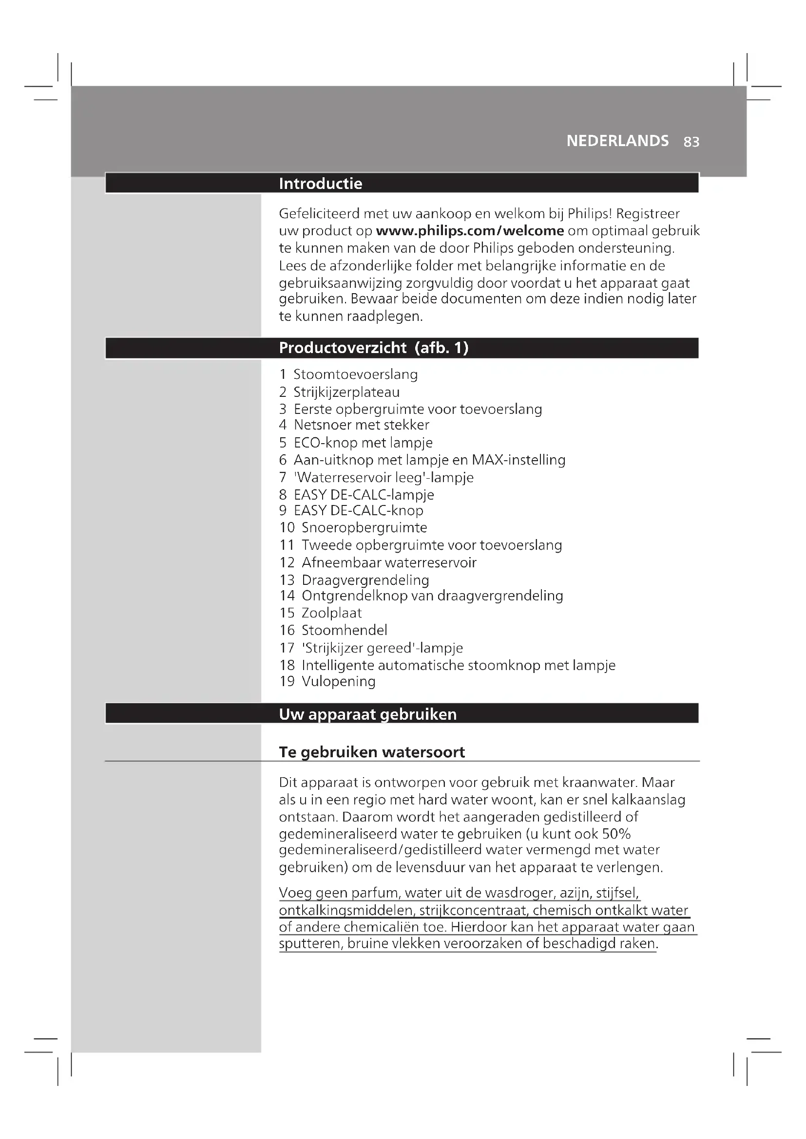 CALCARE").82 ITALIANO Problema Possibilecausa Soluzione Il ferro lascia un'impronta o una traccia lucida sui tessuti stirati. La supercie da stirare era irregolare, come nel caso di una cucitura o di una piega dell'indumento. PerfectCare è sicuro su tutti i capi. L'eetto lucido o l'impronta non sono permanenti e scompariranno lavando l'indumento. Evitare di stirare sopra le cuciture o le pieghe oppure posizionare un panno di cotone sull'area da stirare per evitare impronte in corrispondenza delle cuciture e delle pieghe. L'apparecchio non produce vapore. Il serbatoio dell'acqua non contiene abbastanza acqua (la spia "serbatoio dell'acqua vuoto" lampeggia). Riempire il serbatoio dell'acqua (vedere il capitolo "Utilizzo dell'apparecchio", sezione "Riempimento del serbatoio dell'acqua"). L'apparecchio non è abbastanza caldo per produrre vapore. Attendere che la spia "ferro pronto"sul ferro da stiro si accenda con luce ssa. Non è stato premuto il pulsante del vapore. Tenere premuto il pulsante del vapore durante la stiratura. Il serbatoio dell'acqua non è inserito correttamente nell'apparecchio. Reinserire saldamente il serbatoio dell'acqua nell'apparecchio facendolo scattare in posizione. L'apparecchio non è acceso. Inserire la spina nella presa a muro e premere il pulsante on/o per accendere l'apparecchio. L'apparecchio si è spento. La spia del pulsante on/o lampeggia. La funzione di spegnimento automatico si attiva automaticamente quando l'apparecchio non viene utilizzato per più di 10 minuti. Premere il pulsante on/o per accendere nuovamente l'apparecchio. L'apparecchio produce un rumore di pompaggio. L'acqua viene pompata nella caldaia all'interno dell'apparecchio. Si tratta di un fenomeno normale. Se il rumore continua incessantemente, spegnere l'apparecchio e rimuovere la spina dalla presa di corrente. Rivolgersi a un centro autorizzato Philips.83 NEDERLANDS Introductie Gefeliciteerd met uw aankoop en welkom bij Philips! Registreer uw product op www.philips.com/welcome om optimaal gebruik te kunnen maken van de door Philips geboden ondersteuning. Lees de afzonderlijke folder met belangrijke informatie en de gebruiksaanwijzing zorgvuldig door voordat u het apparaat gaat gebruiken. Bewaar beide documenten om deze indien nodig later te kunnen raadplegen. Productoverzicht (afb. 1) 1 Stoomtoevoerslang 2 Strijkijzerplateau 3 Eerste opbergruimte voor toevoerslang 4 Netsnoer met stekker 5 ECO-knop met lampje 6 Aan-uitknop met lampje en MAX-instelling 7 'Waterreservoir leeg'-lampje 8 EASY DE-CALC-lampje 9 EASY DE-CALC-knop 10 Snoeropbergruimte 11 Tweede opbergruimte voor toevoerslang 12 Afneembaar waterreservoir 13 Draagvergrendeling 14 Ontgrendelknop van draagvergrendeling 15 Zoolplaat 16 Stoomhendel 17 'Strijkijzer gereed'-lampje 18 Intelligente automatische stoomknop met lampje 19 Vulopening Uw apparaat gebruiken Te gebruiken watersoort Dit apparaat is ontworpen voor gebruik met kraanwater. Maar als u in een regio met hard water woont, kan er snel kalkaanslag ontstaan. Daarom wordt het aangeraden gedistilleerd of gedemineraliseerd water te gebruiken (u kunt ook 50% gedemineraliseerd/gedistilleerd water vermengd met water gebruiken) om de levensduur van het apparaat te verlengen. Voeg geen parfum, water uit de wasdroger, azijn, stijfsel, ontkalkingsmiddelen, strijkconcentraat, chemisch ontkalkt water of andere chemicaliën toe. Hierdoor kan het apparaat water gaan sputteren, bruine vlekken veroorzaken of beschadigd raken.84 NEDERLANDS Het waterreservoir vullen Vul het waterreservoir voor ieder gebruik of wanneer het ‘Waterreservoir leeg’-lampje knippert. U kunt het waterreservoir op ieder gewenst moment tijdens het gebruik bijvullen. 1 Verwijderhetwaterreservoiruithetapparaatenvulhettot deMAX-aanduidingmetkraanwater. 2 Plaatshetwaterreservoirteruginhetapparaatdoorhet onderstedeeleerstinhetapparaattesteken. 3 Duwhetbovenstedeelvanhetwaterreservoirerintothet vastklikt(‘klik’). 'Waterreservoir leeg'-lampje Wanneer het waterreservoir bijna leeg is, gaat het ‘Waterreservoir leeg’-lampje knipperen. Vul het waterreservoir en druk op de stoomhendel om laat het apparaat weer te laten opwarmen. Wanneer het 'strijkijzer gereed'-lampje continu brandt, kunt u doorgaan met stoomstrijken. OptimalTEMP-technologie De OptimalTEMP-technologie stelt u in staat om alle soorten strijkbare stoen in willekeurige volgorde te strijken zonder de strijktemperatuur aan te passen. Stoen met deze symbolen kunnen worden gestreken. Voorbeelden zijn linnen, katoen, polyester, zijde, wol, viscose en rayon. Stoen met dit symbool zijn niet strijkbaar. Dit zijn bijvoorbeeld synthetische stoen zoals elastaan, stoen waarin elastaan is verwerkt en polyolenen (zoals polypropeen) maar ook afdrukken op kledingstukken.85 NEDERLANDS Tijdens het strijken kunt u het strijkijzer op het strijkijzerplateau of horizontaal op de strijkplank plaatsen. Dankzij de OptimalTEMP- technologie beschadigt de zoolplaat niet de strijkplankhoes. Strijkijzers 1 Plaatsdestoomgeneratoropeenstabiele,vlakke ondergrond. 2 Zorgervoordatervoldoendewaterinhetwaterreservoir zit(zie'Hetwaterreservoirvullen'). 3 Steekdestekkerineengeaardstopcontactendrukop deaan-uitknopomdestoomgeneratorinteschakelen. Hetblauweaan-lampjeophetapparaatenhet'strijkijzer gereed'-lampjebeginnenteknipperenomaantegeven dathetapparaataanhetopwarmenis(ditduurtcirca2 minuten). , Alshetapparaatgereedisvoorgebruik,knipperenhet lampje'strijkijzergereed’enhetaan/uit-lampjenietmeer maarbrandencontinu.Daarnaasthoortueenkortpiepje. 4 Drukopdeontgrendelknopvandedraagvergrendelingom hetstrijkijzervanhetstrijkijzerplateauteontgrendelen. 5 Houddestoomhendelingedruktomtebeginnenmet strijken. Richt de stoom nooit op mensen. Opmerking: voor het beste resultaat bij lastige stoen zoals katoen, linnen en spijkerbroeken, houdt u de stoomhendel ingedrukt als u het strijkijzer over de stof beweegt. Beweeg het strijkijzer vervolgens zonder stoom nog een paar keer over hetzelfde gebied om de st