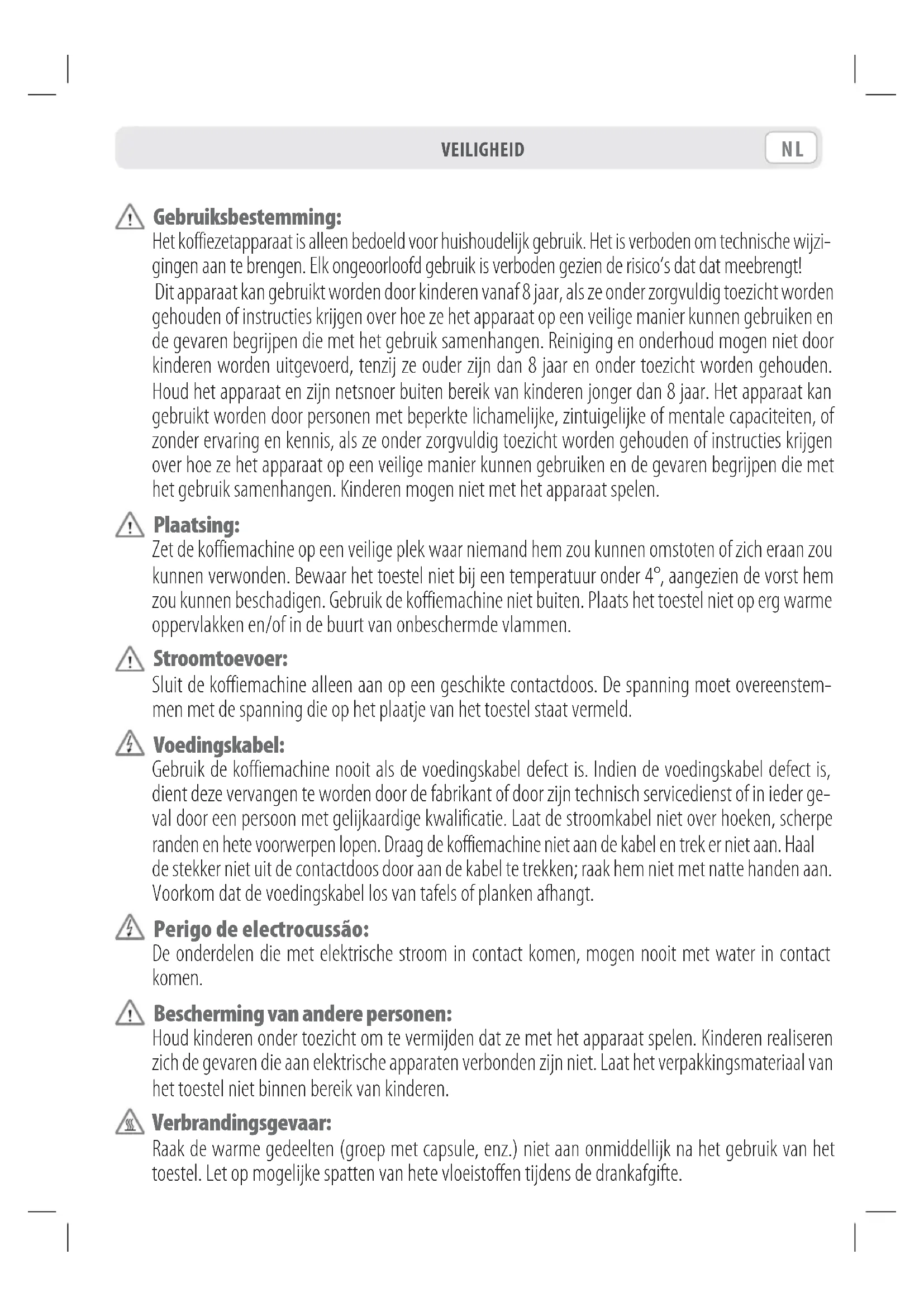 - Caldeira instantânea em alumínio com sonda de temperaturaNL Gebruiksbestemming: Het koffiezetapparaat is alleen bedoeld voor huishoudelijk gebruik. Het is verboden om technische wijzi- gingen aan te brengen. Elk ongeoorloofd gebruik is verboden gezien de risico’s dat dat meebrengt! Dit apparaat kan gebruikt worden door kinderen vanaf 8 jaar, als ze onder zorgvuldig toezicht worden gehouden of instructies krijgen over hoe ze het apparaat op een veilige manier kunnen gebruiken en de gevaren begrijpen die met het gebruik samenhangen. Reiniging en onderhoud mogen niet door kinderen worden uitgevoerd, tenzij ze ouder zijn dan 8 jaar en onder toezicht worden gehouden. Houd het apparaat en zijn netsnoer buiten bereik van kinderen jonger dan 8 jaar. Het apparaat kan gebruikt worden door personen met beperkte lichamelijke, zintuigelijke of mentale capaciteiten, of zonder ervaring en kennis, als ze onder zorgvuldig toezicht worden gehouden of instructies krijgen over hoe ze het apparaat op een veilige manier kunnen gebruiken en de gevaren begrijpen die met het gebruik samenhangen. Kinderen mogen niet met het apparaat spelen. Plaatsing: Zet de koffiemachine op een veilige plek waar niemand hem zou kunnen omstoten of zich eraan zou kunnen verwonden. Bewaar het toestel niet bij een temperatuur onder 4°, aangezien de vorst hem zou kunnen beschadigen. Gebruik de koffiemachine niet buiten. Plaats het toestel niet op erg warme oppervlakken en/of in de buurt van onbeschermde vlammen. Stroomtoevoer: Sluit de koffiemachine alleen aan op een geschikte contactdoos. De spanning moet overeenstem- men met de spanning die op het plaatje van het toestel staat vermeld. Voedingskabel: Gebruik de koffiemachine nooit als de voedingskabel defect is. Indien de voedingskabel defect is, dient deze vervangen te worden door de fabrikant of door zijn technisch servicedienst of in ieder ge- val door een persoon met gelijkaardige kwalificatie. Laat de stroomkabel niet over hoeken, scherpe randen en hete voorwerpen lopen. Draag de koffiemachine niet aan de kabel en trek er niet aan. Haal de stekker niet uit de contactdoos door aan de kabel te trekken; raak hem niet met natte handen aan. Voorkom dat de voedingskabel los van tafels of planken afhangt. Perigo de electrocussão: De onderdelen die met elektrische stroom in contact komen, mogen nooit met water in contact komen. Bescherming van andere personen: Houd kinderen onder toezicht om te vermijden dat ze met het apparaat spelen. Kinderen realiseren zich de gevaren die aan elektrische apparaten verbonden zijn niet. Laat het verpakkingsmateriaal van het toestel niet binnen bereik van kinderen. Verbrandingsgevaar: Raak de warme gedeelten (groep met capsule, enz.) niet aan onmiddellijk na het gebruik van het toestel. Let op mogelijke spatten van hete vloeistoffen tijdens de drankafgifte. VEILIGHEIDITNL Reiniging: Alvorens het toestel te reinigen is het noodzakelijk de stekker uit de contactdoos halen en te wachten tot het toestel is afgekoeld. Dompel het toestel niet onder in water! Pogingen tot reparaties aan de binnenkant van het toestel zijn ten strengste verboden. Vervang het water in het reservoir als het enkele dagen lang niet wordt gebruikt. Opslag van het toestel: Wanneer het toestel langere tijd niet wordt gebruikt, haal de stekker uit de contactdoos en sla deze op in een droge plaats niet toegankelijk voor kinderen. Bescherm het toestel tegen stof en vuil. Reparaties / Onderhoud: Haal de stekker meteen uit de contactdoos bij storingen, defecten of vermoedelijke defecten na een val. Zet een defect toestel nooit in werking. Alleen de erkende servicecentra mogen werkzaamheden en reparaties uitvoeren. Bij ondeskundig uitgevoerde werkzaamheden wordt iedere vorm van aan- sprakelijkheid van de hand gewezen. Waterreservoir: Vul het reservoir altijd en alleen met fris drinkwater zonder koolzuur. Zet het toestel niet aan als het reservoir niet genoeg water bevat. Capsuleruimte: In het capsulevak mogen alleen compatibele capsules worden ingebracht; steek geen vingers of andere voorwerpen erin. De capsules dienen eenmalig gebruikt te worden. Afdanking van het toestel aan het einde van de levensduur: INFORMATIE VOOR DE GEBRUIKERS: overeenkomstig de Richtlijnen 2002/95/EG, 2002/96/EG en 2003/108/EG (en latere wijzigingen) betreffende de reductie van het gebruik van gevaarlij- ke stoffen in elektrische en elektronische apparatuur en betreffende de verwerking van afge- dankte elektrische en elektronische apparatuur. Het symbool van de doorkruiste afvalbak op de apparatuur en op de verpakking, overeenkomstig de Europese Richtlijn 2002/96/EG, geeft aan dat het product aan het einde van de levenscyclus afzonderlijk moet worden ingezameld. De apparatuur dient naar een speciale structuur voor afvalinzameling te worden gebracht. Voor meer informatie over de correcte afdanking van het afval kunnen de eigenaars zich wen- den tot de openbare dienst voor afvalophaling of de verkopers van nieuwe apparatuur. VEILIGHEIDNL