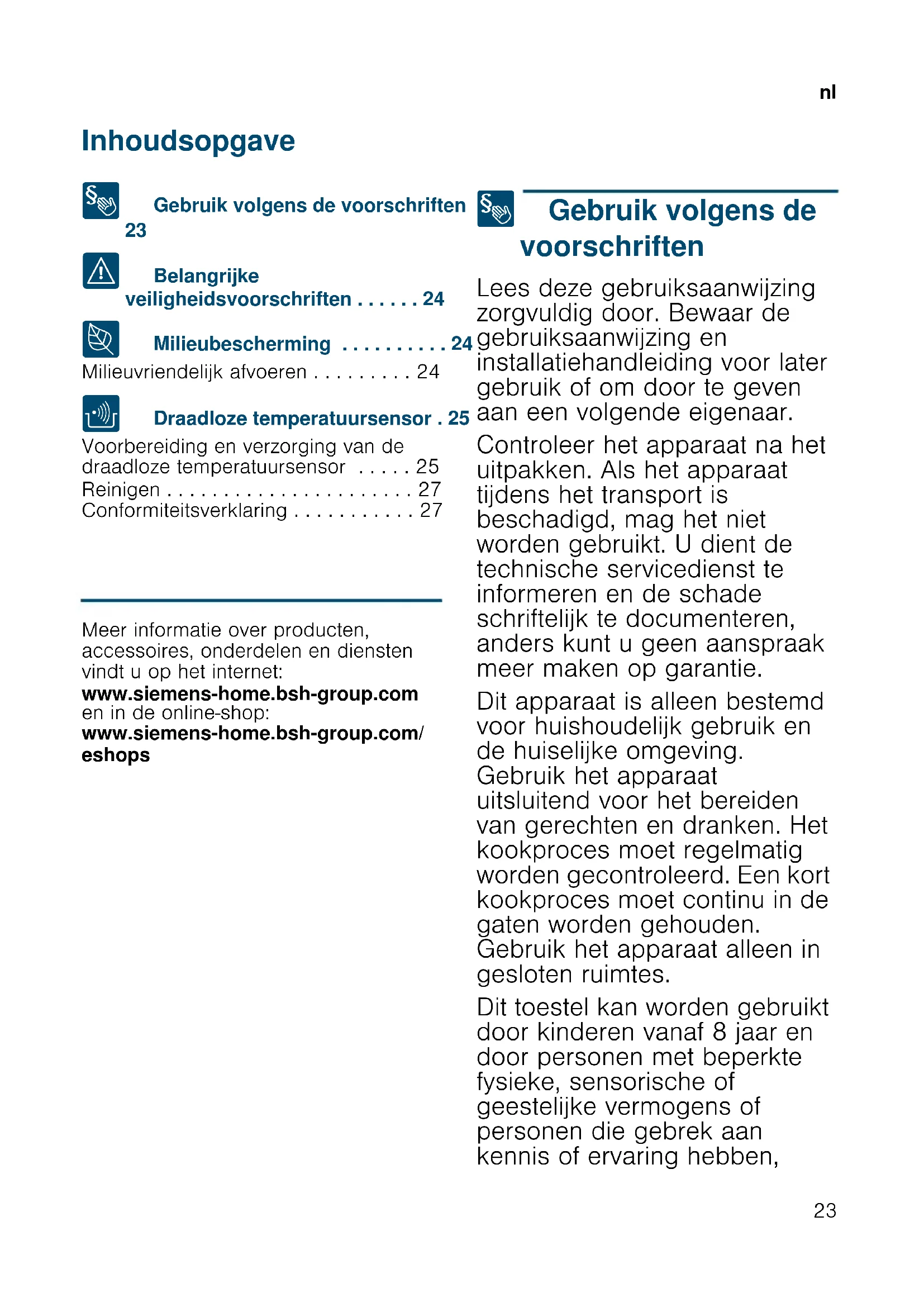 - Conformiteitsverklaring Produktinfo Meer informatie over producten, accessoires, onderdelen en diensten vindt u op het internet: www.siemens-home.bsh-group.com en in de online-shop: www.siemens-home.bsh-group.com/ eshops 8 Gebruik volgens de voorschriften Gebruik volgens de voorschriften Lees deze gebruiksaanwijzing zorgvuldig door. Bewaar de gebruiksaanwijzing en installatiehandleiding voor later gebruik of om door te geven aan een volgende eigenaar. Controleer het apparaat na het uitpakken. Als het apparaat tijdens het transport is beschadigd, mag het niet worden gebruikt. U dient de technische servicedienst te informeren en de schade schriftelijk te documenteren, anders kunt u geen aanspraak meer maken op garantie. Dit apparaat is alleen bestemd voor huishoudelijk gebruik en de huiselijke omgeving. Gebruik het apparaat uitsluitend voor het bereiden van gerechten en dranken. Het kookproces moet regelmatig worden gecontroleerd. Een kort kookproces moet continu in de gaten worden gehouden. Gebruik het apparaat alleen in gesloten ruimtes. Dit toestel kan worden gebruikt door kinderen vanaf 8 jaar en door personen met beperkte fysieke, sensorische of geestelijke vermogens of personen die gebrek aan kennis of ervaring hebben,nl p. 27