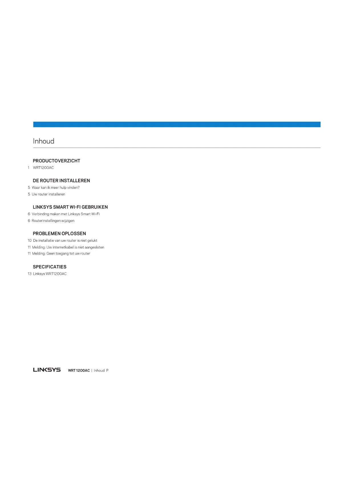 ser. 2 Voer het e‑mailadres en wachtwoord in dat u eerder heeft opgegeven en klik op Aanmel‑ den. WRT 1200AC | Linksys Smart Wi-Fi gebruiken 6WRT 1200AC | Linksys Smart Wi‑Fi gebruiken 7 Gasttoegang – Hiermee kunt u een netwerk configureren en bewaken dat gasten kunnen gebruiken zonder toegang tot al uw netwerkbronnen. Mediaprioritering – Hiermee kunt u instellen welke apparaten en toepassingen de hoogste prioriteit hebben in uw netwerkverkeer. Ouderlijk toezicht – Hiermee kunt u websites blokkeren en internettoegangstijden instellen.WRT 1200AC | Linksys Smart Wi‑Fi gebruiken 8 Snelheidstest – Hiermee kunt u de snelheid van de internetverbinding van uw netwerk testen. Connectiviteit – Hiermee kunt u basisinstellingen en geavanceerde netwerkinstellingen configureren. Externe opslag – Hiermee kunt u toegang krijgen tot een USB‑ of eSATA‑schijf (beide niet meegeleverd) en bestandsdeling, een mediaserver en FTP‑toegang instellen. Problemen oplossen – Hiermee kunt u de oorzaak van problemen met uw router opsporen en de status van het netwerk controleren.WRT 1200AC | Linksys Smart Wi‑Fi gebruiken 9 Draadloos – Hiermee kunt u het draadloze netwerk van uw router configureren. U kunt de beveiligingsmodus, het wachtwoord en MAC‑filtering wijzigen en apparaten verbinden via Wi‑Fi Protected Setup™. Beveiliging – Hiermee kunt u de draadloze beveiliging van uw router configureren. U kunt de firewall en VPN instellen en specifieke instellingen bepalen voor toepassingen en games.Problemen oplossen WRT 1200AC | Problemen oplossen 10 Uw router kan er anders uitzien Dit hoofdstuk kan helpen bij het oplossen van algemene problemen met de installatie of de internetverbinding. Voor meer hulp kunt u terecht bij onze bekroonde klantenonder- steuning via linksys.com/support. DE INSTALLATIE VAN UW ROUTER IS NIET GELUKT Als de installatie van Linksys Smart Wi-Fi niet is voltooid: