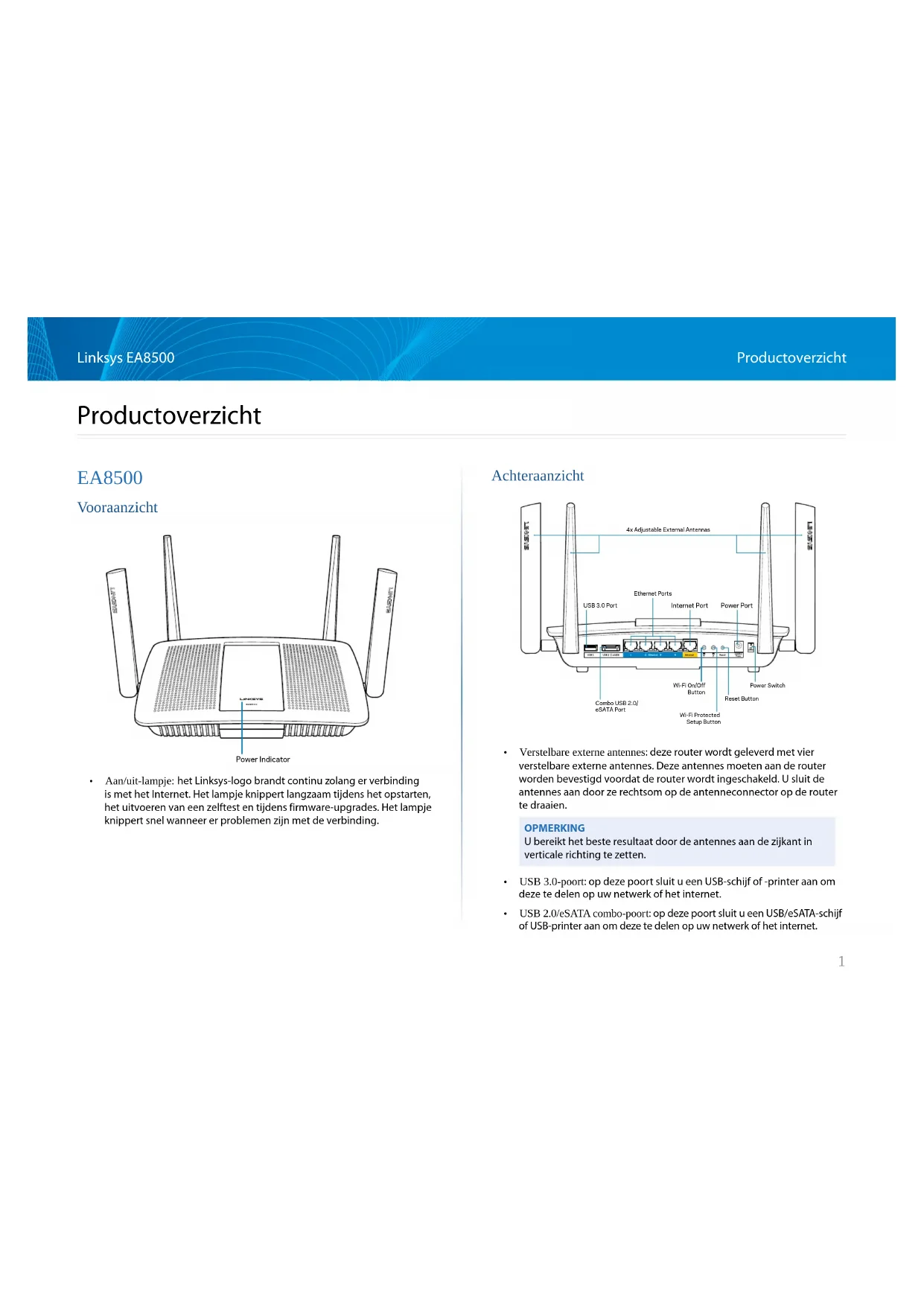 - Aan/uit-schakelaar: druk op | (aan) om de router in te schakelen.3 Linksys EA8500 De router installeren Waar kan ik meer hulp vinden?