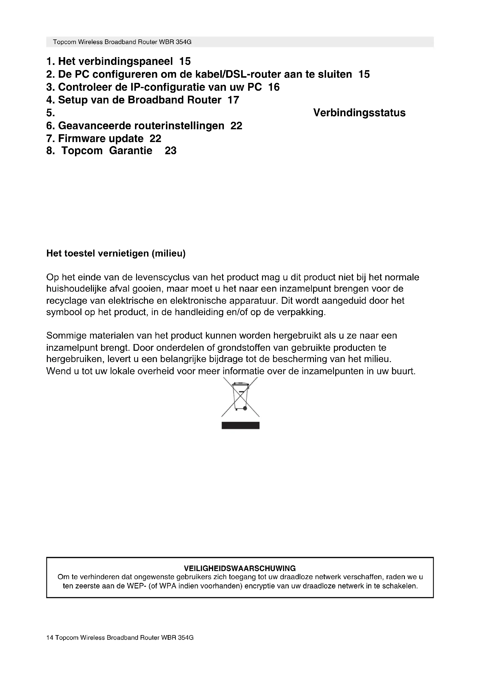 Het toestel vernietigen (milieu) Op het einde van de levenscyclus van het product mag u dit product niet bij het normale huishoudelijke afval gooien, maar moet u het naar een inzamelpunt brengen voor de recyclage van elektrische en elektronische apparatuur. Dit wordt aangeduid door het symbool op het product, in de handleiding en/of op de verpakking. Sommige materialen van het product kunnen worden hergebruikt als u ze naar een inzamelpunt brengt. Door onderdelen of grondstoffen van gebruikte producten te hergebruiken, levert u een belangrijke bijdrage tot de bescherming van het milieu. Wend u tot uw lokale overheid voor meer informatie over de inzamelpunten in uw buurt. VEILIGHEIDSWAARSCHUWING Om te verhinderen dat ongewenste gebruikers zich toegang tot uw draadloze netwerk verschaffen, raden we u ten zeerste aan de WEP- (of WPA indien voorhanden) encryptie van uw draadloze netwerk in te schakelen.Topcom Wireless Broadband Router WBR 354G 15 NEDERLANDS Topcom Wireless Broadband Router WBR 354G