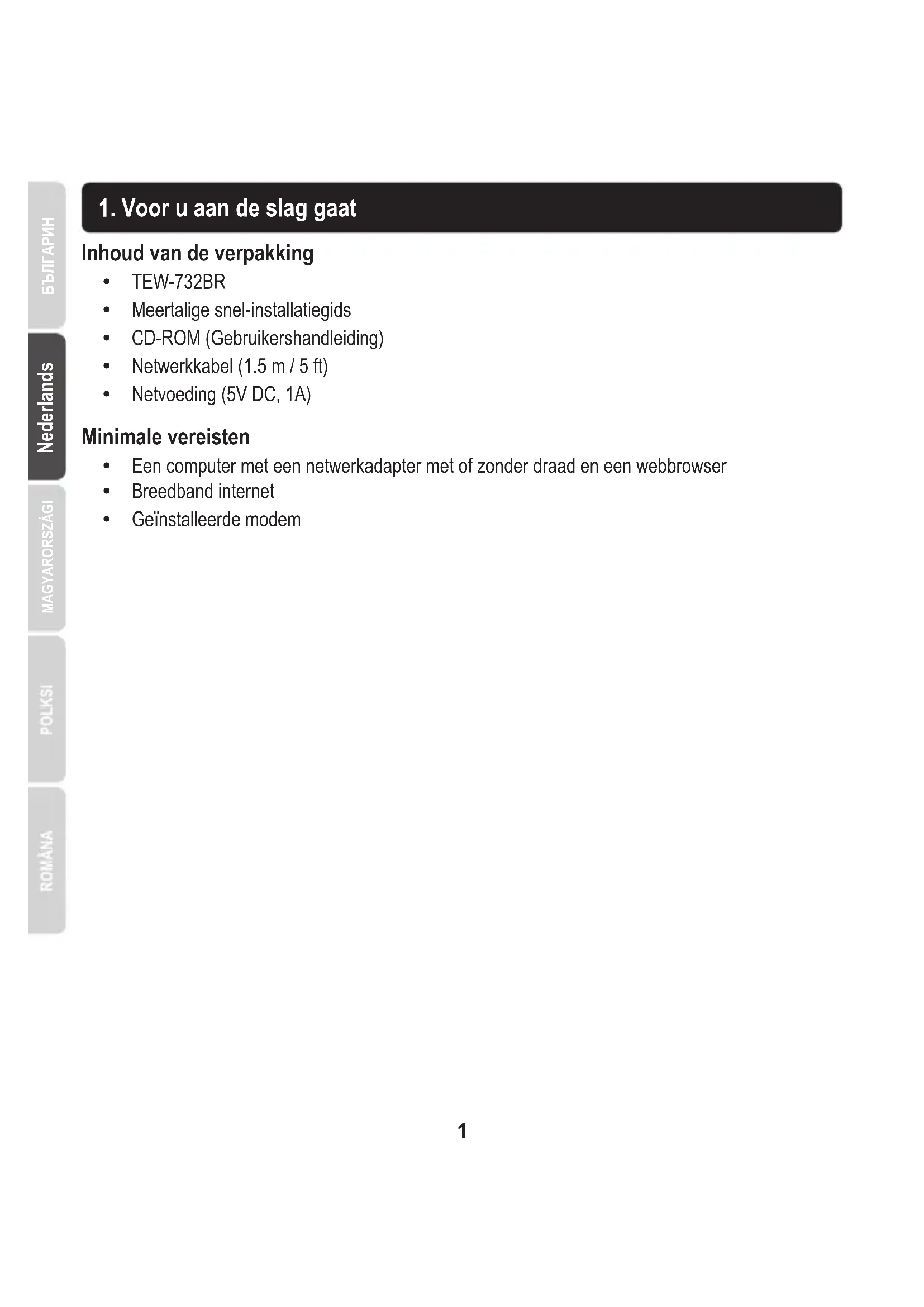 Een computer met een netwerkadapter met of zonder draad en een webbrowser Breedband internet Geïnstalleerde modem TEW-732BR Meertalige snel-installatiegids CD-ROM (Gebruikershandleiding) Netwerkkabel (1.5 m / 5 ft) Netvoeding (5V DC, 1A) Minimale vereisten Inhoud van de verpakking