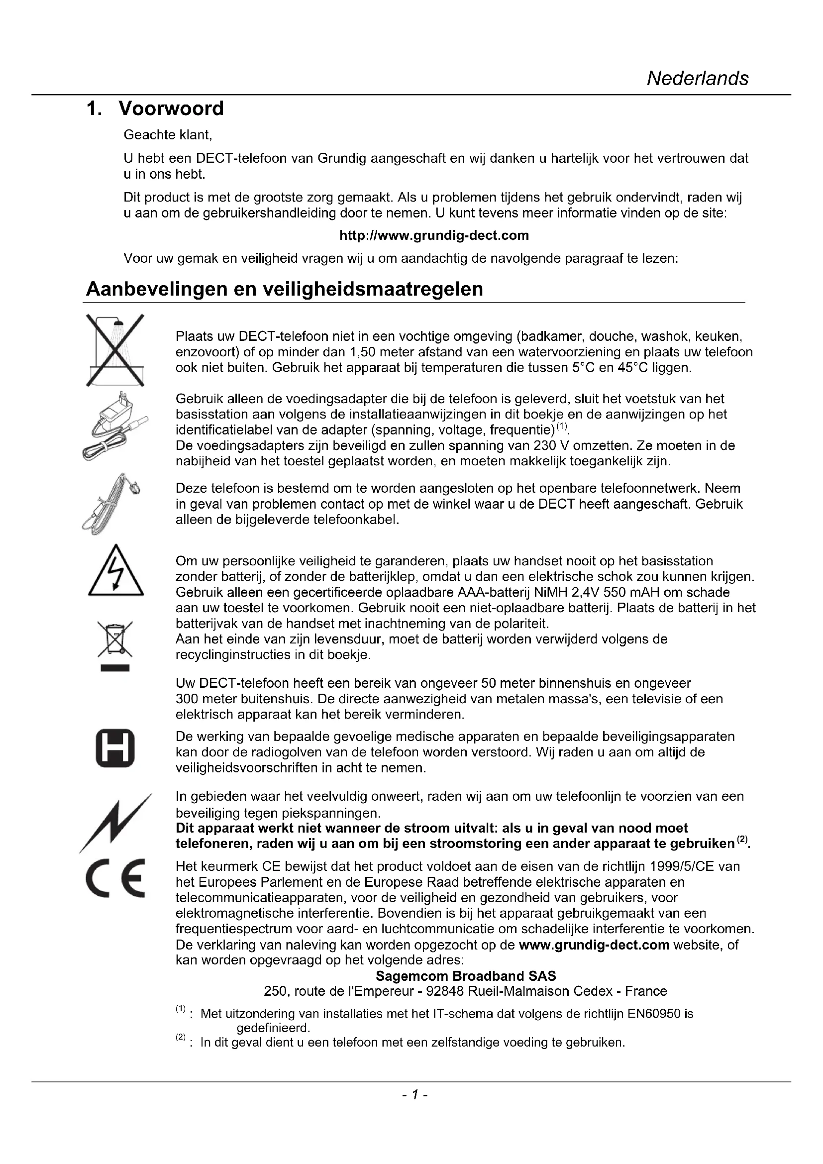 Het keurmerk CE bewijst dat het product voldoet aan de eisen van de richtlijn 1999/5/CE van het Europees Parlement en de Europese Raad betreffende elektrische apparaten en telecommunicatieapparaten, voor de veiligheid en gezondheid van gebruikers, voor elektromagnetische interferentie. Bovendien is bij het apparaat gebruikgemaakt van een frequentiespectrum voor aard- en luchtcommunicatie om schadelijke interferentie te voorkomen. De verklaring van naleving kan worden opgezocht op de www.grundig-dect.com website, of kan worden opgevraagd op het volgende adres: Sagemcom Broadband SAS 250, route de l'Empereur - 92848 Rueil-Malmaison Cedex - France (1) : Met uitzondering van installaties met het IT-schema dat volgens de richtlijn EN60950 is gedefinieerd. (2) : In dit geval dient u een telefoon met een zelfstandige voeding te gebruiken.Elya A