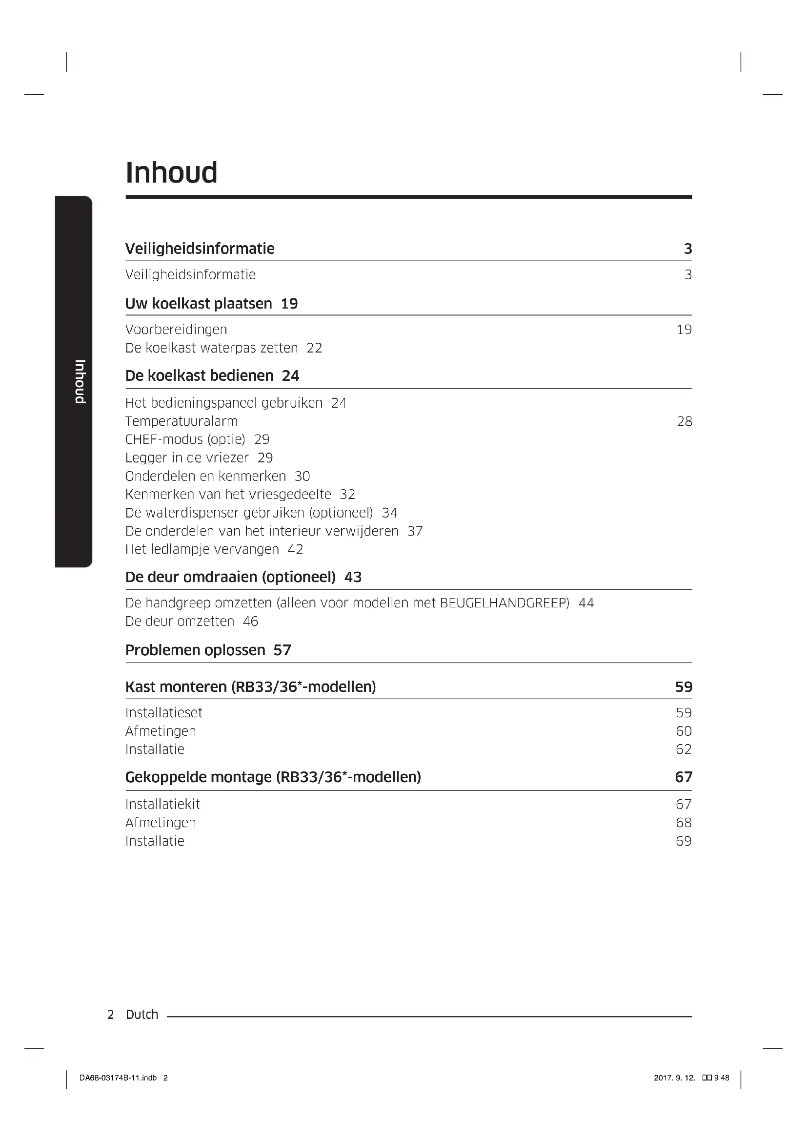 www.samsung.com/de/support DA68-03174B-11.indb 76 2017. 9. 12. 9:48Koelkast gebruiksaanwijzing SEBN Losstaand apparaat RB33J8** / RB36J8** / RB38J7** / RB41J7** DA68-03174B-11.indb 1 2017. 9. 12. 9:482 Dutch Inhoud Inhoud Veiligheidsinformatie 3 Veiligheidsinformatie 3 Uw koelkast plaatsen 19 Voorbereidingen 19 De koelkast waterpas zetten 22 De koelkast bedienen 24 Het bedieningspaneel gebruiken 24 Temperatuuralarm 28 CHEF-modus (optie) 29 Legger in de vriezer 29 Onderdelen en kenmerken 30 Kenmerken van het vriesgedeelte 32 De waterdispenser gebruiken (optioneel) 34 De onderdelen van het interieur verwijderen 37 Het ledlampje vervangen 42 De deur omdraaien (optioneel) 43 De handgreep omzetten (alleen voor modellen met BEUGELHANDGREEP) 44 De deur omzetten 46 Problemen oplossen 57 Kast monteren (RB33/36*-modellen) 59 Installatieset 59 Afmetingen 60 Installatie 62 Gekoppelde montage (RB33/36*-modellen) 67 Installatiekit 67 Afmetingen 68 Installatie 69 DA68-03174B-11.indb 2 2017. 9. 12. 9:48Dutch 3 Veiligheidsinformatie Veiligheidsinformatie Veiligheidsinformatie