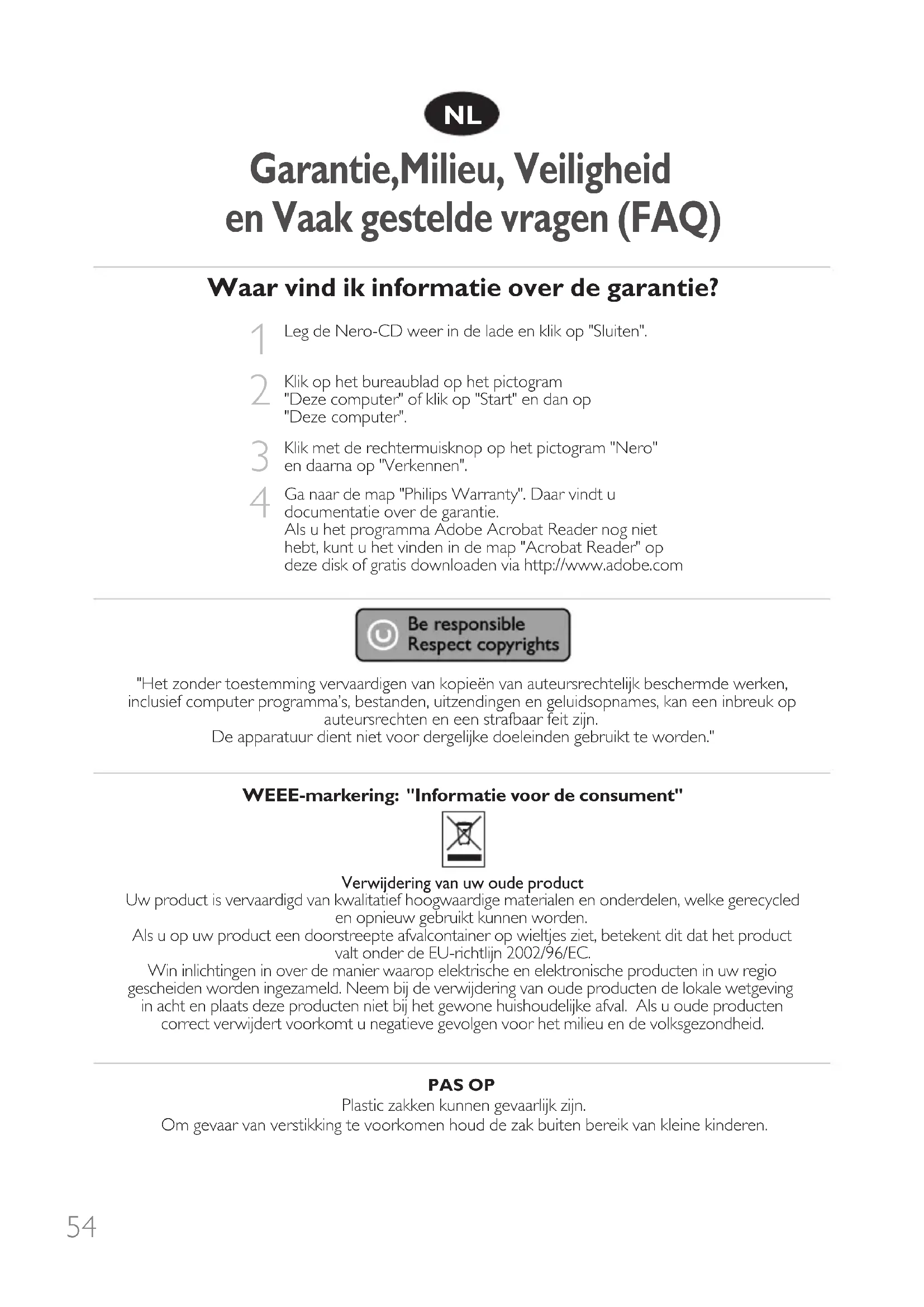 Ga naar de map "Philips Warranty". Daar vindt u documentatie over de garantie. Als u het programma Adobe Acrobat Reader nog niet hebt, kunt u het vinden in de map "Acrobat Reader" op deze disk of gratis downloaden via http://www.adobe.com "Het zonder toestemming vervaardigen van kopieën van auteursrechtelijk beschermde werken, inclusief computer programma’s, bestanden, uitzendingen en geluidsopnames, kan een inbreuk op auteursrechten en een strafbaar feit zijn. De apparatuur dient niet voor dergelijke doeleinden gebruikt te worden." WEEE-markering: "Informatie voor de consument" Verwijdering van uw oude product Uw product is vervaardigd van kwalitatief hoogwaardige materialen en onderdelen, welke gerecycled en opnieuw gebruikt kunnen worden. Als u op uw product een doorstreepte afvalcontainer op wieltjes ziet, betekent dit dat het product valt onder de EU-richtlijn 2002/96/EC. Win inlichtingen in over de manier waarop elektrische en elektronische producten in uw regio gescheiden worden ingezameld. Neem bij de verwijdering van oude producten de lokale wetgeving in acht en plaats deze producten niet bij het gewone huishoudelijke afval. Als u oude producten correct verwijdert voorkomt u negatieve gevolgen voor het milieu en de volksgezondheid. PAS OP Plastic zakken kunnen gevaarlijk zijn. Om gevaar van verstikking te voorkomen houd de zak buiten bereik van kleine kinderen. Garantie,Milieu, Veiligheid en Vaak gestelde vragen (FAQ) NL55 Vaak gestelde vragen (FAQ) Vraag 1: Mijn computer met Windows 98 Tweede Edition heeft geen CD-ROM-station, maar ik heb een andere PC. Hoe kan ik de stuurprogramma's installeren?