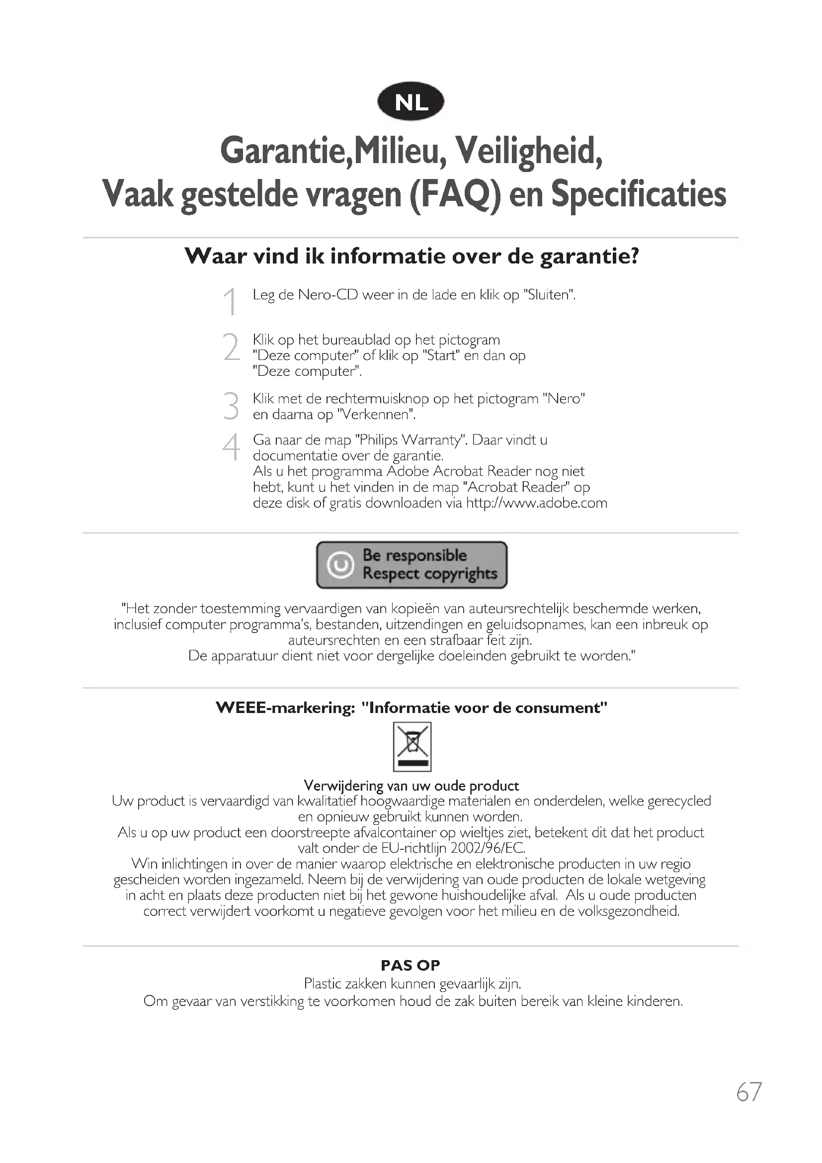 Ga naar de map "Philips Warranty". Daar vindt u documentatie over de garantie. Als u het programma Adobe Acrobat Reader nog niet hebt, kunt u het vinden in de map "Acrobat Reader" op deze disk of gratis downloaden via http://www.adobe.com "Het zonder toestemming vervaardigen van kopieën van auteursrechtelijk beschermde werken, inclusief computer programma’s, bestanden, uitzendingen en geluidsopnames, kan een inbreuk op auteursrechten en een strafbaar feit zijn. De apparatuur dient niet voor dergelijke doeleinden gebruikt te worden." WEEE-markering: "Informatie voor de consument" Verwijdering van uw oude product Uw product is vervaardigd van kwalitatief hoogwaardige materialen en onderdelen, welke gerecycled en opnieuw gebruikt kunnen worden. Als u op uw product een doorstreepte afvalcontainer op wieltjes ziet, betekent dit dat het product valt onder de EU-richtlijn 2002/96/EC. Win inlichtingen in over de manier waarop elektrische en elektronische producten in uw regio gescheiden worden ingezameld. Neem bij de verwijdering van oude producten de lokale wetgeving in acht en plaats deze producten niet bij het gewone huishoudelijke afval. Als u oude producten correct verwijdert voorkomt u negatieve gevolgen voor het milieu en de volksgezondheid. PAS OP Plastic zakken kunnen gevaarlijk zijn. Om gevaar van verstikking te voorkomen houd de zak buiten bereik van kleine kinderen. Garantie,Milieu, Veiligheid, Vaak gestelde vragen (FAQ) en Specificaties NL68 Vaak gestelde vragen (FAQ) Vraag 1: Mijn computer met Windows 98 Tweede Edition heeft geen CD-ROM-station, maar ik heb een andere PC. Hoe kan ik de stuurprogramma's installeren?