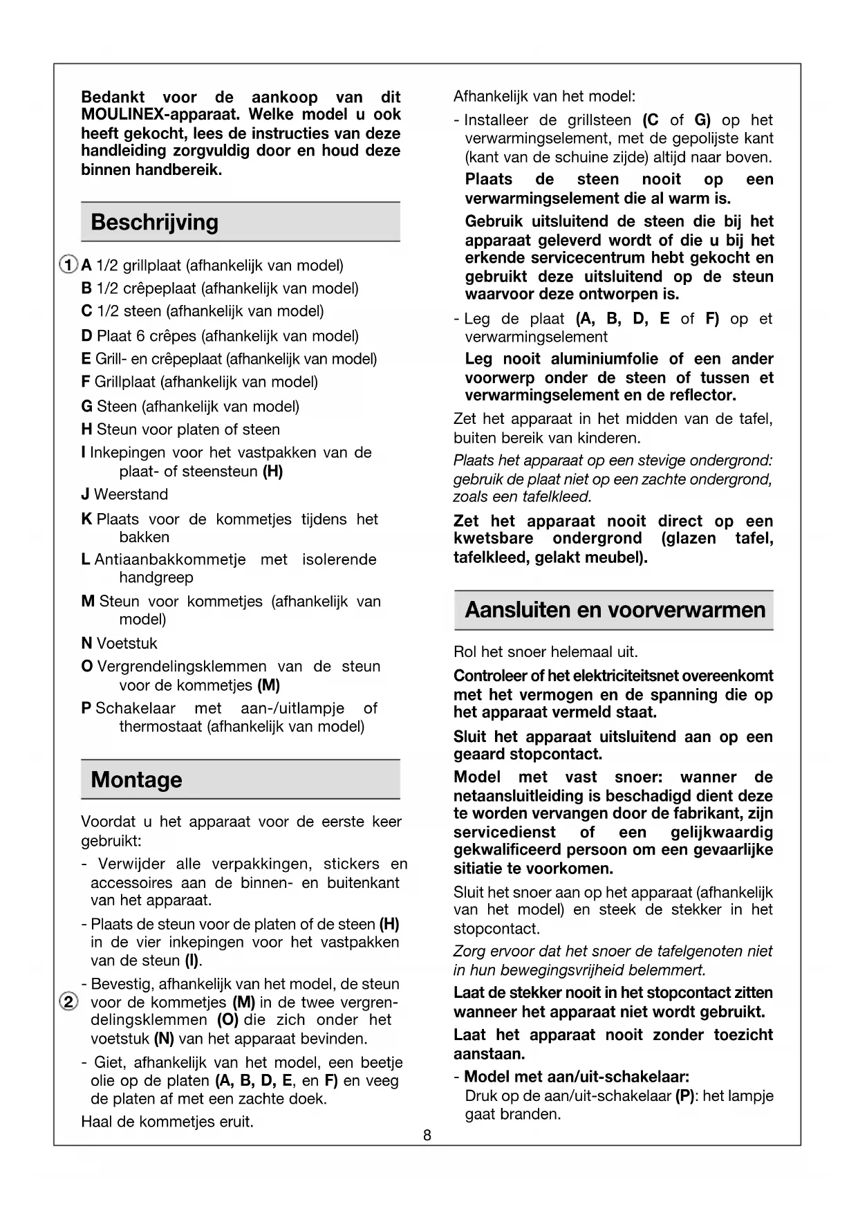Pour 6 personnes : 1/2 l de lait, 3 œufs, 2 c. à soupe d'huile, 250 g de farine, 2 c. à soupe de sucre et eau de fleurs d'oranger (si crêpes sucrées) Mélangez tous les ingrédients pour obtenir une pâte lisse et homogène comme une pâte à crêpes (utilisez le mélangeur électrique, un mixeur ou un batteur : le travail sera rapide et la pâte sans grumeaux). Versez-la dans un saladier et laissez reposer une heure au réfrigérateur. Versez la valeur d'une dosette à café ou de 2 c. à soupe de pâte dans chaque surface de cuisson et faites cuire environ 1 min 30 par face. Moul/Gustivio EurOuest 0603 26/06/03 9:21 Page 78 Bedankt voor de aankoop van dit MOULINEX-apparaat. Welke model u ook heeft gekocht, lees de instructies van deze handleiding zorgvuldig door en houd deze binnen handbereik. Beschrijving A 1/2 grillplaat (afhankelijk van model) B 1/2 crêpeplaat (afhankelijk van model) C 1/2 steen (afhankelijk van model) D Plaat 6 crêpes (afhankelijk van model) E Grill- en crêpeplaat (afhankelijk van model) F Grillplaat (afhankelijk van model) G Steen (afhankelijk van model) H Steun voor platen of steen I Inkepingen voor het vastpakken van de plaat- of steensteun (H) J Weerstand K Plaats voor de kommetjes tijdens het bakken L Antiaanbakkommetje met isolerende handgreep M Steun voor kommetjes (afhankelijk van model) N Voetstuk O Vergrendelingsklemmen van de steun voor de kommetjes (M) P Schakelaar met aan-/uitlampje of thermostaat (afhankelijk van model) Montage Voordat u het apparaat voor de eerste keer gebruikt: - Verwijder alle verpakkingen, stickers en accessoires aan de binnen- en buitenkant van het apparaat. - Plaats de steun voor de platen of de steen (H) in de vier inkepingen voor het vastpakken van de steun (I). - Bevestig, afhankelijk van het model, de steun voor de kommetjes (M) in de twee vergren- delingsklemmen (O) die zich onder het voetstuk (N) van het apparaat bevinden. - Giet, afhankelijk van het model, een beetje olie op de platen (A, B, D, E, en F) en veeg de platen af met een zachte doek. Haal de kommetjes eruit. Afhankelijk van het model: - Installeer de grillsteen (C of G) op het verwarmingselement, met de gepolijste kant (kant van de schuine zijde) altijd naar boven. Plaats de steen nooit op een verwarmingselement die al warm is. Gebruik uitsluitend de steen die bij het apparaat geleverd wordt of die u bij het erkende servicecentrum hebt gekocht en gebruikt deze uitsluitend op de steun waarvoor deze ontworpen is. - Leg de plaat (A, B, D, E of F) op et verwarmingselement Leg nooit aluminiumfolie of een ander voorwerp onder de steen of tussen et verwarmingselement en de reflector. Zet het apparaat in het midden van de tafel, buiten bereik van kinderen. Plaats het apparaat op een stevige ondergrond: gebruik de plaat niet op een zachte ondergrond, zoals een tafelkleed. Zet het apparaat nooit direct op een kwetsbare ondergrond (glazen tafel, tafelkleed, gelakt meubel). Aansluiten en voorverwarmen Rol het snoer helemaal uit. Controleer of het elektriciteitsnet overeenkomt met het vermogen en de spanning die op het apparaat vermeld staat. Sluit het apparaat uitsluitend aan op een geaard stopcontact. Model met vast snoer: wanner de netaansluitleiding is beschadigd dient deze te worden vervangen door de fabrikant, zijn servicedienst of een gelijkwaardig gekwalificeerd persoon om een gevaarlijke sitiatie te voorkomen. Sluit het snoer aan op het apparaat (afhankelijk van het model) en steek de stekker in het stopcontact. Zorg ervoor dat het snoer de tafelgenoten niet in hun bewegingsvrijheid belemmert. Laat de stekker nooit in het stopcontact zitten wanneer het apparaat niet wordt gebruikt. Laat het apparaat nooit zonder toezicht aanstaan. - Model met aan/uit-schakelaar: Druk op de aan/uit-schakelaar (P): het lampje gaat branden.