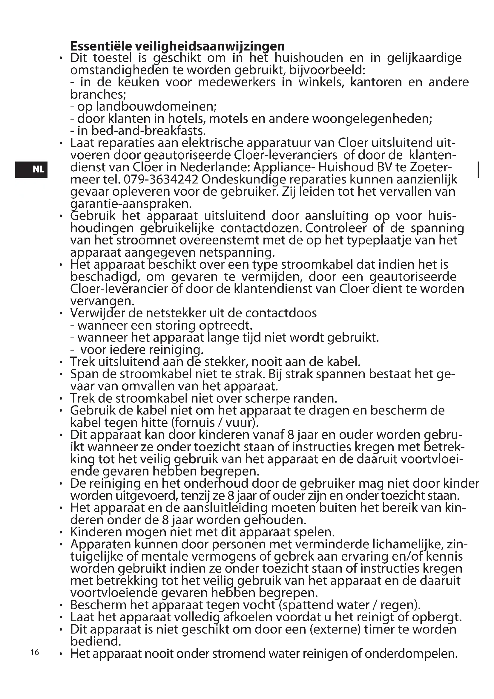 Laat reparations aan elektrische apparatuur van Cloer uitsluitend uitvoeren door geauthoriseerde Cloer-leveranciers of door de klantendienst van Cloer in Nederlande: Appliance-Huishoud BV te Zoetermeer tel. 079-3634242 Ondeskundige reparations konnen aanzienlijk gevaar opleveren voor de gebruiker. Zij leiden tot het verrallen van garantie-aanspraken.