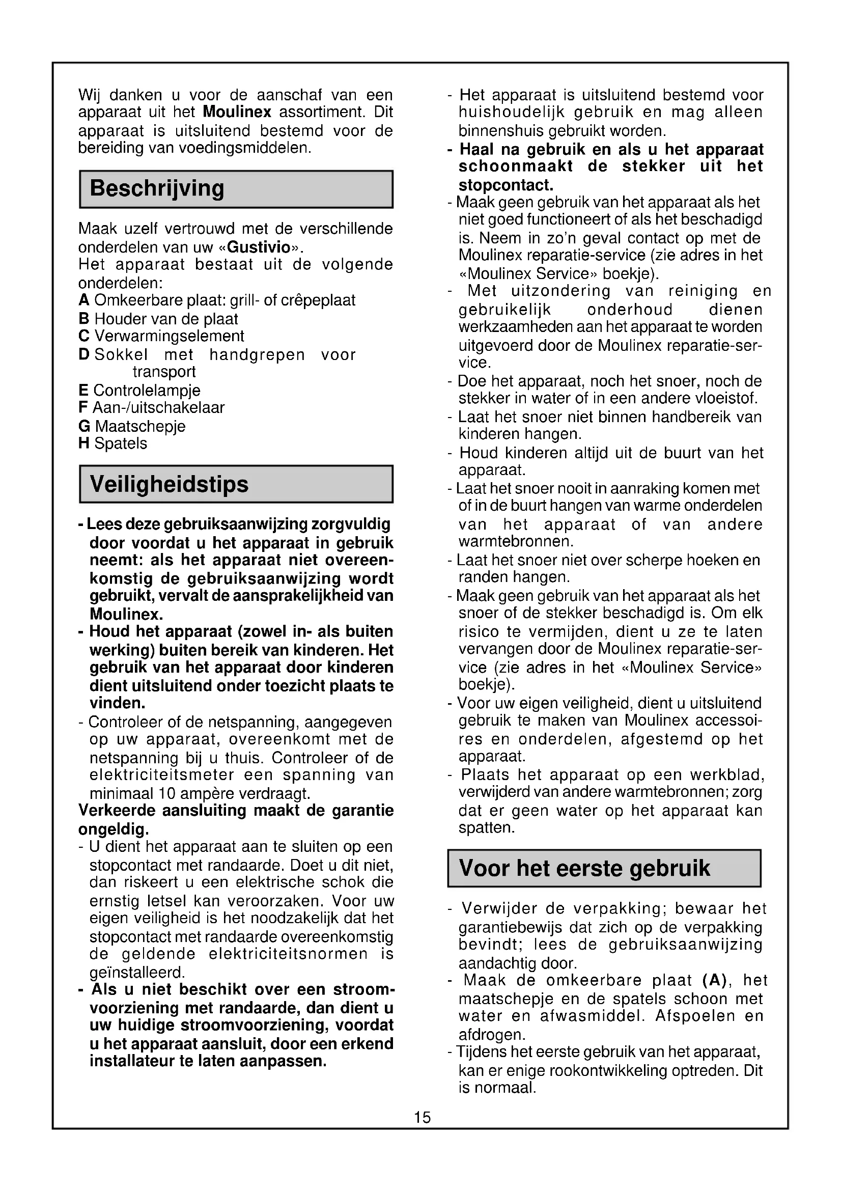 - Aus den oben angegebenen Zutaten einen Teig zubereiten; zum Schluß das Backpulver und das Natron hinzufügen. - Den Teig 30 Min. ruhen lassen; wenn er zu fest ist, etwas Milch hinzufügen. - In jedes Garfeld zwei Dosierlöffel Teig füllen. - Wenn der Pfannkuchen sich von der Platte lösen läßt, mit dem Spatel wenden (ca. 2 Min. von jeder Seite). Variante - Blaubeerpfannkuchen: Kurz vor dem Backen 200 g frische Blaubeeren hinzufügen. - Mit Ahornsirup servieren.15 Wij danken u voor de aanschaf van een apparaat uit het Moulinex assortiment. Dit apparaat is uitsluitend bestemd voor de bereiding van voedingsmiddelen. Beschrijving Maak uzelf vertrouwd met de verschillende onderdelen van uw «Gustivio». Het apparaat bestaat uit de volgende onderdelen: A Omkeerbare plaat: grill- of crêpeplaat B Houder van de plaat C Verwarmingselement D Sokkel met handgrepen voor transport E Controlelampje F Aan-/uitschakelaar G Maatschepje H Spatels Veiligheidstips - Lees deze gebruiksaanwijzing zorgvuldig door voordat u het apparaat in gebruik neemt: als het apparaat niet overeen- komstig de gebruiksaanwijzing wordt gebruikt, vervalt de aansprakelijkheid van Moulinex. - Houd het apparaat (zowel in- als buiten werking) buiten bereik van kinderen. Het gebruik van het apparaat door kinderen dient uitsluitend onder toezicht plaats te vinden. - Controleer of de netspanning, aangegeven op uw apparaat, overeenkomt met de netspanning bij u thuis. Controleer of de elektriciteitsmeter een spanning van minimaal 10 ampère verdraagt. Verkeerde aansluiting maakt de garantie ongeldig. - U dient het apparaat aan te sluiten op een stopcontact met randaarde. Doet u dit niet, dan riskeert u een elektrische schok die ernstig letsel kan veroorzaken. Voor uw eigen veiligheid is het noodzakelijk dat het stopcontact met randaarde overeenkomstig de geldende elektriciteitsnormen is geïnstalleerd. - Als u niet beschikt over een stroom- voorziening met randaarde, dan dient u uw huidige stroomvoorziening, voordat u het apparaat aansluit, door een erkend installateur te laten aanpassen. - Het apparaat is uitsluitend bestemd voor huishoudelijk gebruik en mag alleen binnenshuis gebruikt worden. - Haal na gebruik en als u het apparaat schoonmaakt de stekker uit het stopcontact. - Maak geen gebruik van het apparaat als het niet goed functioneert of als het beschadigd is. Neem in zo’n geval contact op met de Moulinex reparatie-service (zie adres in het «Moulinex Service» boekje). - Met uitzondering van reiniging en gebruikelijk onderhoud dienen werkzaamheden aan het apparaat te worden uitgevoerd door de Moulinex reparatie-ser- vice. - Doe het apparaat, noch het snoer, noch de stekker in water of in een andere vloeistof. - Laat het snoer niet binnen handbereik van kinderen hangen. - Houd kinderen altijd uit de buurt van het apparaat. - Laat het snoer nooit in aanraking komen met of in de buurt hangen van warme onderdelen van het apparaat of van andere warmtebronnen. - Laat het snoer niet over scherpe hoeken en randen hangen. - Maak geen gebruik van het apparaat als het snoer of de stekker beschadigd is. Om elk risico te vermijden, dient u ze te laten vervangen door de Moulinex reparatie-ser- vice (zie adres in het «Moulinex Service» boekje). - Voor uw eigen veiligheid, dient u uitsluitend gebruik te maken van Moulinex accessoi- res en onderdelen, afgestemd op het apparaat. - Plaats het apparaat op een werkblad, verwijderd van andere warmtebronnen; zorg dat er geen water op het apparaat kan spatten. Voor het eerste gebruik - Verwijder de verpakking; bewaar het garantiebewijs dat zich op de verpakking bevindt; lees de gebruiksaanwijzing aandachtig door. - Maak de omkeerbare plaat (A), het maatschepje en de spatels schoon met water en afwasmiddel. Afspoelen en afdrogen. - Tijdens het eerste gebruik van het apparaat, kan er enige rookontwikkeling optreden. Dit is normaal.16 Recepten . GRILLGERECHTEN Per persoon: 1 lamskotelet 1 lamsnier 1/2 plak lamslever 1 varkenssaucijs 1 plak gerookt spek 1 tomaat 1/2 ui olie gemalen koriander en komijn zout, peper - Verwarm het apparaat voor; gril het vlees en de groenten. Serveer er chips, frites of salade bij.