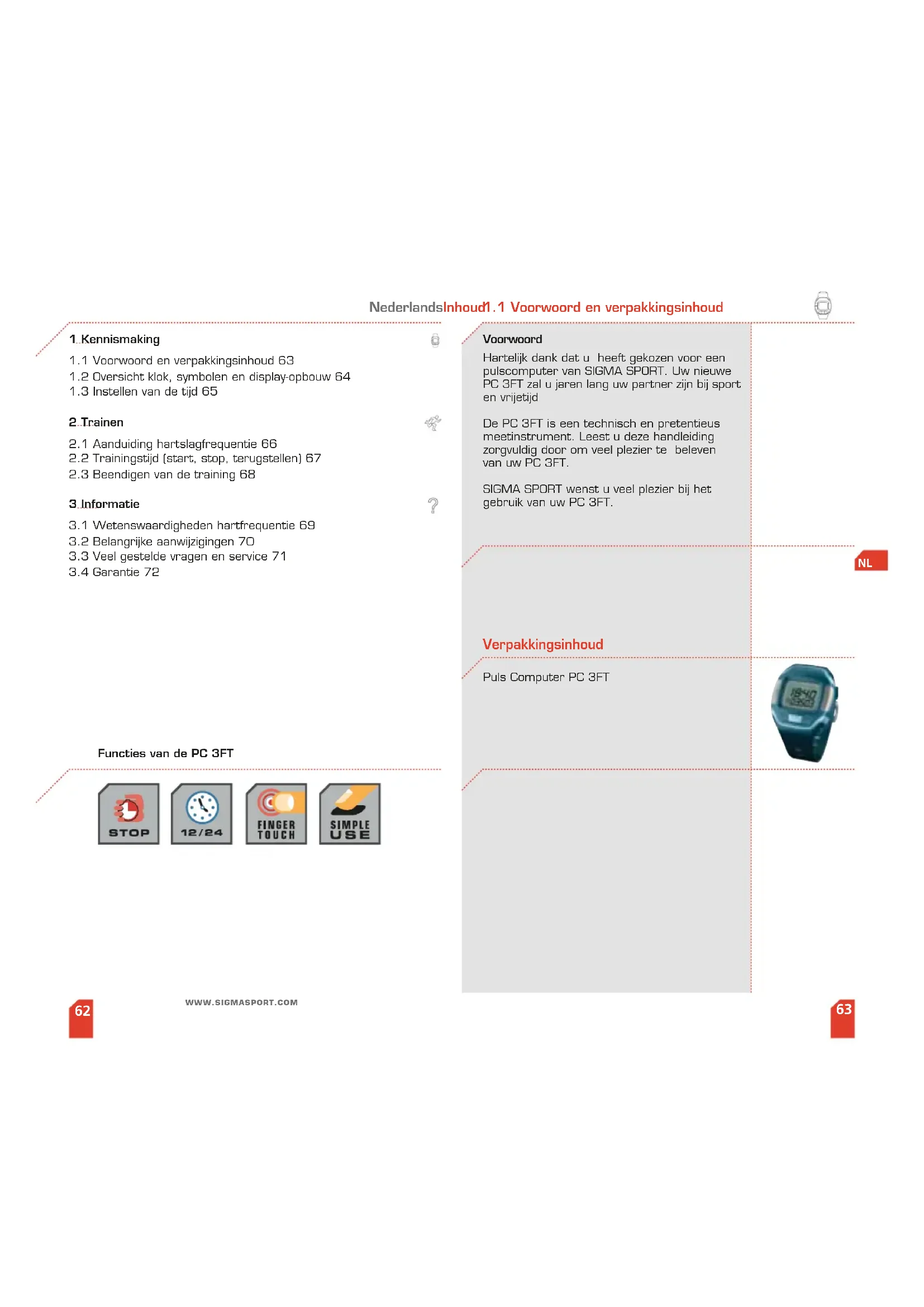 Voorwoord Hartelijk dank dat u heeft gekozen voor een pulscomputer van SIGMA SPORT. Uw nieuwe PC 3FT zal u jaren lang uw partner zijn bij sport en vrijetijd De PC 3FT is een technisch en pretentieus meetinstrument. Leest u deze handleiding zorgvuldig door om veel plezier te beleven van uw PC 3FT. SIGMA SPORT wenst u veel plezier bij het gebruik van uw PC 3FT. Puls Computer PC 3FT