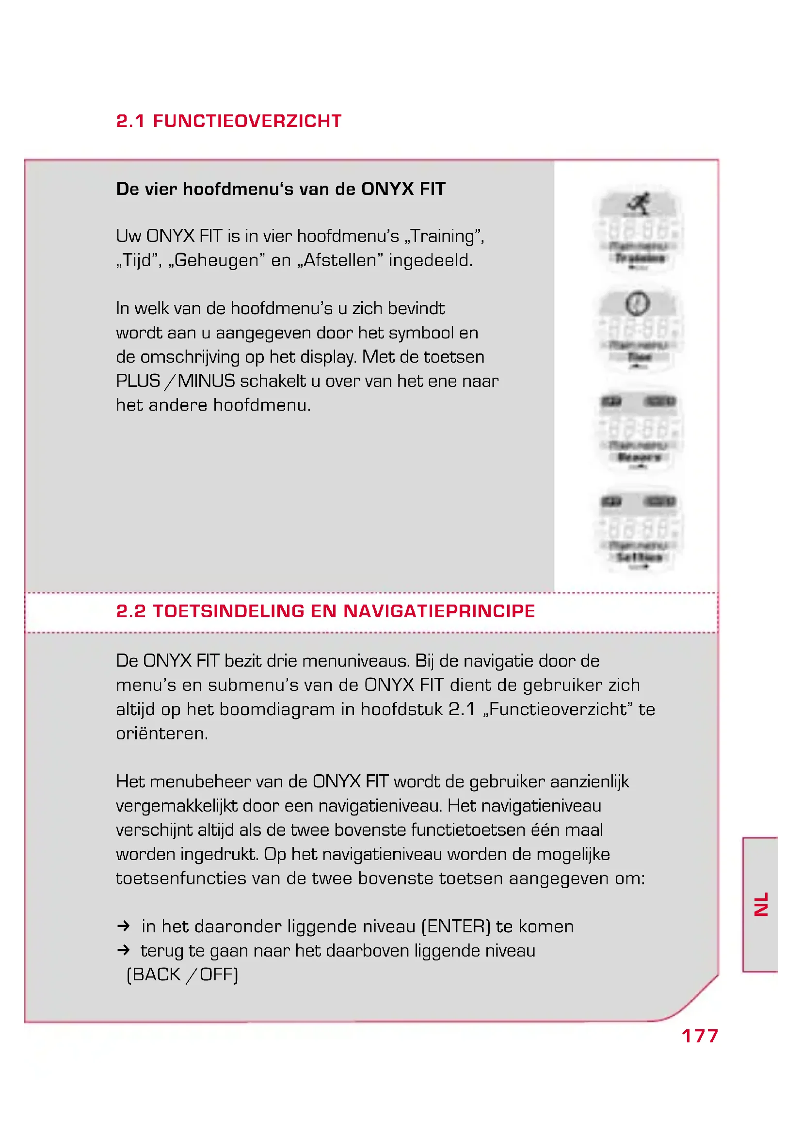 De vier hoofdmenu‘s van de ONYX FIT Uw ONYX FIT is in vier hoofdmenu’s „Training”, „Tijd”, „Geheugen” en „Afstellen” ingedeeld. In welk van de hoofdmenu’s u zich bevindt wordt aan u aangegeven door het symbool en de omschrijving op het display. Met de toetsen PLUS /MINUS schakelt u over van het ene naar het andere hoofdmenu. De ONYX FIT bezit drie menuniveaus. Bij de navigatie door de menu’s en submenu’s van de ONYX FIT dient de gebruiker zich altijd op het boomdiagram in hoofdstuk 2.1 „Functieoverzicht” te oriënteren. Het menubeheer van de ONYX FIT wordt de gebruiker aanzienlijk vergemakkelijkt door een navigatieniveau. Het navigatieniveau verschijnt altijd als de twee bovenste functietoetsen één maal worden ingedrukt. Op het navigatieniveau worden de mogelijke toetsenfuncties van de twee bovenste toetsen aangegeven om: k in het daaronder liggende niveau (ENTER) te komen k terug te gaan naar het daarboven liggende niveau (BACK /OFF)