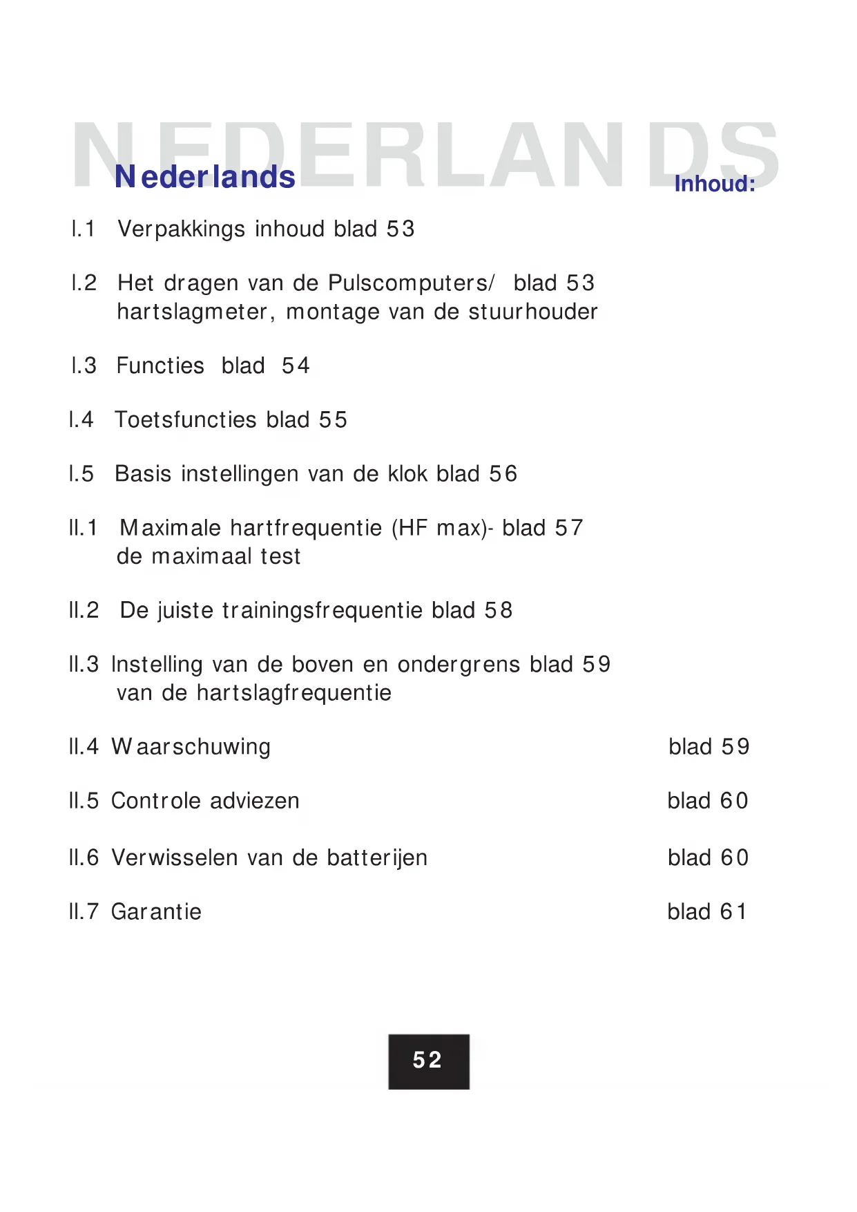 De maximale hartfrequentie Hf max. is uw maximale hartfrequen- tie die bij een totale inspanning die voor u mogelijk is. De persoon- lijke HF max. is afhankelijk van uw lichamelijk conditie. De beste manier om die grenzen te ontdekken zijn een belastingstest. Wij adviseren die test te doen onder leiding van een arts en deze test regelmatig te herhalen om zo uw conditie vast te leg- gen zodat u verantwoordt kan sporten . De HF max. kan ook door een mathematische vergelijking worden ingeschat: Mannen: 210 – "helft leeftijd" – ( 0.11 x het persoonlijke gewicht in KG) + 4 Dames: 210 – "helft leeftijd" – ( 0,11 x het pesoonlijke gewicht) nederlands58