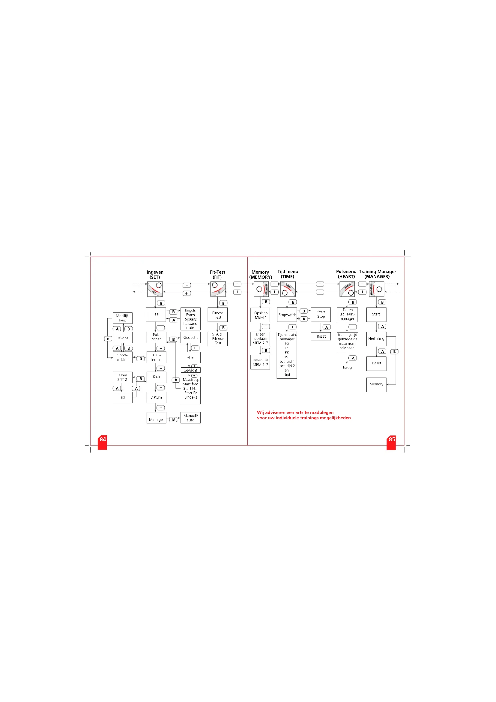 NL84 Wij adviseren een arts te raadplegen voor uw individuele trainings mogelijkheden Training Manager (MANAGER) Pulsmenu (HEART) Tijd menu (TIME) Memory (MEMORY) Fit-Test (FIT) Ingeven (SET)