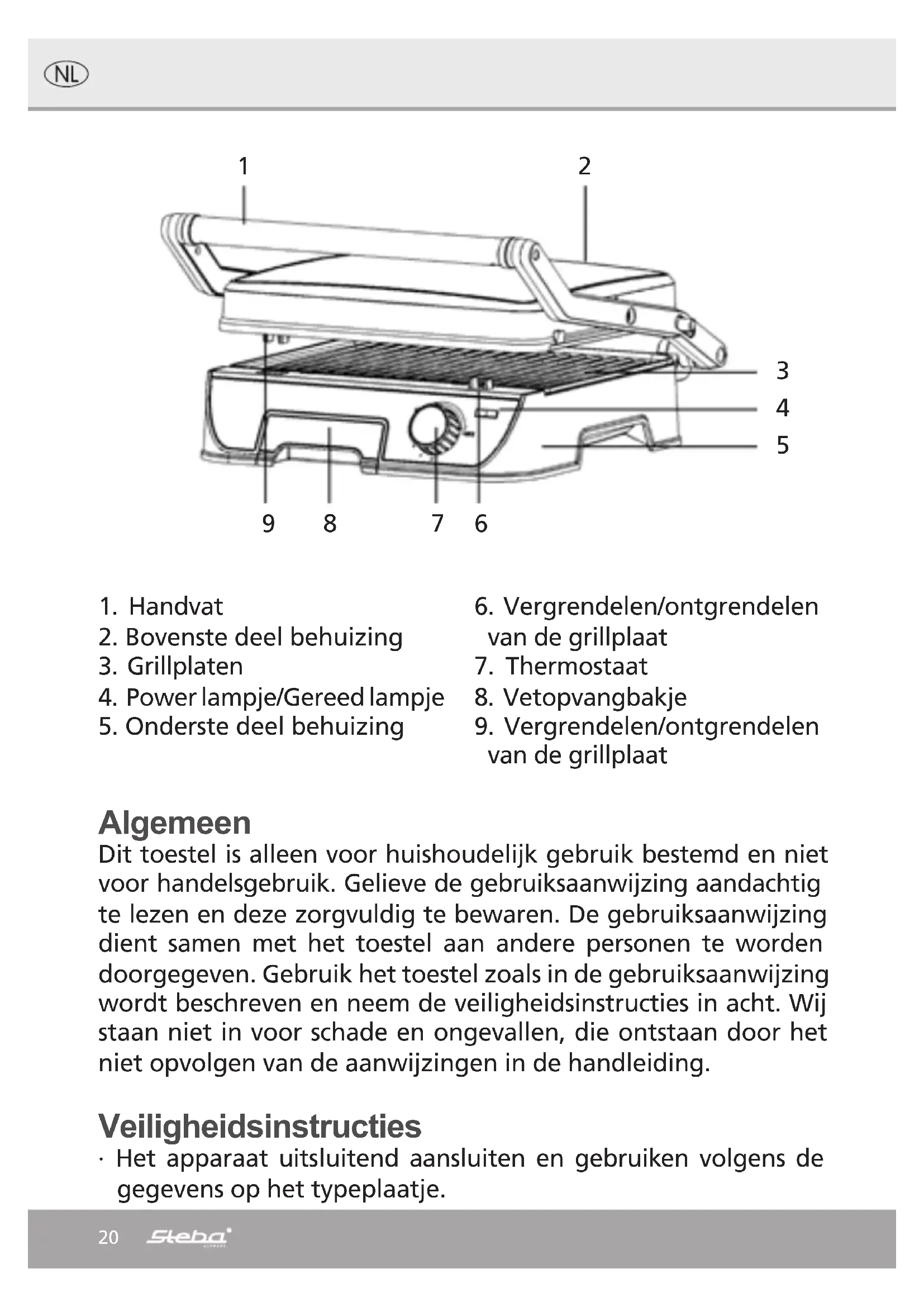 Waarschuwing! De buhuizing en de glazen deur wor- den heet: Verbrandingsgevaar. Plaats het apparaat niet op een kwetsbare ondergroud (bijvoorbeeld meubels met een laklaag) en houd het apparaat op een afstand van ten- minste 70 cm ten opzichte van brandbaar materiaal (bijvoorbe- eld gordijnen). ∙ Plaats het apparaat nooit op of naast een heet oppervlak (bijv. kookplaat), maar gebruik het alleen op een vlakke, stabiele en temperatuurbestendige ondergrond. Houd ontvlambare zaken altijd uit de buurt van het apparaat. Schoonmaak en onderhoud ∙ Maak het apparaat na ieder gebruik schoon. ∙ Trek de stekker altijd uit de wandcontactdoos vóór het schoon- maken. ∙ Laat het apparaat enigszins afkoelen, in lauw(warme) toestand kan het apparaat het best worden schoongemaakt. ∙ Dompel het apparaat nooit in water. ∙ Maak het apparaat schoon met een vochtige doek. Breng met een penseel wat olie aan op hardnekkige resten, laat het ap- paraat 5 minuten met rust en maak het vervolgens nog een keer schoon met een vochtige doek. Gebruik geen schuurmid- delen. Let er bij het schoonmaken van de vetopvang op dat de vloeistof die zich daarin bevindt is afgekoeld. ∙ Let op: De schakelklok schakelt het apparaat niet uit. Voor het eerste gebruik Vet de grilleerplaten voor het eerste gebruik een keer licht in. Warm vervolgens het apparaat met gesloten grilleerplaten zonder grilleerproducten op de maximale stand 10 minuten op. Wis de platen daarna met een vochtige doek af. Gebruik geen agressieve schoonmaakmiddelen om beschadiging van de anti-aanbaklaag te voor-komen.23 Toepassingsmogelijkheden Contactgrillen: Platen liggen direct op het te grillen voedsel. Overtollig vet loopt tot in de vetopvangschaal. Partygrillen: Beide grillplaten liggen horizontaal met dubbel grilloppervlak. Duw de schuif op de hendel opzij en open het apparaat. Aanbrengen van de platen: Het is het eenvoudigst om de platen in de stand te brengen. Pos 9 Fettablauf Pos6 Verwijderen van de grillplaten Laat het apparaat afkoelen en open het. Duw tegen de hendel voor de ontgrendeling (afb. 6/9)vandeplaatentildezeerondereenhoekuit. Plaatsen van de grillplaten Plaats de platen met de goot voor de vetafvoer naar achteren onder een hoek in de ver- grendeling(Pos6+9). Vóór het eerste gebruik Smeer het grilloppervlak vóór het eerste gebruik één keer lichtjes met vet in. Dan het ap- paraat tien minuten bij gesloten grilloppervlakken zonder te grillen voedsel en bij een maxi- male regelaarstand opwarmen. Daarna de platen met een vochtig doekje schoonvegen.24 Toebereiden van gerechten ∙ Sluit het apparaat overeenkomstig de gegevens op het typeplaatje aan. Het rode lampje brandt en geeft aan dat het apparaat is aangesloten. Door aan de thermostaatknop te draaien. ∙ Bij het eerste opwarmen kan er een geringe rookontwikkeling in het apparaat ontstaan. Dit verdwijnt echter na enkele minuten. ∙ Warm het apparaat met gesloten deksel, het groene lampje brandt. ∙ De ingestelde temperatuur is bereikt, het groene lampje is uit. ∙ Plaats de gerechten in het apparaat en sluit het deksel. ∙ Tijdens de grilleertijd kan het groene lampje uit- en weer inschakelen. Een teken dar de thermostaat functioneert. ∙ Haal de gerechten als ze klaar zijn met een spatel van hout of plastic uit het apparaat. Dit voorkomt dat de toplaag in het apparaat wordt beschadigd. ∙ Sluit altijd het deksel om warmteverlies te voorkomen. ∙ Als het groene lampje is uit kunnen er opnieuw toast- en grilleerproducten in het ap- paraat worden geplaatst. ∙ De betreffende grilleertijd en de temperatuurinstelling hangt af van: soort en dikte van het grilleerproduct, de gewenste bruiningsgraad en uw eigen smaak. Let op: Tijdens het grilleren van toast- en grilleerproducten kan er condens vrijkomen. Verbrandingsgevaar! Instelling temperatuur 140 °C warmhoudstand voor gevogelte nadat dit op 170° is aangebraden 150 °C warmhoudstand voor vlees nadat dit op MAX is aangebraden 170 °C aanbraden van gevogelte / vis / wild MAX aanbraden van licht en rood vlees25 Correcte afvalverwijdering van dit product: Versleten apparaten onmiddellijk onbruikbaar maken. Binnen de Europese Unie duidt dit symbool erop dat dit product niet samen met huishoudelijk afval verwijderd mag worden. Oude apparaten bevatten waardevolle, recycleerbare materialen, die aan recycling onderworpen moeten worden om het milieu c.q. de menselijke gezondheid niet door een ongecontroleerde afvalverwij- dering te schaden. Gelieve oude apparaten daarom via geschikte inzamelsystemen te verwijderen of het apparaat met het oog op de afvalverwijdering terug naar de afzender (waar u het product gekocht hebt) te zenden. De afzender zal dan het apparaat aan een stoffelijke recycling onderwerpen. Evacuatie van de verpakking Verpakkingsmateriaal niet gewoon wegwerpen, maar aan recycling onderwerpen. Verpakking van het apparaat: ∙ Verpakkingen van papier, karton en gegolfd karton in verzamelcentra voor oud papier afgeven. ∙ Onderdelen van kunststofverpakkingen en folie dienen eveneens in de daarvoor bestem- de verzamelbakken gedeponeerd te worden. In de voorbeelden voor de kunststofbenaming staat: PE voor polye- thyleen, het kencijfer 02 voor PE-HD, 04 voor PE-LD, PP voor polypropy- leen, PS voor polystyreen. Klantenserviceafdeling: Indien uw apparaat tegen de verwachting in dan toch al eens de klantenserviceafdeling nodig heeft, gelieve u dan tot onderstaand adres te richten. Wij zullen dan in geval van garantie voor de afhaling zorgen. Het apparaat moet transporteerbaar verpakt zijn. Ongefrankeerde pakjes kunnen niet aanvaard worden! STEBA Elektrogeräte GmbH & Co KG Pointstr.2,96129Strullendorf/Germany Verkopen-Tel.: 09543 / 449-17 / -18, Service-Tel.: 09543 / 449-44, Fax: 09543 / 449-19 e-Mail: elektro@steba.com Internet: http://www.steba.com Opgelet! Elektrische apparaten mogen uitsluitend door vakkundig geschoolde elektriciens gerepareerd worden, omdat er door ondeskundige reparaties aanzienlijke gevolgschade k