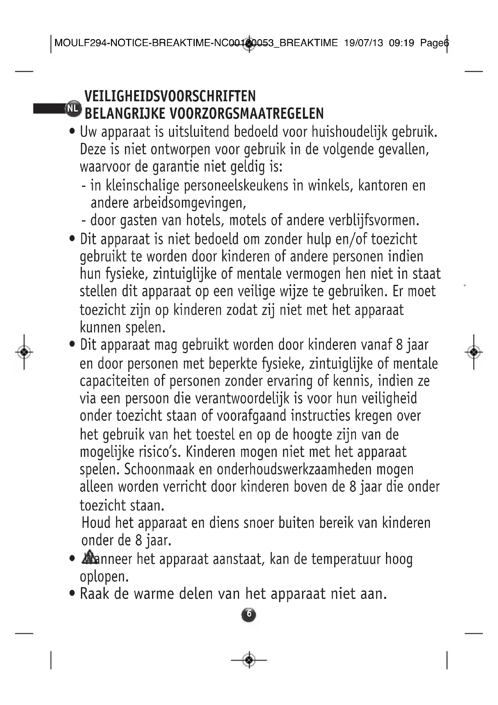 - Als iemand zich brandt, koel de brandplek dan gelijk met koud water en schakel, indien nodig, de hulp in van een huisarts. MOULF294-NOTICE-BREAKTIME-NC00120053_BREAKTIME 19/07/13 09:19 Page78