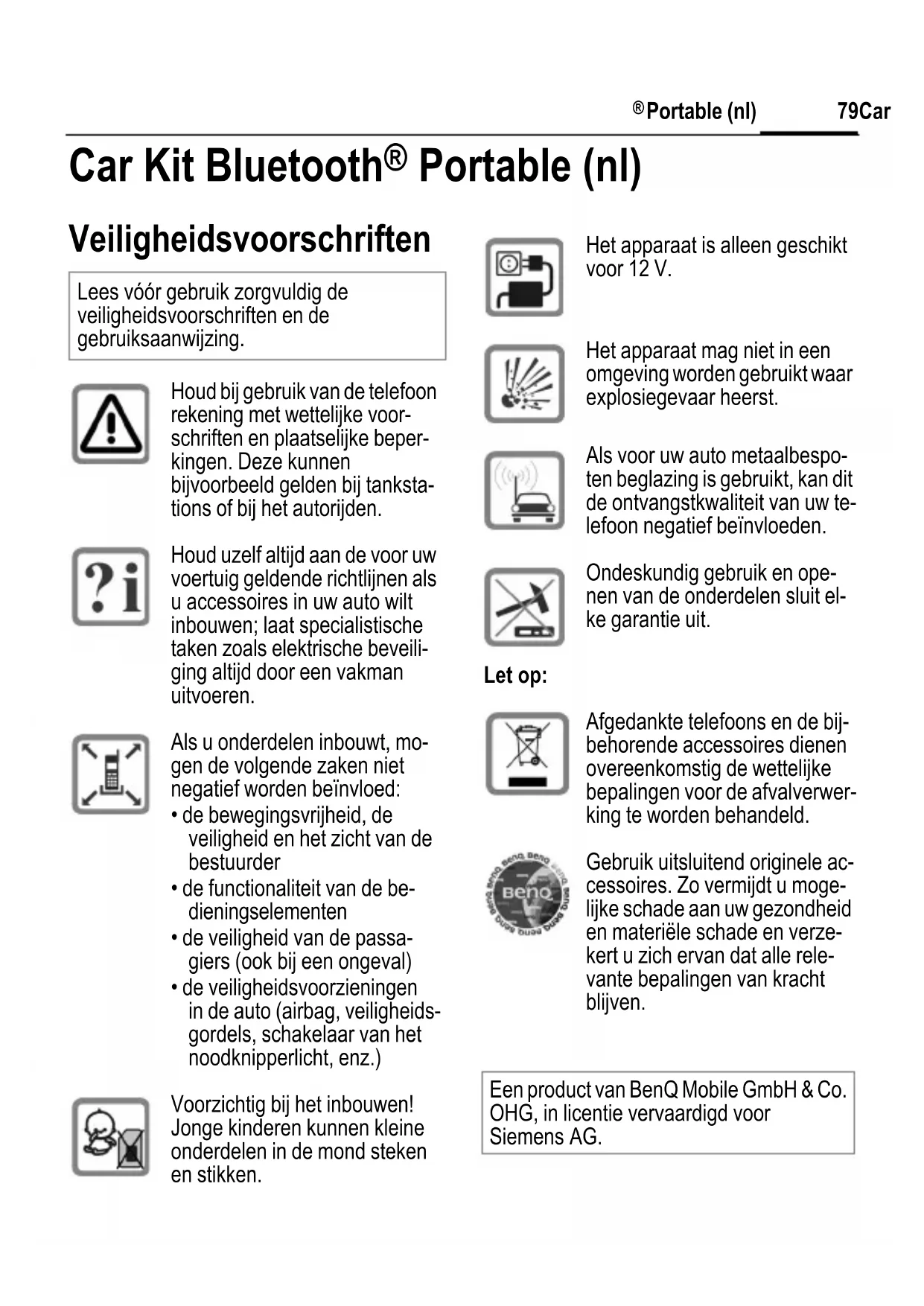 SIG, Inc. en in licentie gegeven aan BenQ Corp. Andere handelsmerken en -namen zijn eigendom van hun respectievelijke eigenaars. Gebruik geen verlengde stekker en geen stekkeradapter voor de montage, aange- zien in dergelijke gevallen niet gegaran- deerd kan worden dat de Car Kit goed vastzit.right page (81) of CKBP HKW-700 nl, A31008-H7421-A110-1-ZE19 (09.02.2006, 19:03) © Siemens AG 2003, Z:\Rust\Accessories\05GUW00118 CKBP Mikrofon Leaflet\Work\Satz\Frame und Grafik\HKW-700_nl.fm 81Car Kit Bluetooth