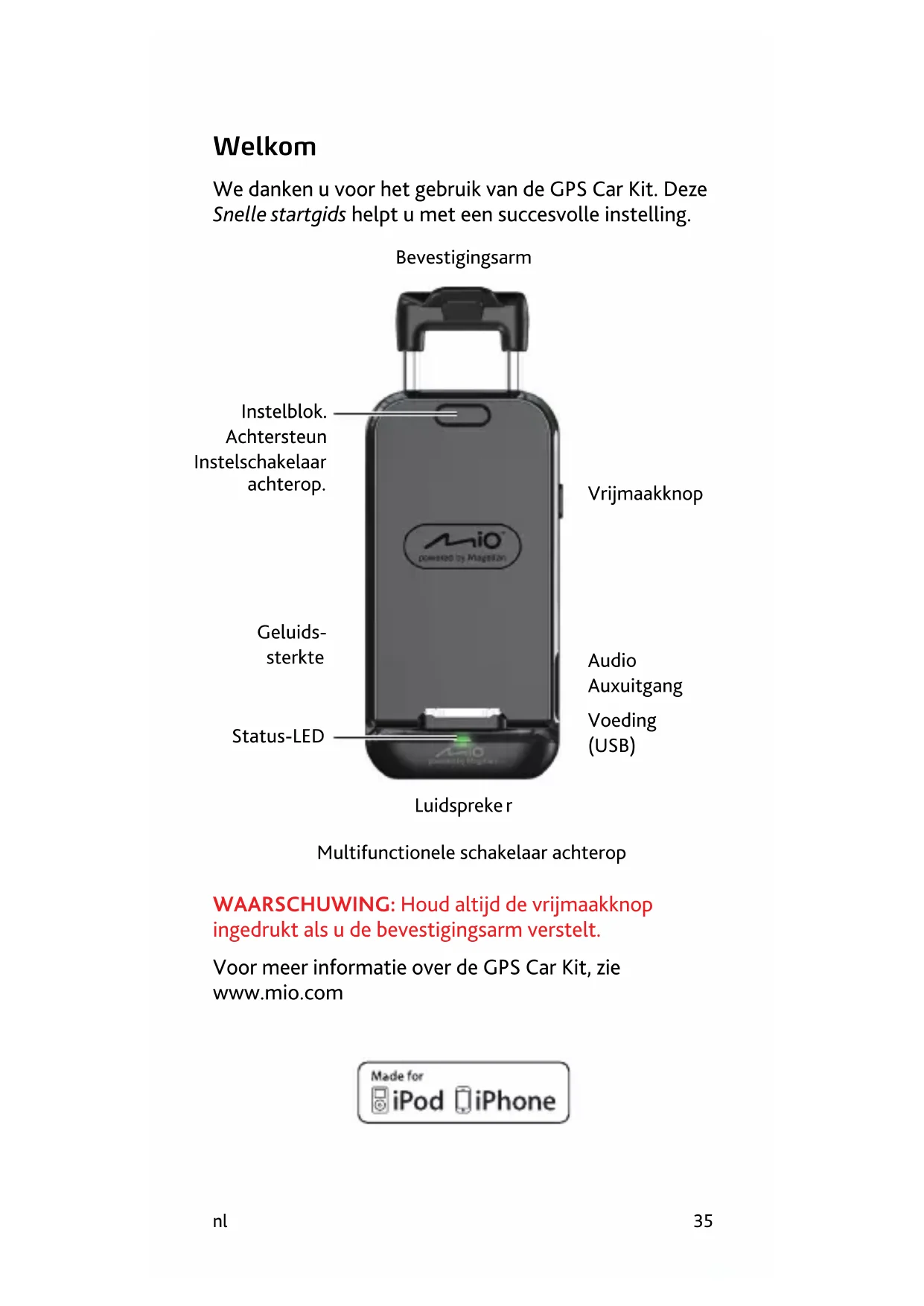 WAARSCHUWING: Houd altijd de vrijmaakknop ingedrukt als u de bevestigingsarm verstelt. Voor meer informatie over de GPS Car Kit, zie www.mio.com