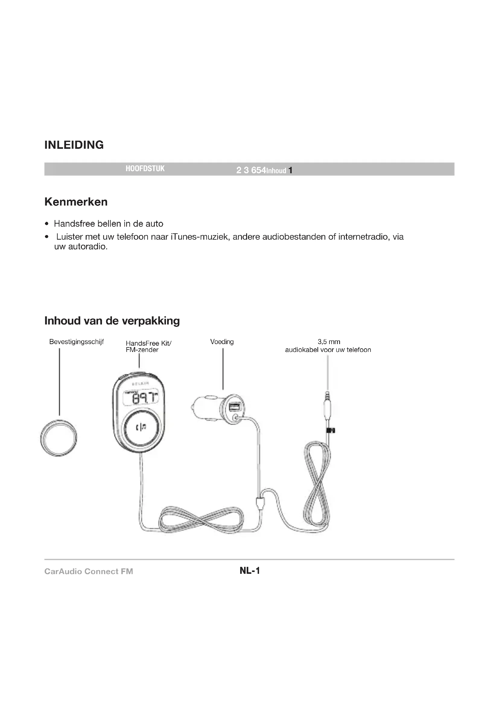 - Luister met uw telefoon naar iTunes-muziek, andere audiobestanden of internetradio, via uw autoradio. Inhoud van de verpakking BevestigingsschijfHandsFree Kit/ FM-zender3,5 mmaudiokabel voor uw telefoonVoedingCarAudio Connect FM NL-2 HOOFDSTUK 1 3 654Inhoud 2