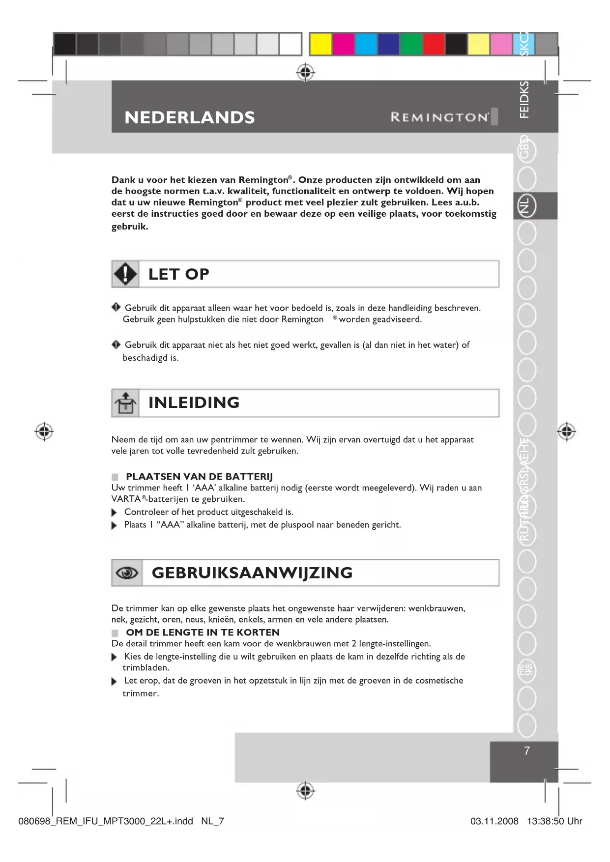 Dank u voor het kiezen van Remington . Onze producten zijn ontwikkeld om aan de hoogste normen t.a.v. kwaliteit, functionaliteit en ontwerp te voldoen. Wij hopen dat u uw nieuwe Remington product met veel plezier zult gebruiken. Lees a.u.b. eerst de instructies goed door en bewaar deze op een veilige plaats, voor toekomstig gebruik. LET OP Gebruik dit apparaat alleen waar het voor bedoeld is, zoals in deze handleiding beschreven. Gebruik geen hulpstukken die niet door Remington worden geadviseerd. Gebruik dit apparaat niet als het niet goed werkt, gevallen is (al dan niet in het water) of beschadigd is. INLEIDING Neem de tijd om aan uw pentrimmer te wennen. Wij zijn ervan overtuigd dat u het apparaat vele jaren tot volle tevredenheid zult gebruiken. PLAATSEN VAN DE BATTERIJUw trimmer heeft 1 ‘AAA’ alkaline batterij nodig (eerste wordt meegeleverd). Wij raden u aan VARTA -batterijen te gebruiken. Controleer of het product uitgeschakeld is. Plaats 1 “AAA” alkaline batterij, met de pluspool naar beneden gericht. GEBRUIKSAANWIJZING De trimmer kan op elke gewenste plaats het ongewenste haar verwijderen: wenkbrauwen, nek, gezicht, oren, neus, knieën, enkels, armen en vele andere plaatsen. OM DE LENGTE IN TE KORTENDe detail trimmer heeft een kam voor de wenkbrauwen met 2 lengte-instellingen. Kies de lengte-instelling die u wilt gebruiken en plaats de kam in dezelfde richting als de trimbladen. Let erop, dat de groeven in het opzetstuk in lijn zijn met de groeven in de cosmetische trimmer. 080698_REM_IFU_MPT3000_22L+.indd NL_7080698_REM_IFU_MPT3000_22L+.indd NL_7 03.11.2008 13:38:50 Uhr03.11.2008 13:38:50 UhrNEDERLANDS