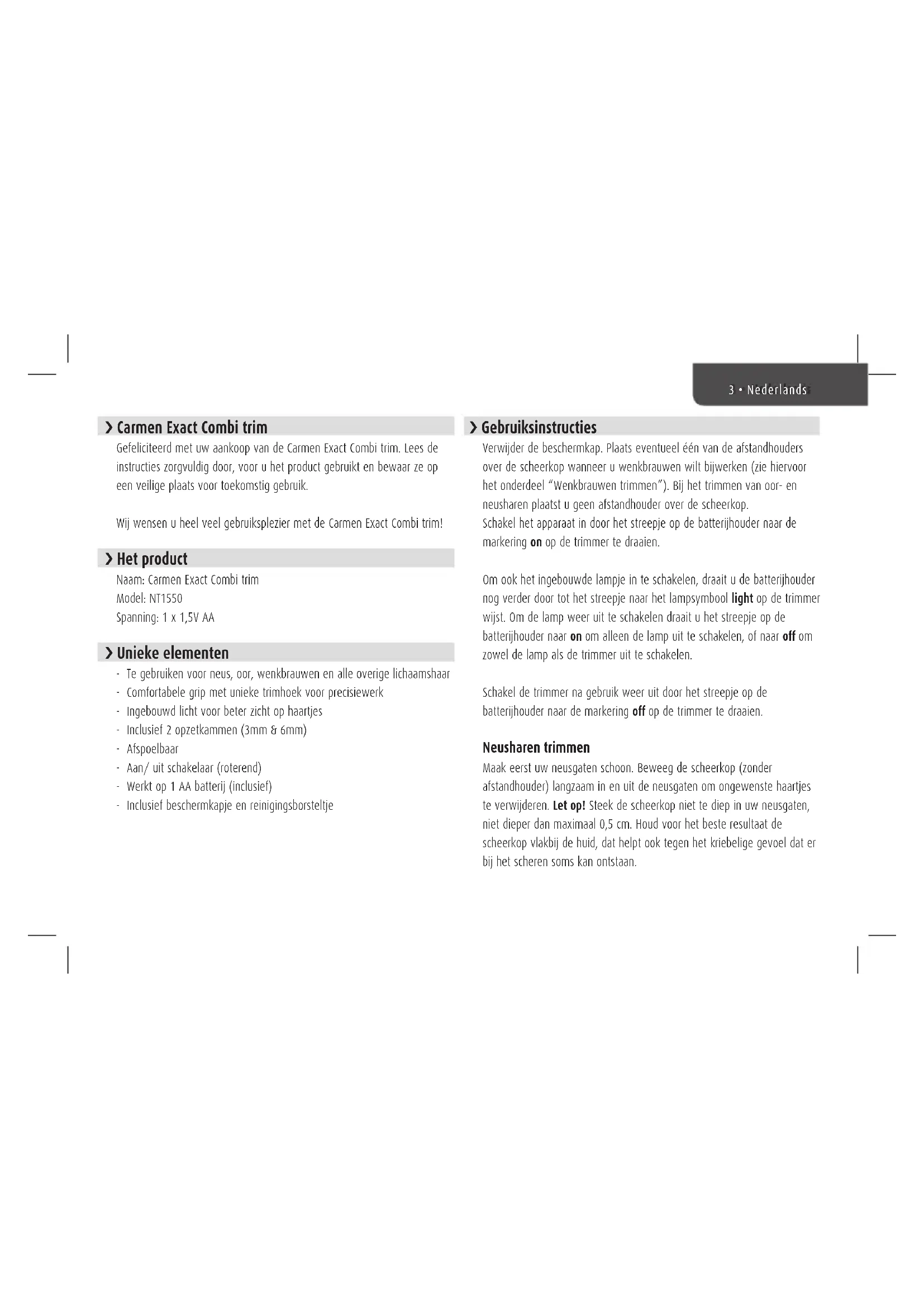 53 • Nederlands › Carmen Exact Combi trim Gefeliciteerd met uw aankoop van de Carmen Exact Combi trim. Lees de instructies zorgvuldig door, voor u het product gebruikt en bewaar ze op een veilige plaats voor toekomstig gebruik. Wij wensen u heel veel gebruiksplezier met de Carmen Exact Combi trim! › Het product Naam: Carmen Exact Combi trim Model: NT1550 Spanning: 1 x 1,5V AA › Unieke elementen - Te gebruiken voor neus, oor, wenkbrauwen en alle overige lichaamshaar - Comfortabele grip met unieke trimhoek voor precisiewerk - Ingebouwd licht voor beter zicht op haartjes - Inclusief 2 opzetkammen (3mm & 6mm) - Afspoelbaar - Aan/ uit schakelaar (roterend) - Werkt op 1 AA batterij (inclusief) - Inclusief beschermkapje en reinigingsborsteltje › Gebruiksinstructies Verwijder de beschermkap. Plaats eventueel één van de afstandhouders over de scheerkop wanneer u wenkbrauwen wilt bijwerken (zie hiervoor het onderdeel “Wenkbrauwen trimmen”). Bij het trimmen van oor- en neusharen plaatst u geen afstandhouder over de scheerkop. Schakel het apparaat in door het streepje op de batterijhouder naar de markering on op de trimmer te draaien. Om ook het ingebouwde lampje in te schakelen, draait u de batterijhouder nog verder door tot het streepje naar het lampsymbool light op de trimmer wijst. Om de lamp weer uit te schakelen draait u het streepje op de batterijhouder naar on om alleen de lamp uit te schakelen, of naar off om zowel de lamp als de trimmer uit te schakelen. Schakel de trimmer na gebruik weer uit door het streepje op de batterijhouder naar de markering off op de trimmer te draaien. Neusharen trimmen Maak eerst uw neusgaten schoon. Beweeg de scheerkop (zonder afstandhouder) langzaam in en uit de neusgaten om ongewenste haartjes te verwijderen. Let op! Steek de scheerkop niet te diep in uw neusgaten, niet dieper dan maximaal 0,5 cm. Houd voor het beste resultaat de scheerkop vlakbij de huid, dat helpt ook tegen het kriebelige gevoel dat er bij het scheren soms kan ontstaan.4 • Nederlands Oorharen trimmen Reinig uw oorschelp en verwijder overtollig oorsmeer. Schakel de trimmer in. Houd de trimmer in uw ene hand en trek met uw andere hand uw oorschelp iets omhoog en naar achteren. Ga nu met de scheerkop langs de zichtbare haartjes aan de buitenkant van het oor. Beweeg de scheerkop voorzichtig in en uit de gehoorgang (ga nooit dieper dan 0,5 cm om beschadiging van uw oor te voorkomen). Wenkbrauwen trimmen Plaats een afstandhouder op de scheerkop. Let daarbij goed op, want hij past maar op één manier over de aangebrachte sleuven. We raden u aan om met de grootste afstandhouder te beginnen (6 mm) en om desgewenst daarna de kleinste (3 mm) te gebruiken. Start de trimmer door de batterijhouder rond te draaien tot het streepje naar de on wijst die op de trimmer staat. Beweeg de scheerkop met de afstandhouder langs uw wenkbrauwen van buiten naar binnen, d.w.z. in de richting van de neus. Let op: Werk met deze trimmer nooit uw wimpers bij. Schakel de trimmer na gebruik weer uit door de batterijhouder rond te draaien tot het streepje naar de off wijst die op de trimmer staat. Trek de afstandhouder omhoog om hem van de scheerkop te verwijderen. Batterij vervangen Draai de batterijhouder rond tot het streepje op de batterijhouder wijst naar de twee pijltjes op de trimmer. Trek de batterijhouder omlaag om hem van de trimmer te verwijderen. Plaats één 1,5 V AAA-batterij in de aangegeven richting in de batterijhouder. Duw de batterijhouder weer tegen de trimmer en draai hem rond tot het streepje op de batterijhouder naar de off wijst die op de trimmer staat. Vervang de batterij wanneer het apparaat veel trager begint te werken