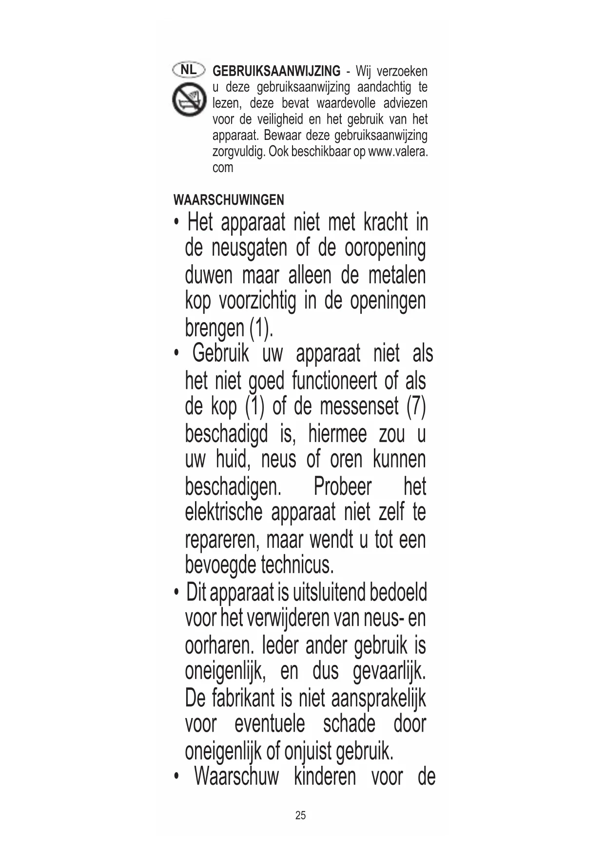 - Dit apparaat is uitsluitend bedoeld voor het verwijderen van neus- en oorharen. Ieder ander gebruik is oneigenlijk, en dus gevaarlijk. De fabrikant is niet aansprakelijk voor eventuele schade door oneigenlijk of onjuist gebruik.