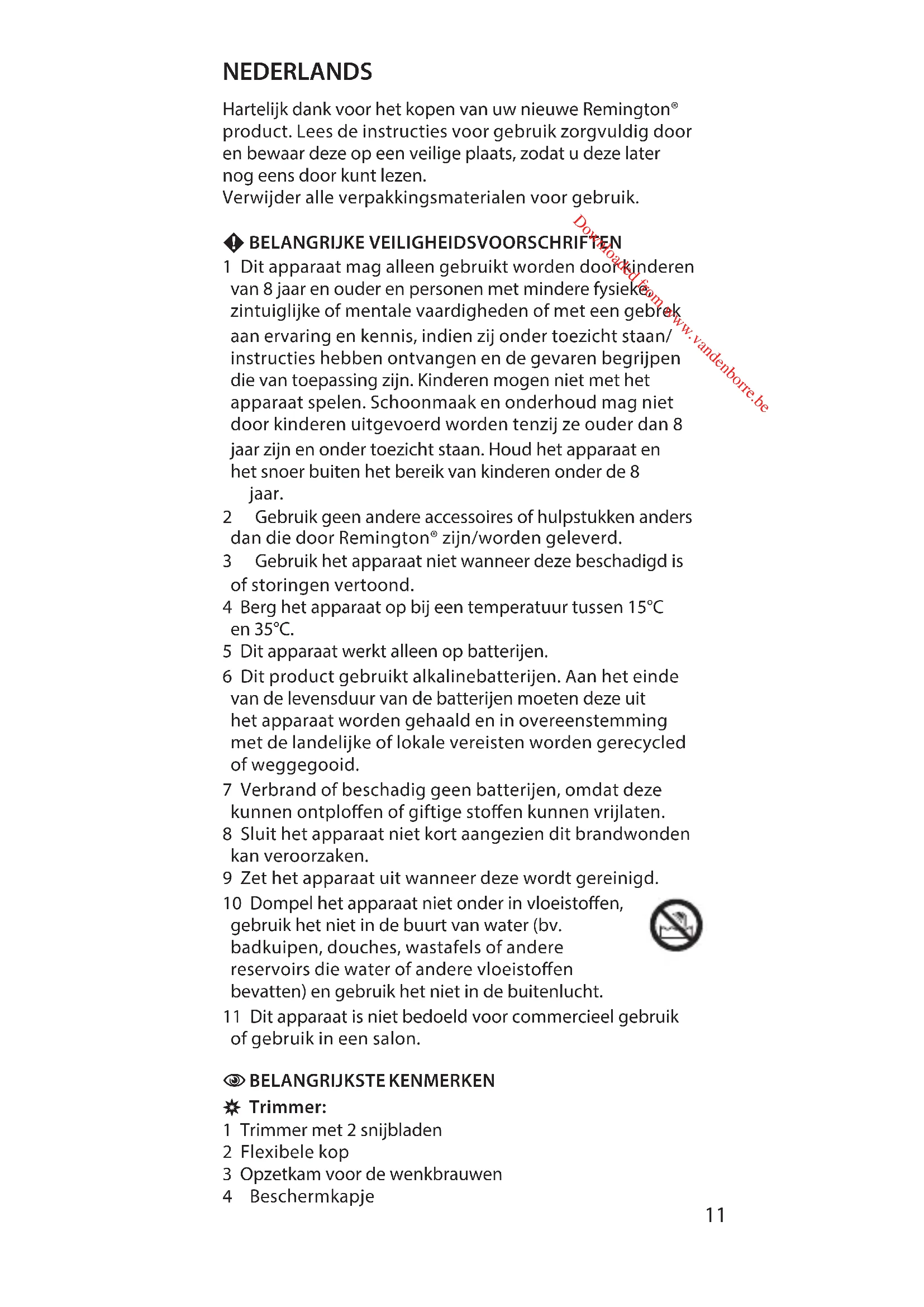 Downloaded from www.vandenborre.beHartelijk dank voor het kopen van uw nieuwe Remington® product. Lees de instructies voor gebruik zorgvuldig door en bewaar deze op een veilige plaats, zodat u deze later nog eens door kunt lezen. Verwijder alle verpakkingsmaterialen voor gebruik.