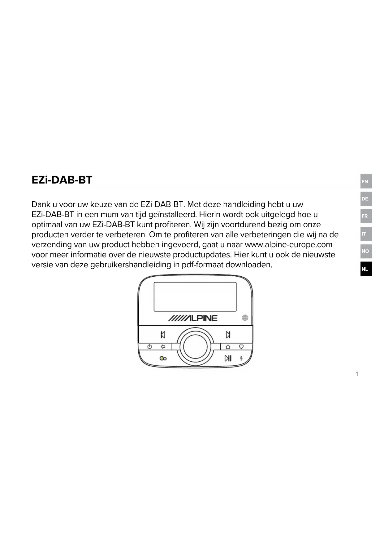 Dank u voor uw keuze van de EZi-DAB-BT. Met deze handleiding hebt u uw EZi-DAB-BT in een mum van tijd geïnstalleerd. Hierin wordt ook uitgelegd hoe u optimaal van uw EZi-DAB-BT kunt profiteren. Wij zijn voortdurend bezig om onze producten verder te verbeteren. Om te profiteren van alle verbeteringen die wij na de verzending van uw product hebben ingevoerd, gaat u naar www.alpine-europe.com voor meer informatie over de nieuwste productupdates. Hier kunt u ook de nieuwste versie van deze gebruikershandleiding in pdf-formaat downloaden. EZi-DAB-BT2 Veiligheidsaanwijzingen