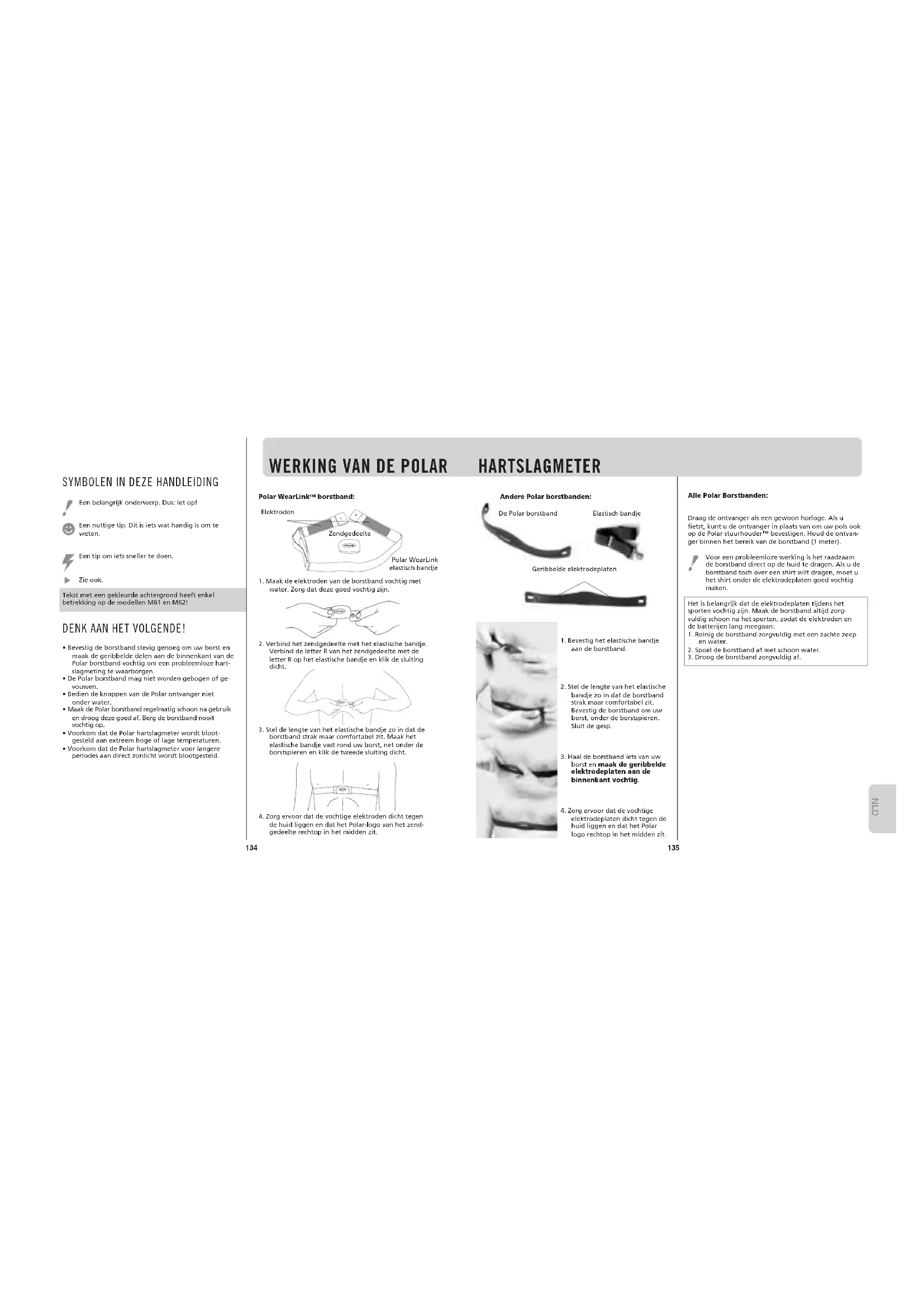 elektrodeplaten dicht tegen de huid liggen en dat het Polar logo rechtop in het midden zit. Andere Polar borstbanden: Draag de ontvanger als een gewoon horloge. Als u fietst, kunt u de ontvanger in plaats van om uw pols ook op de Polar stuurhouder™ bevestigen. Houd de ontvan- ger binnen het bereik van de borstband (1 meter). Voor een probleemloze werking is het raadzaam de borstband direct op de huid te dragen. Als u de borstband toch over een shirt wilt dragen, moet u het shirt onder de elektrodeplaten goed vochtig maken. Het is belangrijk dat de elektrodeplaten tijdens het sporten vochtig zijn. Maak de borstband altijd zorg- vuldig schoon na het sporten, zodat de elektroden en de batterijen lang meegaan:
