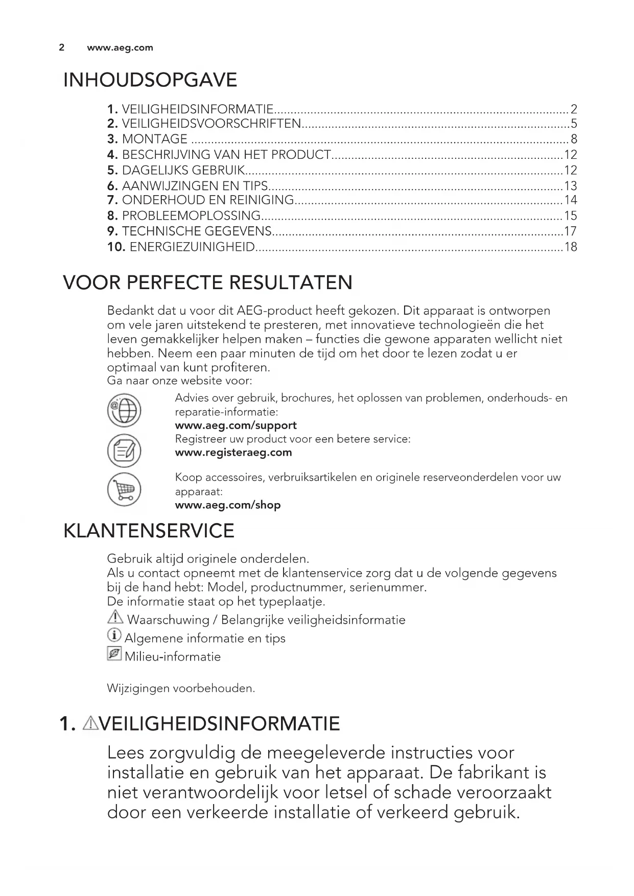 Bedankt dat u voor dit AEG-product heeft gekozen. Dit apparaat is ontworpen om vele jaren uitstekend te presteren, met innovatieve technologieën die het leven gemakkelijker helpen maken – functies die gewone apparaten wellicht niet hebben. Neem een paar minuten de tijd om het door te lezen zodat u er optimaal van kunt profiteren. Ga naar onze website voor: Advies over gebruik, brochures, het oplossen van problemen, onderhouds- en reparatie-informatie: www.aeg.com/support Registreer uw product voor een betere service: www.registeraeg.com Koop accessoires, verbruiksartikelen en originele reserveonderdelen voor uw apparaat: www.aeg.com/shop KLANTENSERVICE Gebruik altijd originele onderdelen. Als u contact opneemt met de klantenservice zorg dat u de volgende gegevens bij de hand hebt: Model, productnummer, serienummer. De informatie staat op het typeplaatje. Waarschuwing / Belangrijke veiligheidsinformatie Algemene informatie en tips Milieu‑informatie Wijzigingen voorbehouden.