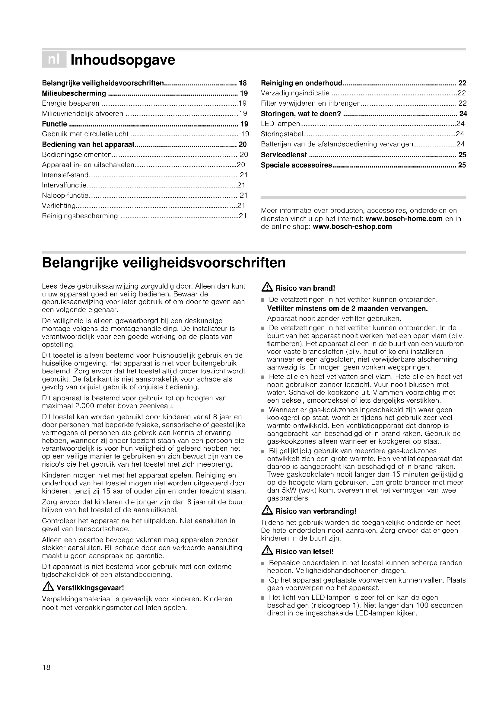 - Speciale accessoires Produktinfo Meer informatie over producten, accessoires, onderdelen en diensten vindt u op het internet: www.bosch-home.com en in de online-shop: www.bosch-eshop.com Belangrijke veiligheidsvoorschriften Lees deze gebruiksaanwijzing zorgvuldig door. Alleen dan kunt u uw apparaat goed en veilig bedienen. Bewaar de gebruiksaanwijzing voor later gebruik of om door te geven aan een volgende eigenaar. De veiligheid is alleen gewaarborgd bij een deskundige montage volgens de montagehandleiding. De installateur is verantwoordelijk voor een goede werking op de plaats van opstelling. Dit toestel is alleen bestemd voor huishoudelijk gebruik en de huiselijke omgeving. Het apparaat is niet voor buitengebruik bestemd. Zorg ervoor dat het toestel altijd onder toezicht wordt gebruikt. De fabrikant is niet aansprakelijk voor schade als gevolg van onjuist gebruik of onjuiste bediening. Dit apparaat is bestemd voor gebruik tot op hoogten van maximaal 2.000 meter boven zeeniveau. Dit toestel kan worden gebruikt door kinderen vanaf 8 jaar en door personen met beperkte fysieke, sensorische of geestelijke vermogens of personen die gebrek aan kennis of ervaring hebben, wanneer zij onder toezicht staan van een persoon die verantwoordelijk is voor hun veiligheid of geleerd hebben het op een veilige manier te gebruiken en zich bewust zijn van de risico's die het gebruik van het toestel met zich meebrengt. Kinderen mogen niet met het apparaat spelen. Reiniging en onderhoud van het toestel mogen niet worden uitgevoerd door kinderen, tenzij zij 15 aar of ouder zijn en onder toezicht staan. Zorg ervoor dat kinderen die jonger zijn dan 8 jaar uit de buurt blijven van het toestel of de aansluitkabel. Controleer het apparaat na het uitpakken. Niet aansluiten in geval van transportschade. Alleen een daartoe bevoegd vakman mag apparaten zonder stekker aansluiten. Bij schade door een verkeerde aansluiting maakt u geen aanspraak op garantie. Dit apparaat is niet bestemd voor gebruik met een externe tijdschakelklok of een afstandbediening. : Verstikkingsgevaar! Verpakkingsmateriaal is gevaarlijk voor kinderen. Kinderen nooit met verpakkingsmateriaal laten spelen. : Risico van brand! ■ De vetafzettingen in het vetfilter kunnen ontbranden. Vetfilter minstens om de 2 maanden vervangen. Apparaat nooit zonder vetfilter gebruiken. Brandgevaar!■ De vetafzettingen in het vetfilter kunnen ontbranden. In de buurt van het apparaat nooit werken met een open vlam (bijv. flamberen). Het apparaat alleen in de buurt van een vuurbron voor vaste brandstoffen (bijv. hout of kolen) installeren wanneer er een afgesloten, niet verwijderbare afscherming aanwezig is. Er mogen geen vonken wegspringen. Risico van brand!■ Hete olie en heet vet vatten snel vlam. Hete olie en heet vet nooit gebruiken zonder toezicht. Vuur nooit blussen met water. Schakel de kookzone uit. Vlammen voorzichtig met een deksel, smoordeksel of iets dergelijks verstikken. Brandgevaar!■ Wanneer er gas-kookzones ingeschakeld zijn waar geen kookgerei op staat, wordt er tijdens het gebruik zeer veel warmte ontwikkeld. Een ventilatieapparaat dat daarop is aangebracht kan beschadigd of in brand raken. Gebruik de gas-kookzones alleen wanneer er kookgerei op staat. Brandgevaar!■ Bij gelijktijdig gebruik van meerdere gas-kookzones ontwikkelt zich een grote warmte. Een ventilatieapparaat dat daarop is aangebracht kan beschadigd of in brand raken. Twee gaskookplaten nooit langer dan 15 minuten gelijktijdig op de hoogste vlam gebruiken. Een grote brander met meer dan 5kW (wok) komt overeen met het vermogen van twee gasbranders. : Risico van verbranding! Tijdens het gebruik worden de toegankelijke onderdelen heet. De hete onderdelen nooit aanraken. Zorg ervoor dat er geen kinderen in de buurt zijn. : Risico van letsel! ■ Bepaalde onderdelen in het toestel kunnen scherpe randen hebben. Veiligheidshandschoenen dragen. Risico van letsel!■ Op het apparaat geplaatste voorwerpen kunnen vallen. Plaats geen voorwerpen op het apparaat. Risico van letsel!■ Het licht van LED-lampen is zeer fel en kan de ogen beschadigen (risicogroep 1). Niet langer dan 100 seconden direct in de ingeschakelde LED-lampen kijken.19 : Kans op een elektrische schok! ■ Een defect toestel kan een schok veroorzaken. Een defect toestel nooit inschakelen. De netstekker uit het stopcontact halen of de zekering in de meterkast uitschakelen. Contact opnemen met de klantenservice. Kans op een elektrische schok! ■ Ondeskundige reparaties zijn gevaarlijk. Reparaties en de vervanging van beschadigde aansluitleidingen mogen uitsluitend worden uitgevoerd door technici die zijn geïnstrueerd door de klantenservice. Is het apparaat defect, haal dan de stekker uit het stopcontact of schakel de zekering in de meterkast uit. Contact opnemen met de klantenservice. Kans op een elektrische schok! ■ Binnendringend vocht kan een schok veroorzaken. Geen hogedrukreiniger of stoomreiniger gebruiken. Oorzaken van schade Attentie! Risico van beschadiging door corrosie. Schakel het apparaat wanneer u kookt altijd in om condensvorming te voorkomen. Condenswater kan leiden tot corrosie. Risico van beschadiging doordat er vocht in de elektronica van het apparaat komt. Reinig de bedieningselementen nooit met een natte doek. Beschadiging van het oppervlak door een foutieve manier van reinigen. Roestvrijstalen oppervlakken uitsluitend reinigen in de slijprichting. Gebruik voor de bedieningselementen geen reinigingsmiddel voor roestvrij staal. Beschadiging van het oppervlak door scherpe of schurende reinigingsmiddelen. Gebruik nooit scherpe of schurende reinigingsmiddelen. Beschadigingsgevaar door condensaat-terugloop. Luchtafvoerkanaal vanuit het apparaat licht hellend installeren (1° verloop). Milieubescherming Uw nieuwe apparaat is bijzonder energie-efficiënt. Hier krijgt u tips over de manier waarop u bij het gebruik van uw apparaat nog meer kunt besparen op energie en het apparaat op de juiste manier afvoert