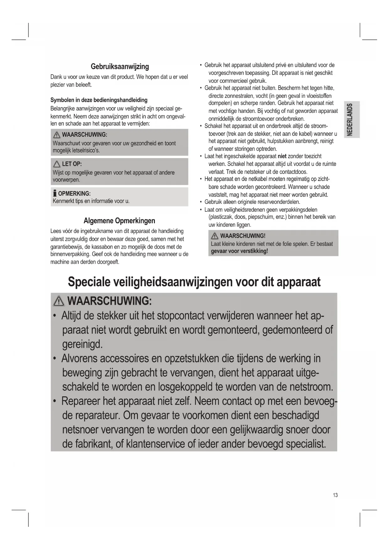 - Laat het ingeschakelde apparaat niet zonder toezicht werken. Schakel het apparaat altijd uit voordat u de ruimte verlaat. Trek de netsteker uit de contactdoos.