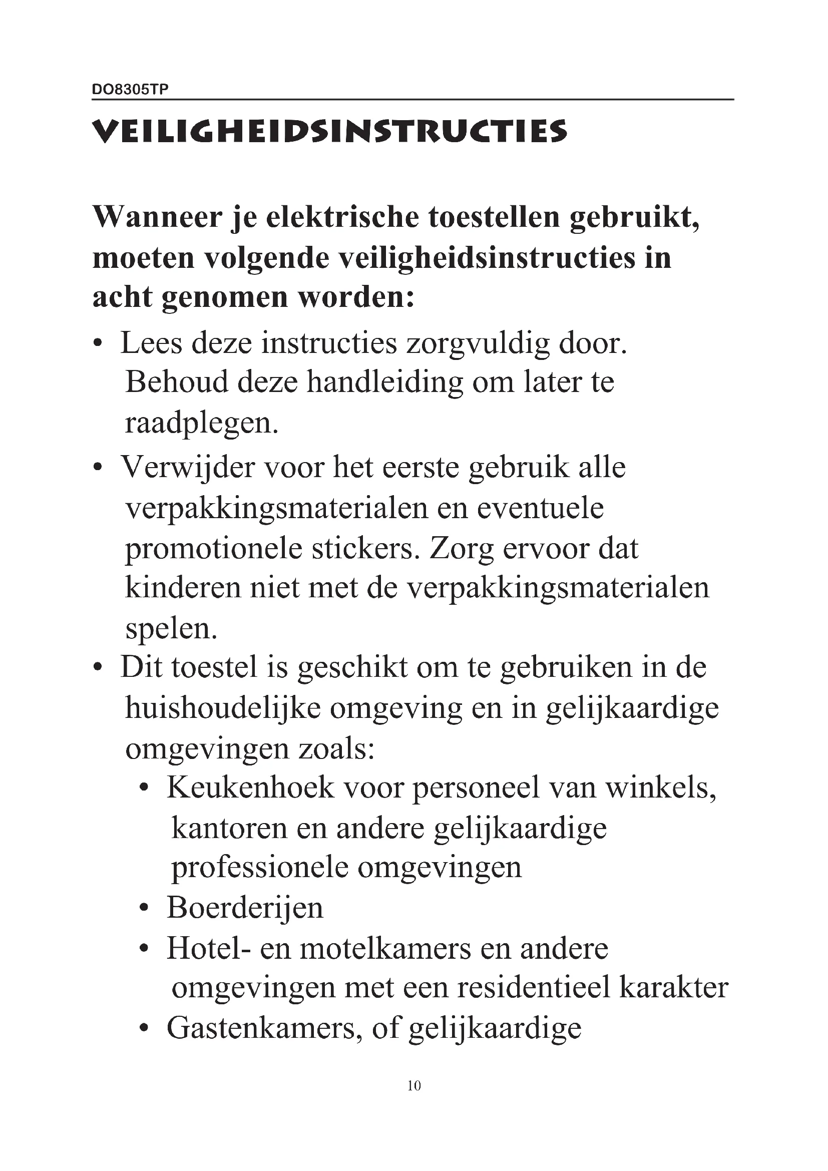 - Dit toestel mag gebruikt worden door kinderen vanaf 16 jaar en personen met een fysieke of sensoriële beperking of mensen met een beperkte mentale capaciteit of gebrek aan ervaring of kennis, op voorwaarde dat deze personen toezicht krijgen of instructies hebben gekregen over het gebruik van het toestel op een veilige manier en dat ze ook de gevaren kennen bij het gebruik van het toestel. Kinderen mogen niet met het toestel spelen. Het onderhoud en de reiniging van het toestel mag niet door kinderen gebeuren tenzij ze ouder zijn dan 8DO8305TP