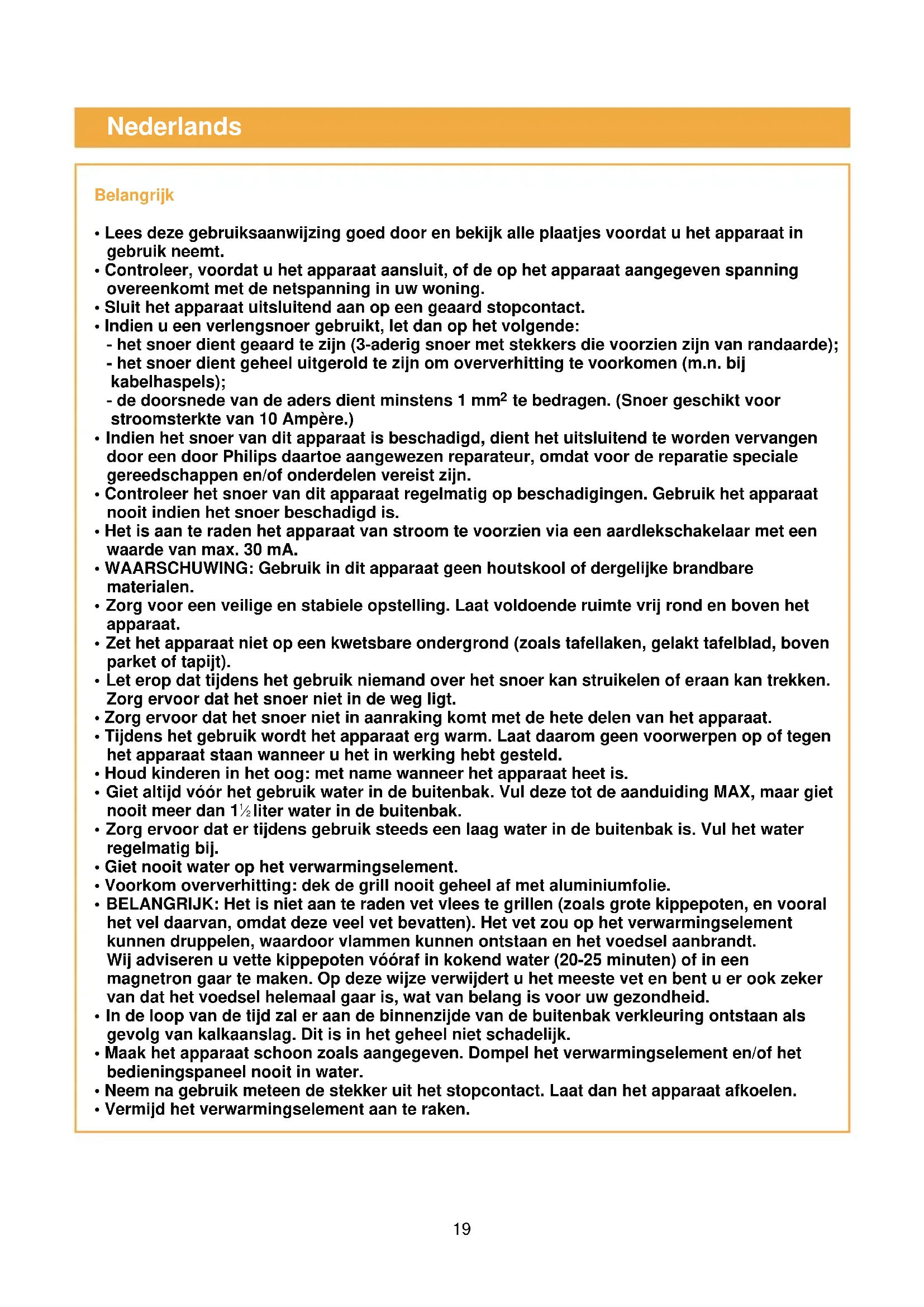 - BELANGRIJK: Het is Niet aan te raden vet vlees te grillen (zoals großekippepoten, en vooral het vel waarvan, omdat deze Veel vet bevatten). Het vet zou op het verwarmingselement kunnen druppelen, waardoor vlammen kunnen ontstaan en het voedsel aanbrandt.