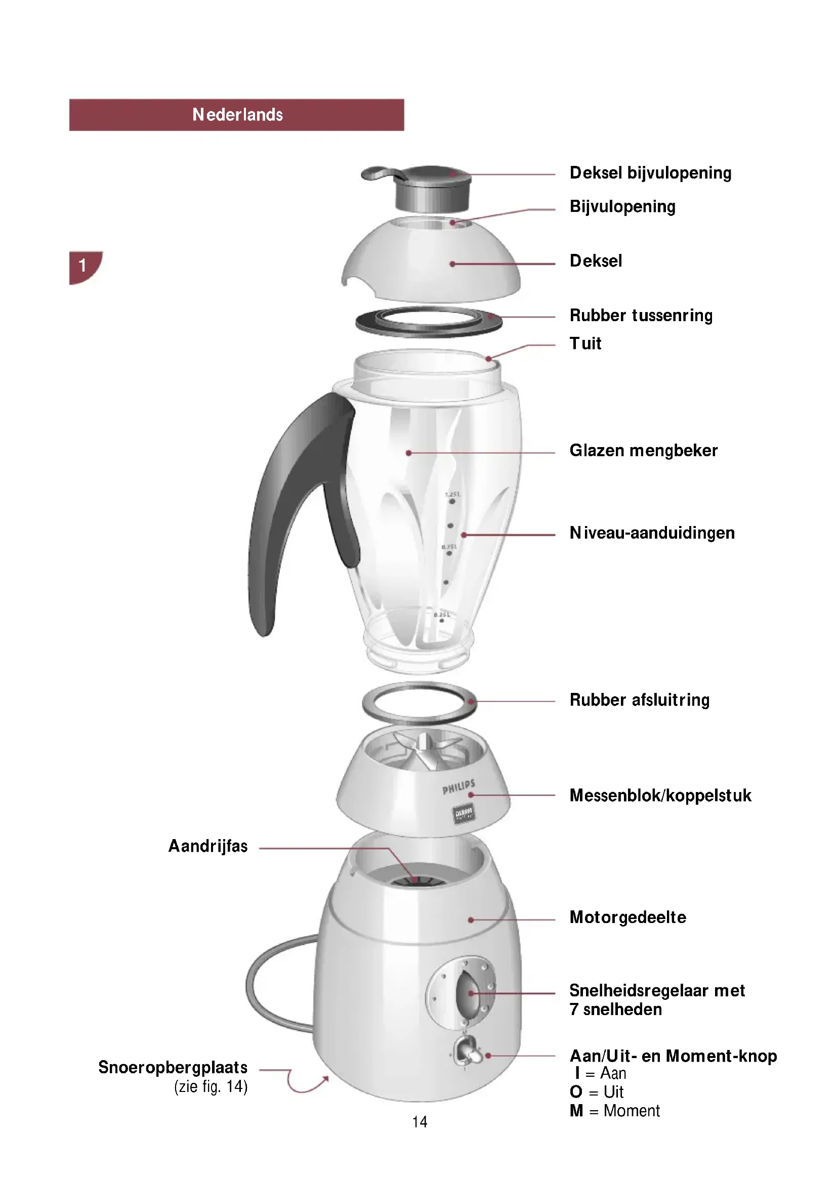 Deksel bijvulopening Bijvulopening Deksel Rubber tussenring Tuit Glazen mengbeker Niveau-aanduidingen Rubber afsluitring Messenblok/koppelstuk Aandrijfas Motorgedeelte Snelheidsregelaar met 7 snelheden Aan/Uit- en Moment-knop I = Aan O = Uit M = Moment Snoeropbergplaats (zie fig. 14) 14Philips en Alessi werkten samen om een unieke reeks elektrische apparaten voor de keuken te creëren, waarbij vorm en functie optimaal zijn gecombineerd.