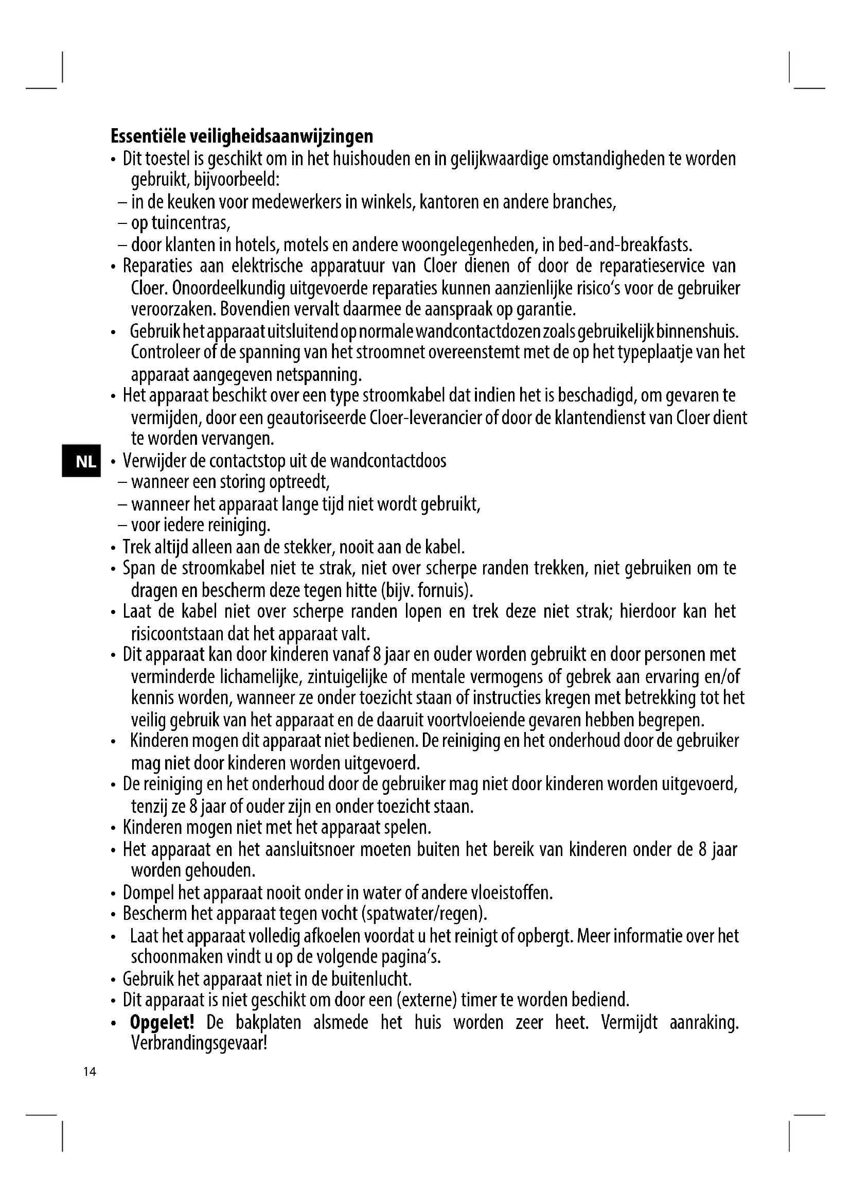 - Opgelet! De bakplaten alsmede het huis worden zeer heet. Vermijdt aanraking. Verbrandingsgevaar! NL15