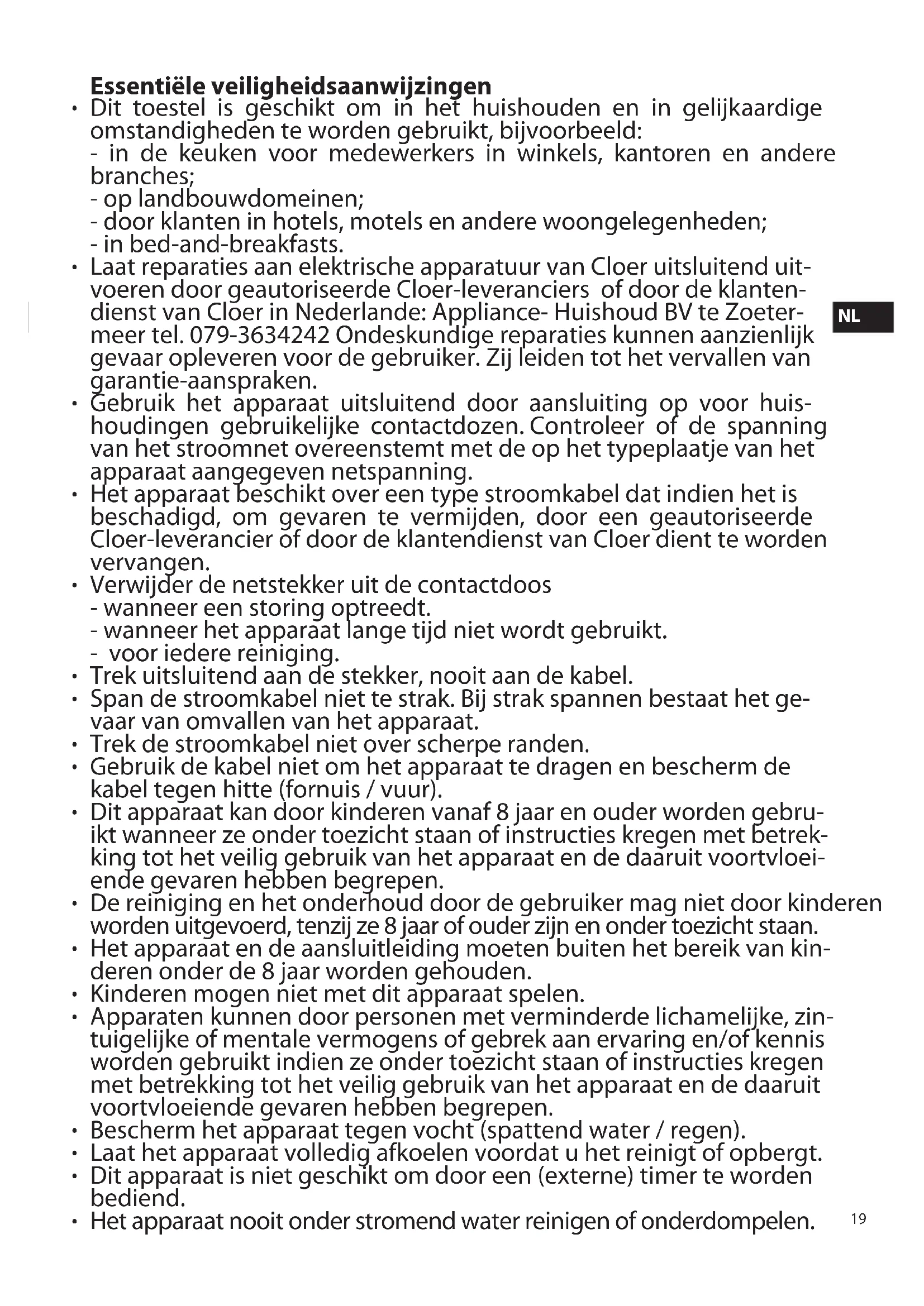 - 19 Essentiële veiligheidsaanwijzingen Dit toestel is geschikt om in het huishouden en in gelijkaardige omstandigheden te worden gebruikt, bijvoorbeeld: - in de keuken voor medewerkers in winkels, kantoren en andere branches; - op landbouwdomeinen; - door klanten in hotels, motels en andere woongelegenheden; - in bed-and-breakfasts. Laat reparaties aan elektrische apparatuur van Cloer uitsluitend uit- voeren door geautoriseerde Cloer-leveranciers of door de klanten- dienst van Cloer in Nederlande: Appliance- Huishoud BV te Zoeter- meer tel. 079-3634242 Ondeskundige reparaties kunnen aanzienlijk gevaar opleveren voor de gebruiker. Zij leiden tot het vervallen van garantie-aanspraken. Gebruik het apparaat uitsluitend door aansluiting op voor huis- houdingen gebruikelijke contactdozen. Controleer of de spanning van het stroomnet overeenstemt met de op het typeplaatje van het apparaat aangegeven netspanning. Het apparaat beschikt over een type stroomkabel dat indien het is beschadigd, om gevaren te vermijden, door een geautoriseerde Cloer-leverancier of door de klantendienst van Cloer dient te worden vervangen. Verwijder de netstekker uit de contactdoos - wanneer een storing optreedt. - wanneer het apparaat lange tijd niet wordt gebruikt. - voor iedere reiniging. Trek uitsluitend aan de stekker, nooit aan de kabel. Span de stroomkabel niet te strak. Bij strak spannen bestaat het ge- vaar van omvallen van het apparaat. Trek de stroomkabel niet over scherpe randen. Gebruik de kabel niet om het apparaat te dragen en bescherm de kabel tegen hitte (fornuis / vuur). Dit apparaat kan door kinderen vanaf 8 jaar en ouder worden gebru- ikt wanneer ze onder toezicht staan of instructies kregen met betrek- king tot het veilig gebruik van het apparaat en de daaruit voortvloei- ende gevaren hebben begrepen. De reiniging en het onderhoud door de gebruiker mag niet door kinderen worden uitgevoerd, tenzij ze 8 jaar of ouder zijn en onder toezicht staan. Het apparaat en de aansluitleiding moeten buiten het bereik van kin- deren onder de 8 jaar worden gehouden. Kinderen mogen niet met dit apparaat spelen. Apparaten kunnen door personen met verminderde lichamelijke, zin- tuigelijke of mentale vermogens of gebrek aan ervaring en/of kennis worden gebruikt indien ze onder toezicht staan of instructies kregen met betrekking tot het veilig gebruik van het apparaat en de daaruit voortvloeiende gevaren hebben begrepen. Bescherm het apparaat tegen vocht (spattend water / regen). Laat het apparaat volledig afkoelen voordat u het reinigt of opbergt. Dit apparaat is niet geschikt om door een (externe) timer te worden bediend. Het apparaat nooit onder stromend water reinigen of onderdompelen.