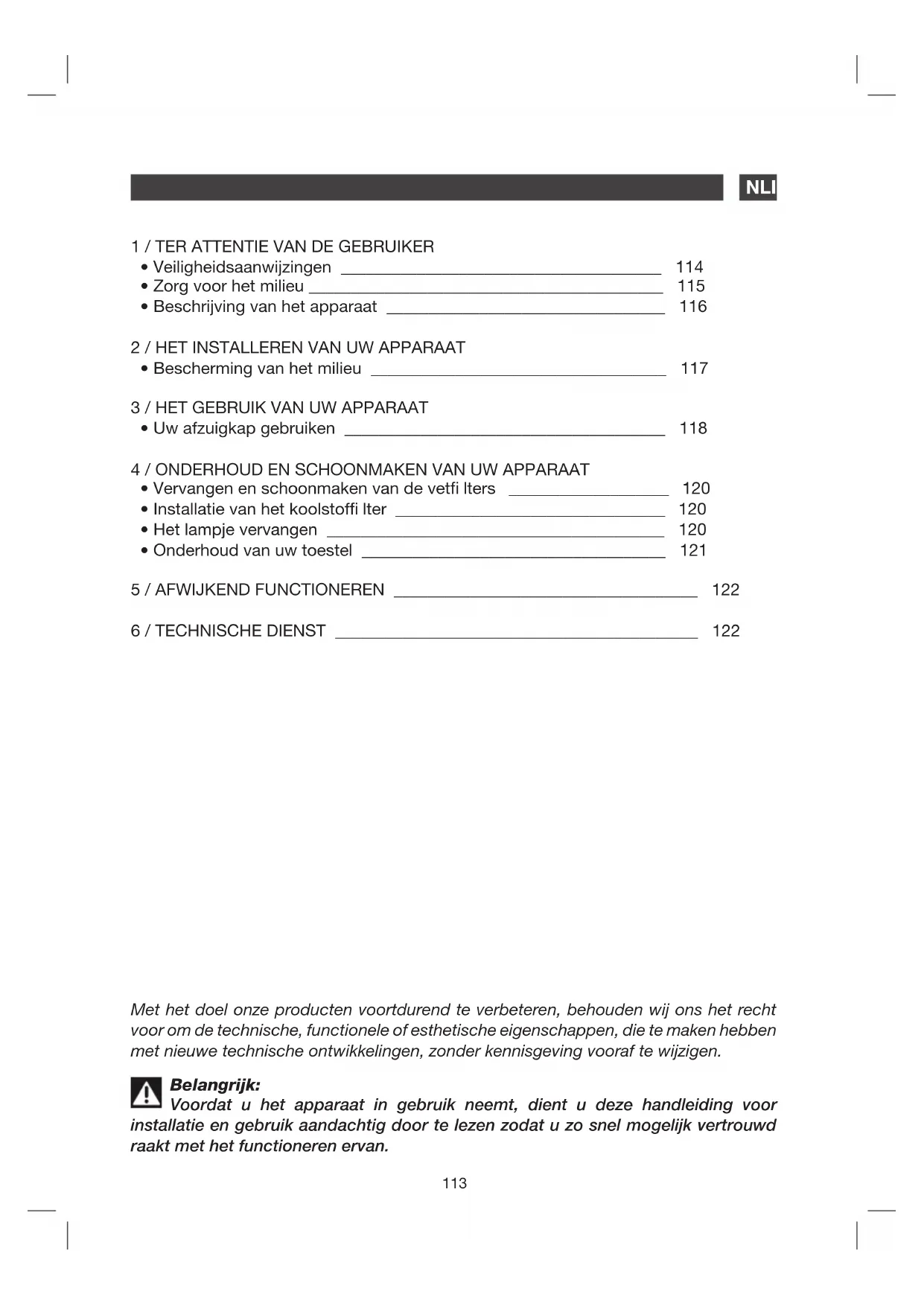 - Onderhoud van uw toestel ____________________________________ 121 5 / AFWIJKEND FUNCTIONEREN ____________________________________ 122 6 / TECHNISCHE DIENST ___________________________________________ 122 Met het doel onze producten voortdurend te verbeteren, behouden wij ons het recht voor om de technische, functionele of esthetische eigenschappen, die te maken hebben met nieuwe technische ontwikkelingen, zonder kennisgeving vooraf te wijzigen. Belangrijk: Voordat u het apparaat in gebruik neemt, dient u deze handleiding voor installatie en gebruik aandachtig door te lezen zodat u zo snel mogelijk vertrouwd raakt met het functioneren ervan.114