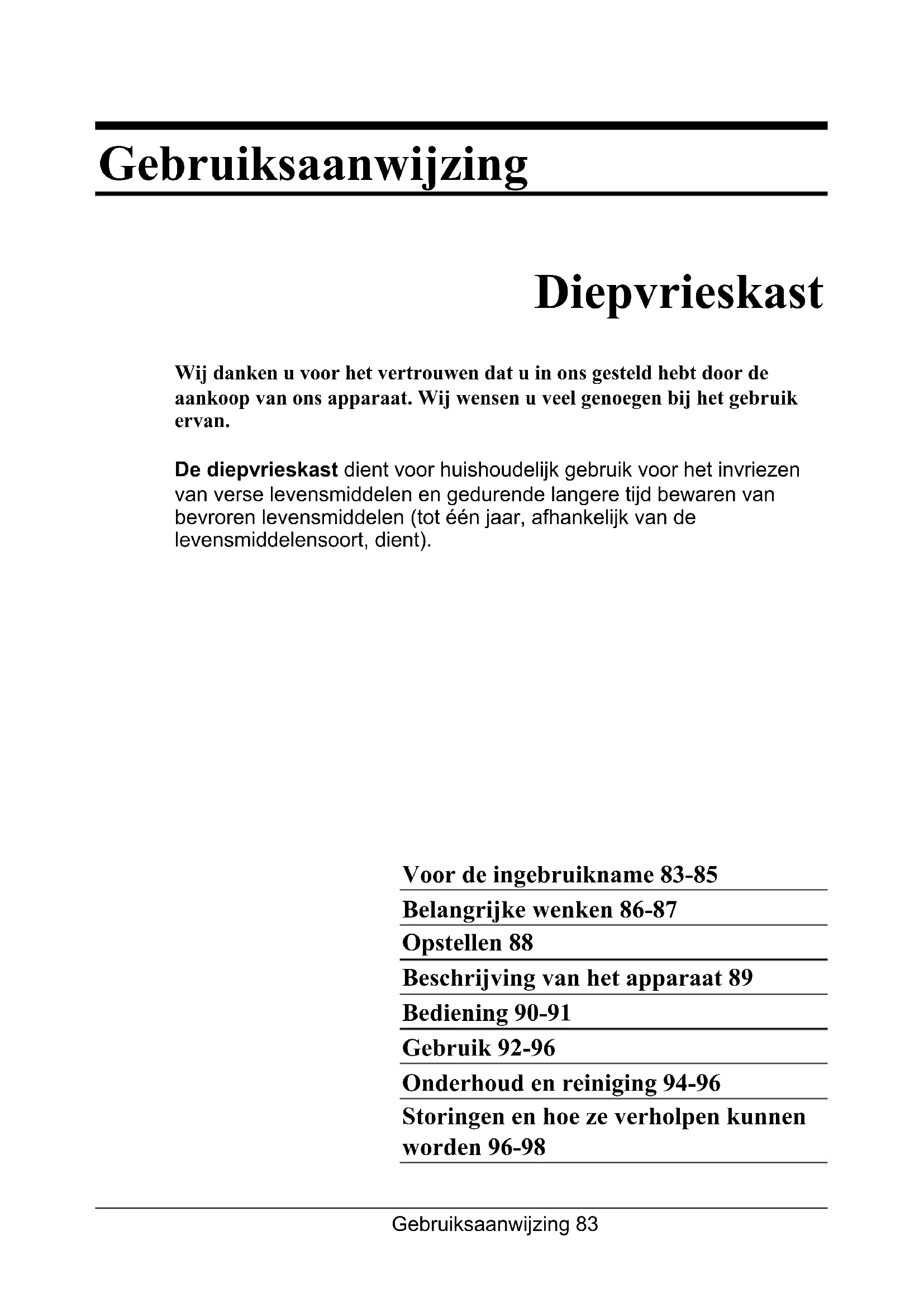 - Nach der Inbetriebsetzung des Gerätes können der Kompressorbetrieb und die Kühlflüssigkeitsströmung lauter werden. Das ist kein Fehlersignal und beeinflußt die Lebensdauer des Gerätes nicht. Allmählich vermindert sich durch den Betrieb des Gerätes die Stärke dieser Geräusche. ÄNDERUNGEN, WELCHE DIE FUNKTION DES GERÄTES NICHT BEEINFLUSSEN, BLEIBEN VORBEHALTEN.Gebruiksaanwijzing 83 Gebruiksaanwijzing Diepvrieskast Wij danken u voor het vertrouwen dat u in ons gesteld hebt door de aankoop van ons apparaat. Wij wensen u veel genoegen bij het gebruik ervan. De diepvrieskast dient voor huishoudelijk gebruik voor het invriezen van verse levensmiddelen en gedurende langere tijd bewaren van bevroren levensmiddelen (tot één jaar, afhankelijk van de levensmiddelensoort, dient). Voor de ingebruikname 83-85 Belangrijke wenken 86-87 Opstellen 88 Beschrijving van het apparaat 89 Bediening 90-91 Gebruik 92-96 Onderhoud en reiniging 94-96 Storingen en hoe ze verholpen kunnen worden 96-98Gebruiksaanwijzing84 Voor de ingebruikname
